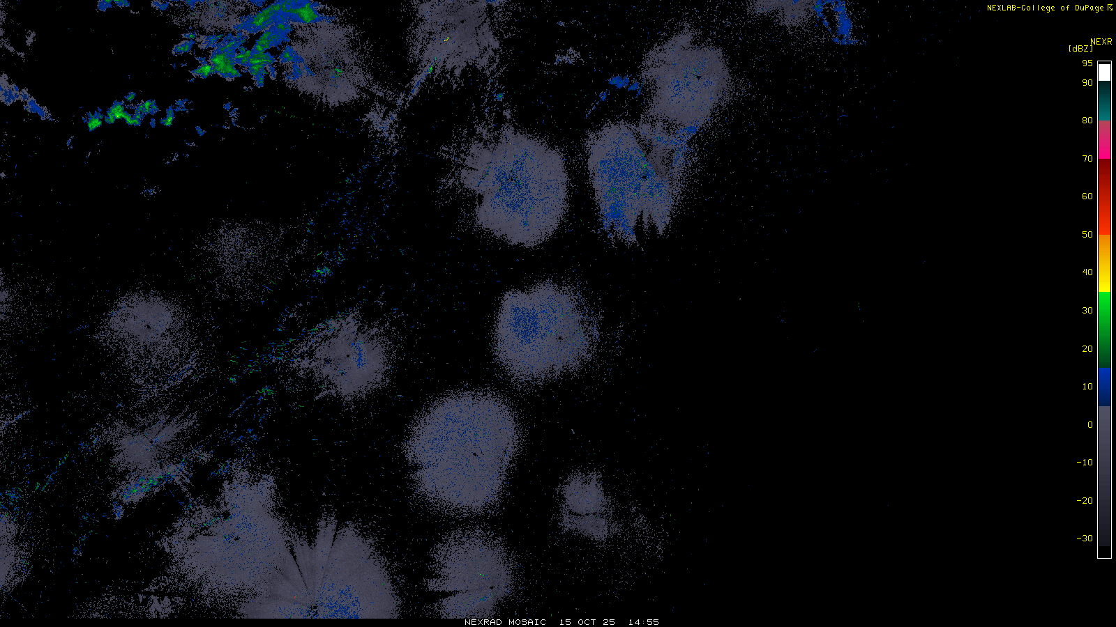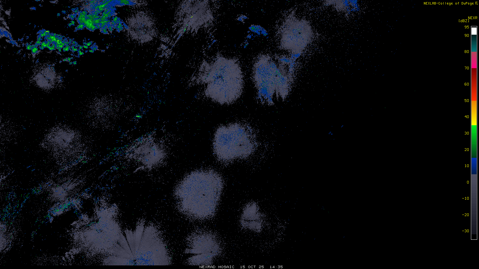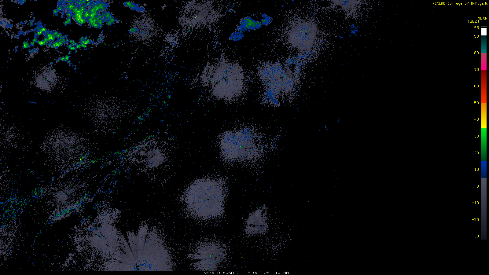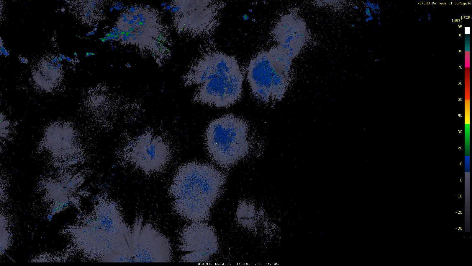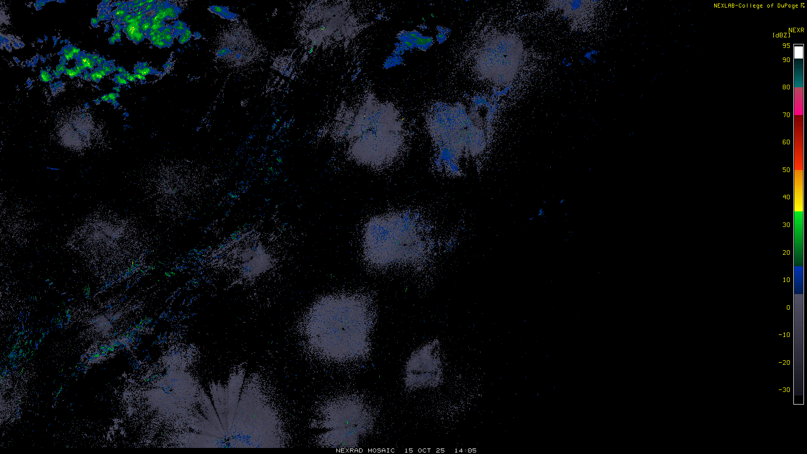 This imagery is a of composite stitch of NEXRAD base reflectivity data from individual sites across the domain of the satellite sector currently being viewed. For further details about the base reflectivity product, see the Product Description for any Base Reflectivity product on our NEXRAD page.