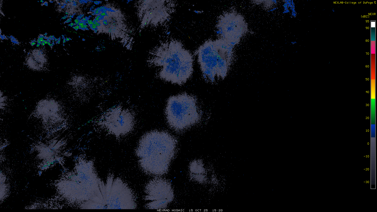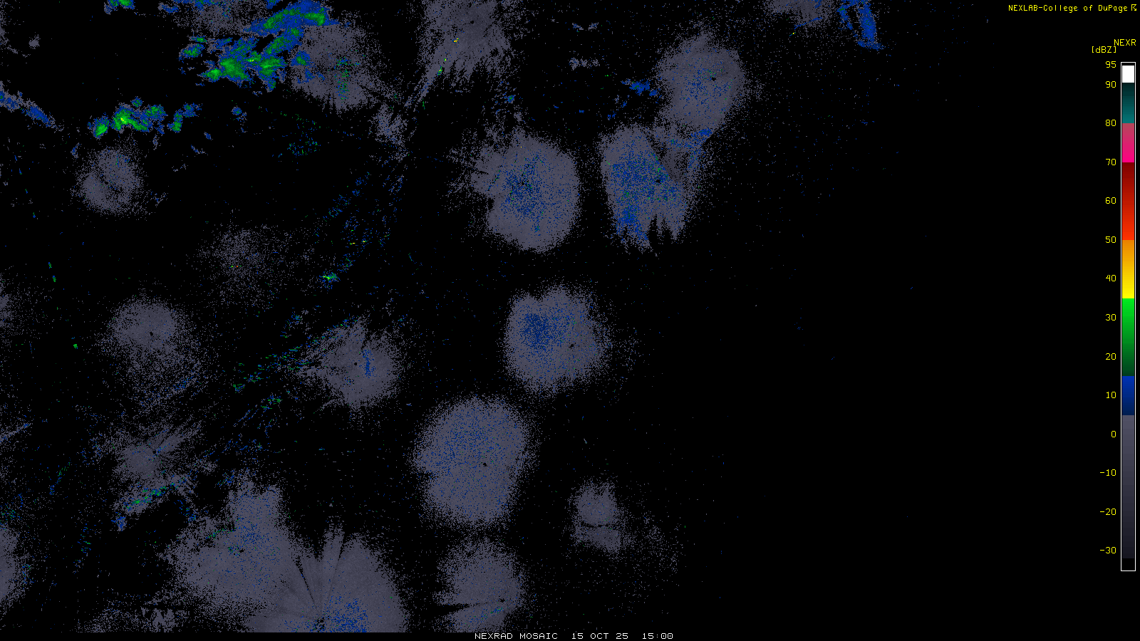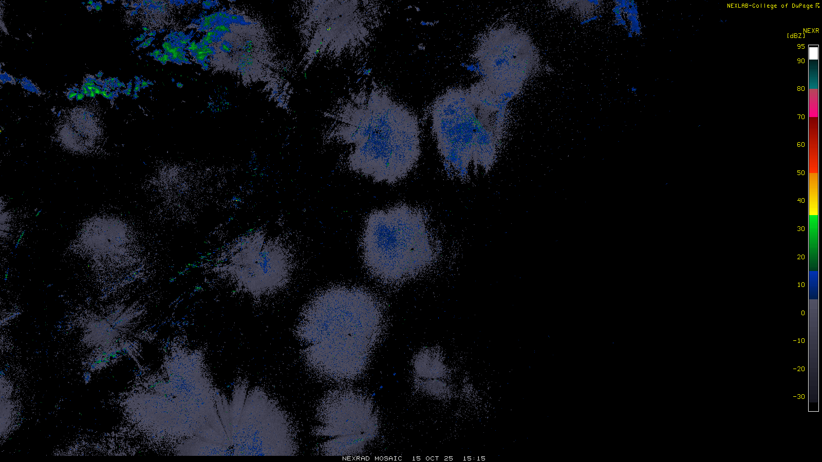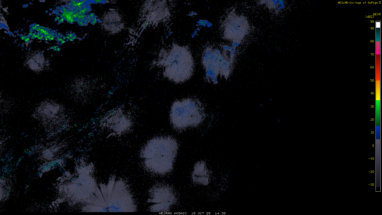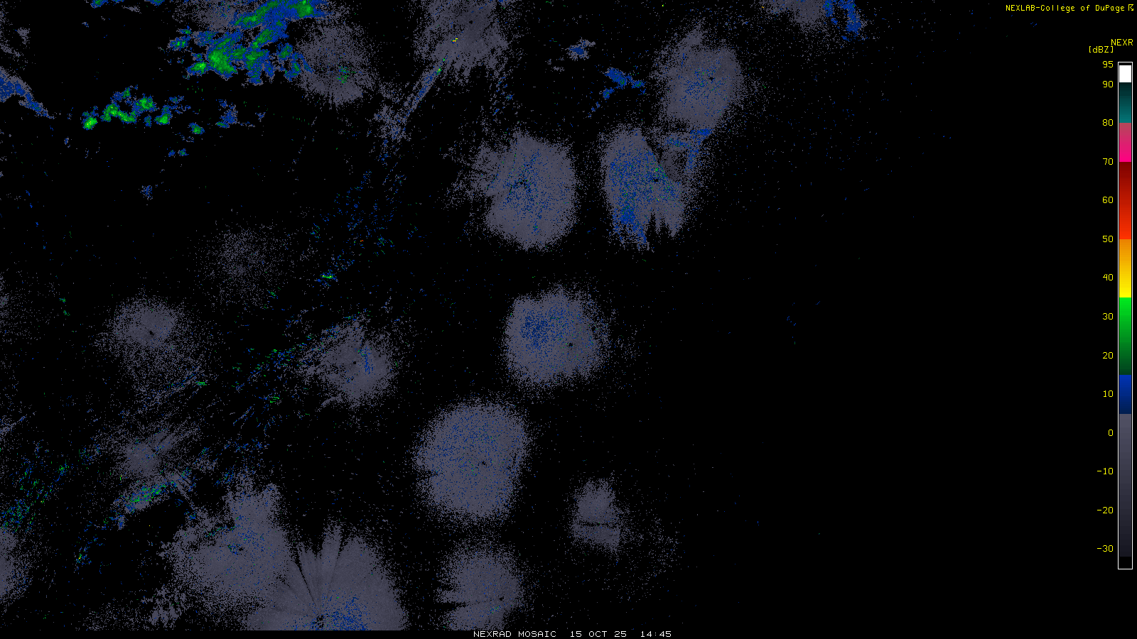 This imagery is a of composite stitch of NEXRAD base reflectivity data from individual sites across the domain of the satellite sector currently being viewed. For further details about the base reflectivity product, see the Product Description for any Base Reflectivity product on our NEXRAD page.