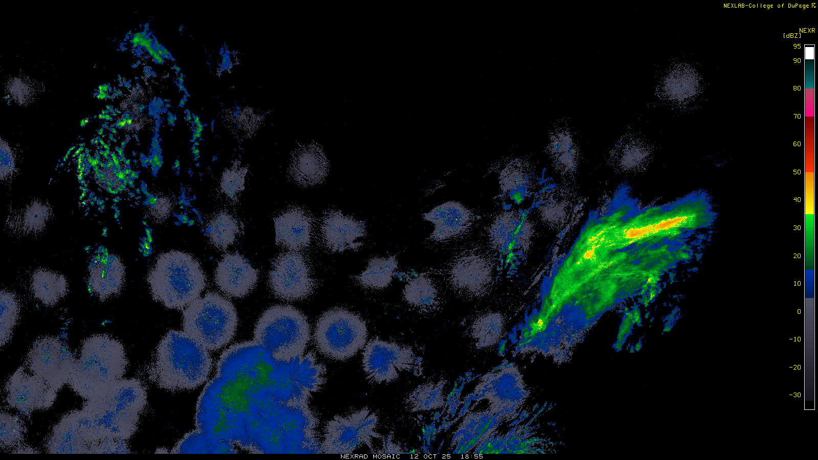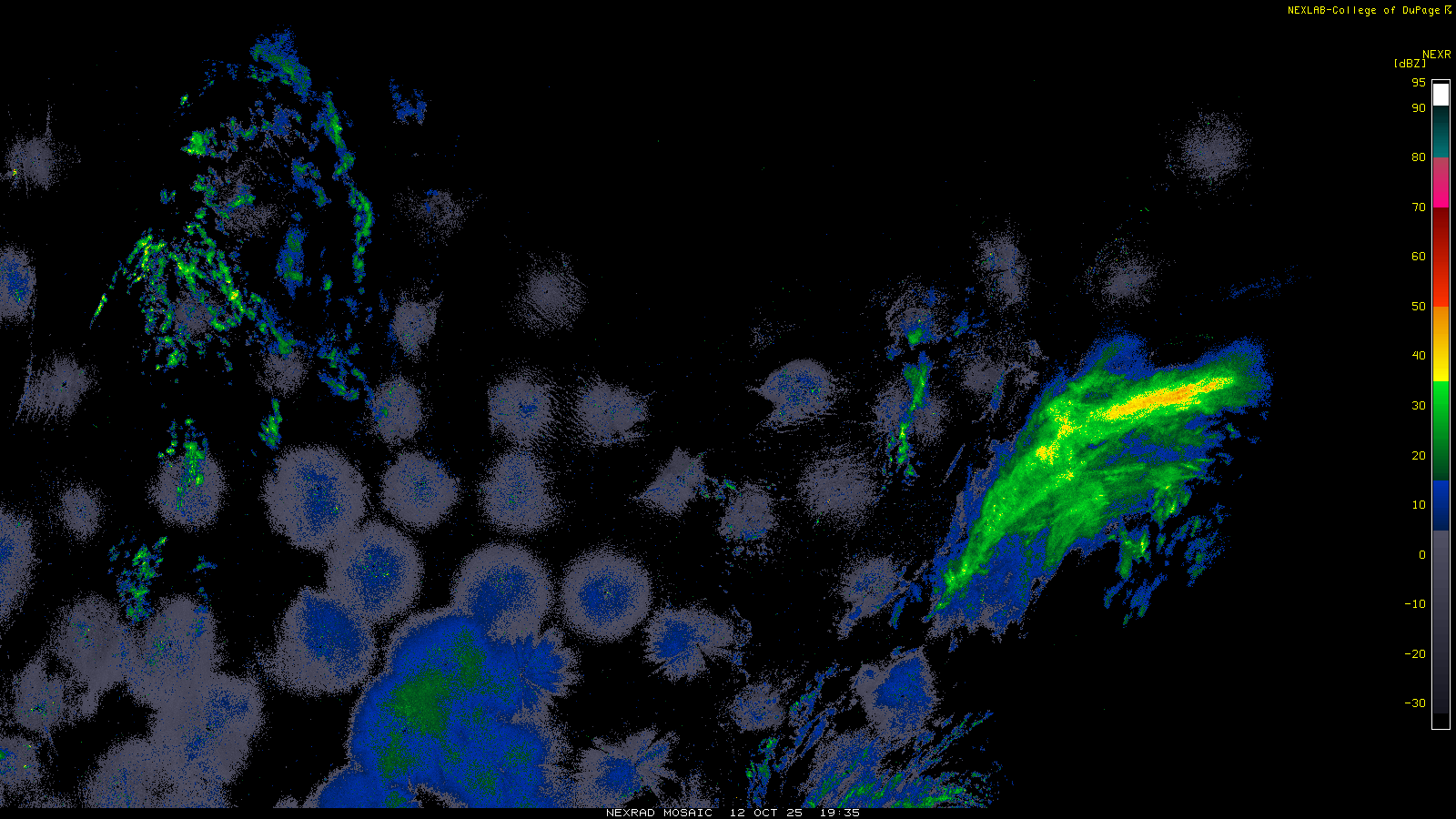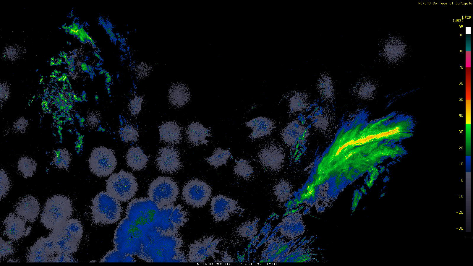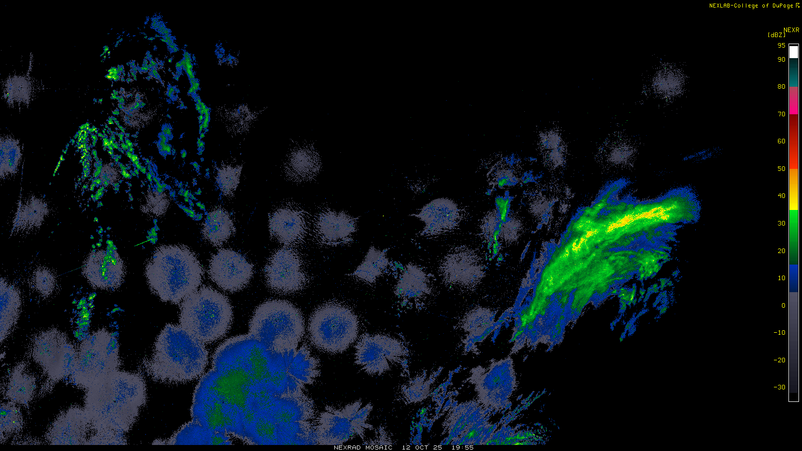 This imagery is a of composite stitch of NEXRAD base reflectivity data from individual sites across the domain of the satellite sector currently being viewed. For further details about the base reflectivity product, see the Product Description for any Base Reflectivity product on our NEXRAD page.