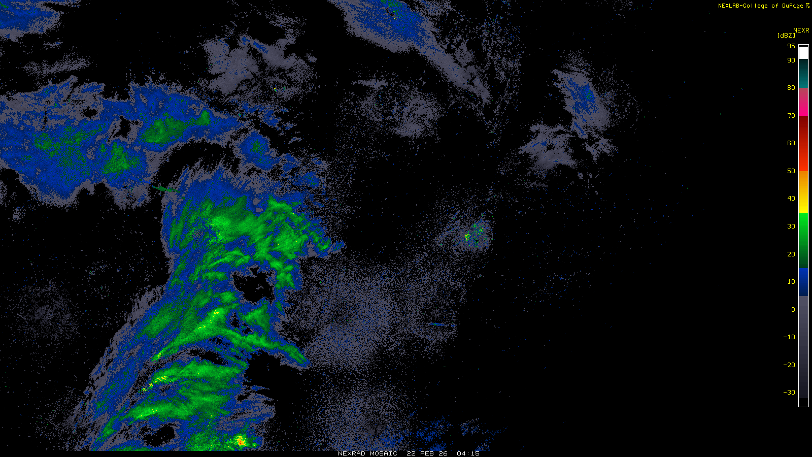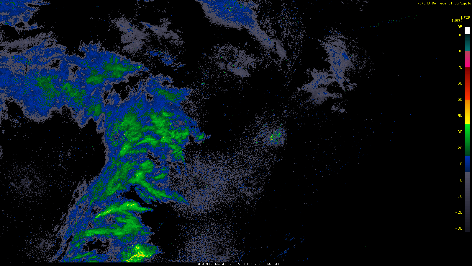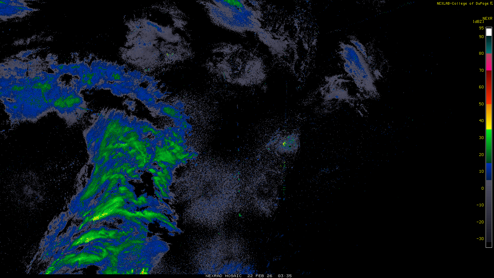 This imagery is a of composite stitch of NEXRAD base reflectivity data from individual sites across the domain of the satellite sector currently being viewed. For further details about the base reflectivity product, see the Product Description for any Base Reflectivity product on our NEXRAD page.
