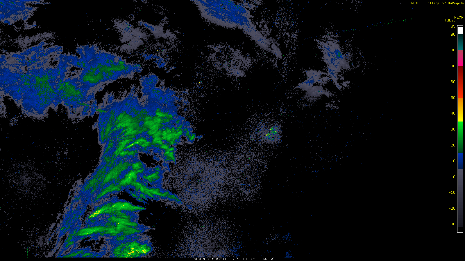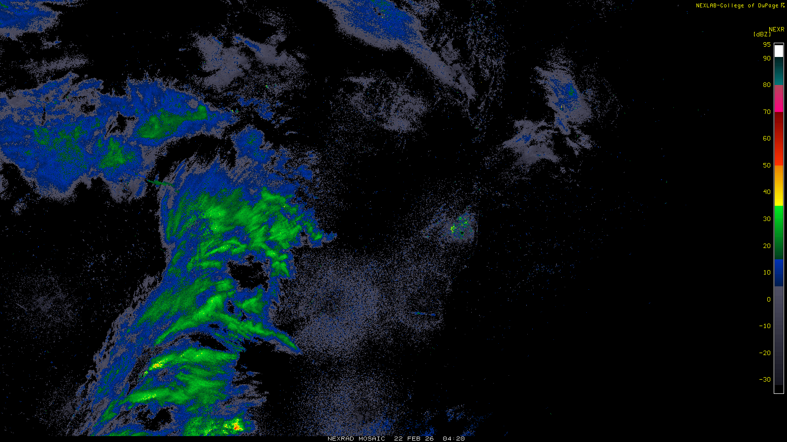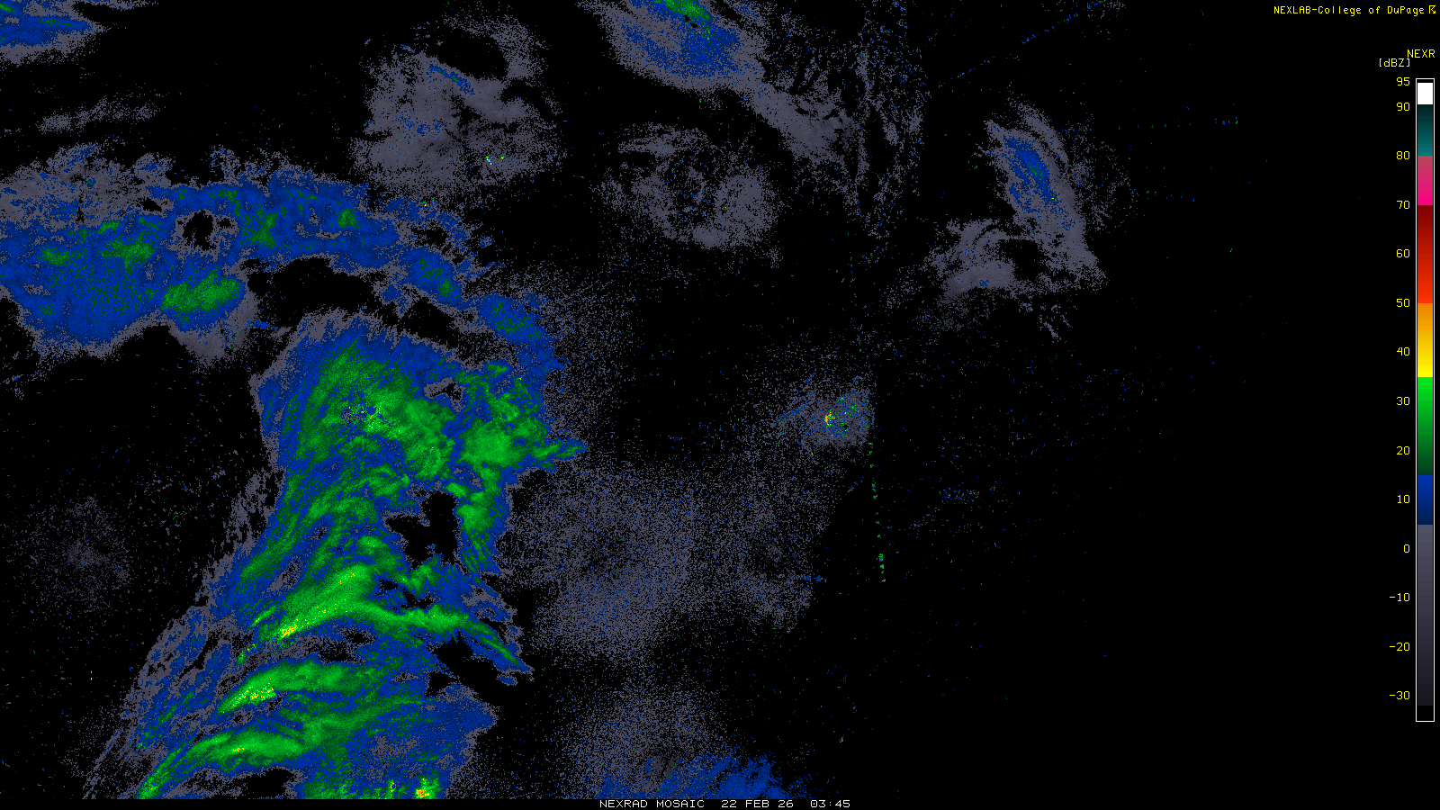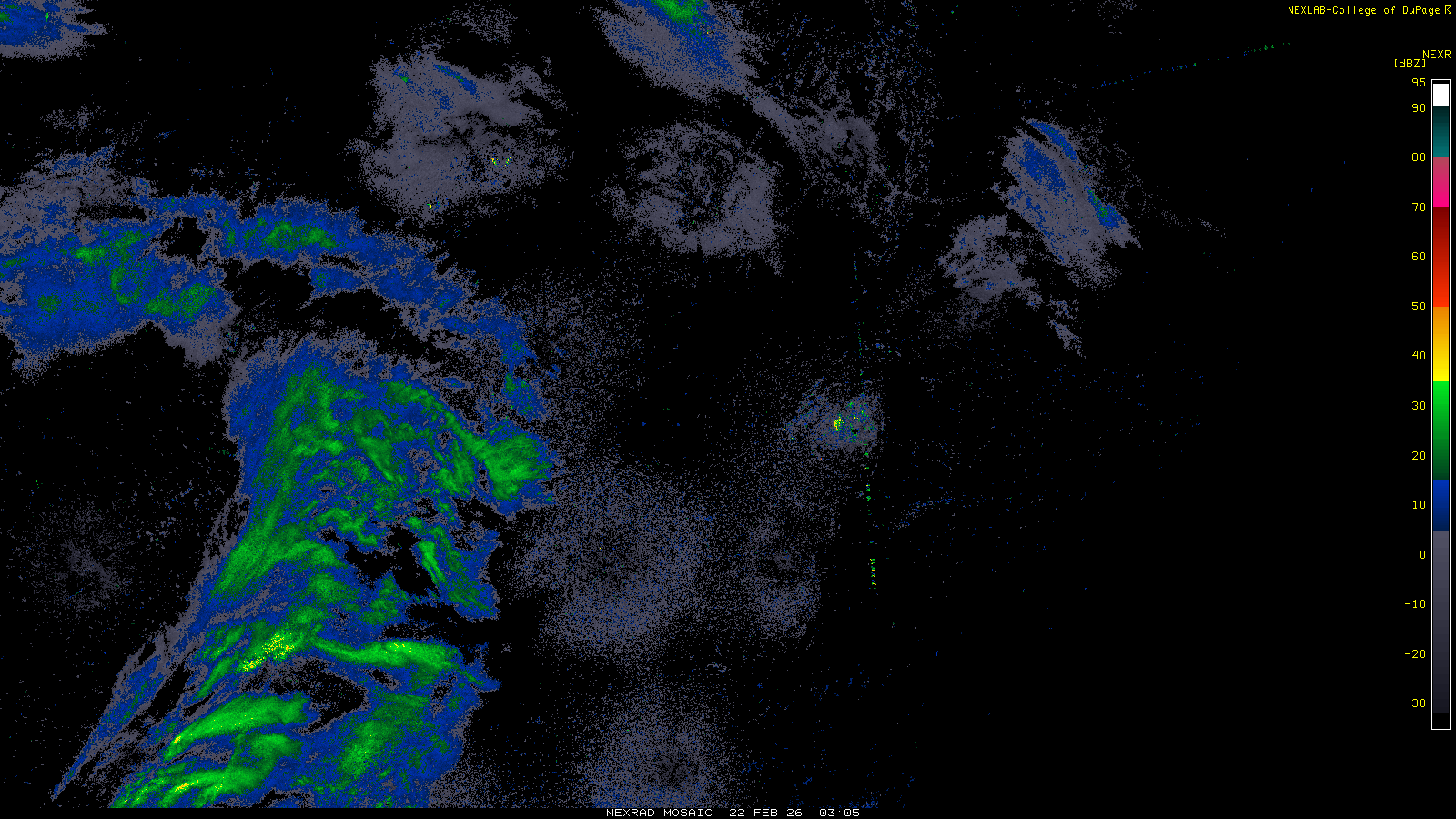 This imagery is a of composite stitch of NEXRAD base reflectivity data from individual sites across the domain of the satellite sector currently being viewed. For further details about the base reflectivity product, see the Product Description for any Base Reflectivity product on our NEXRAD page.