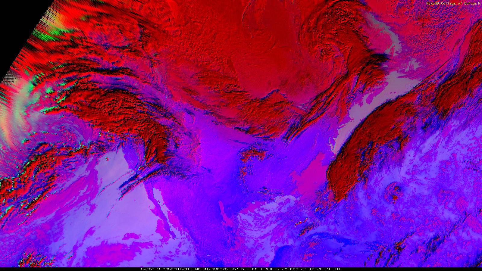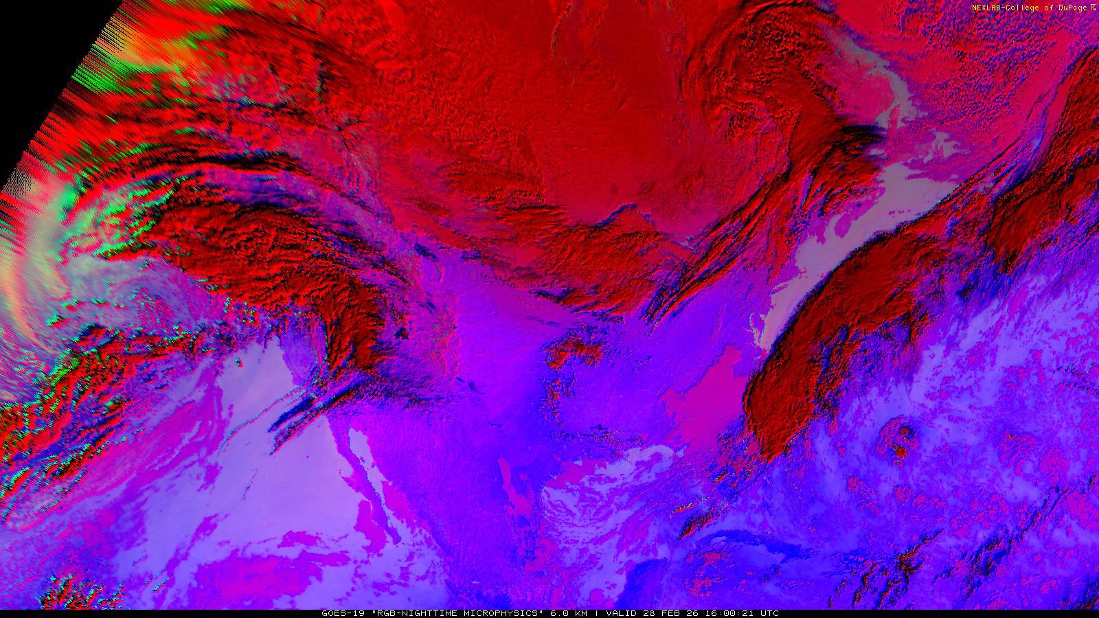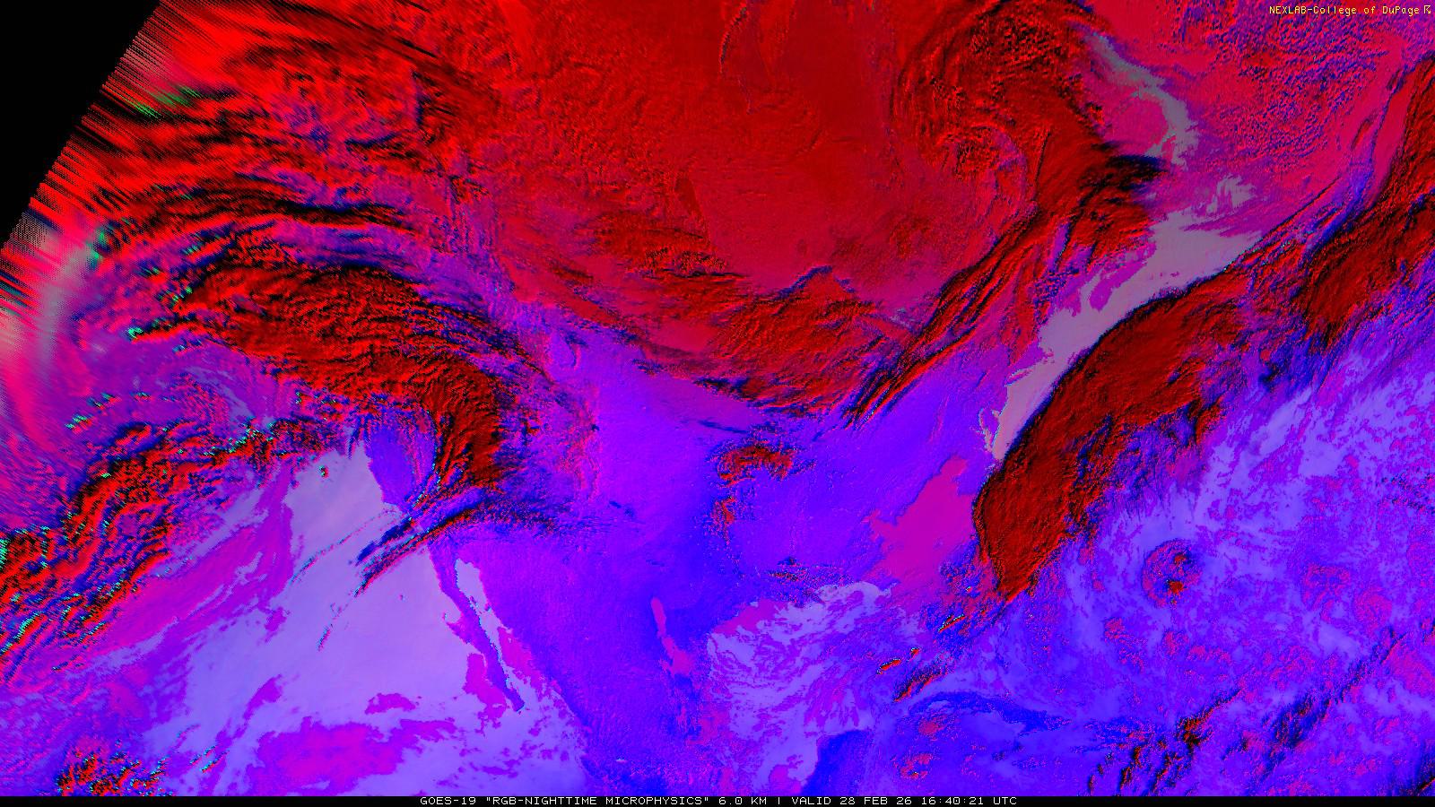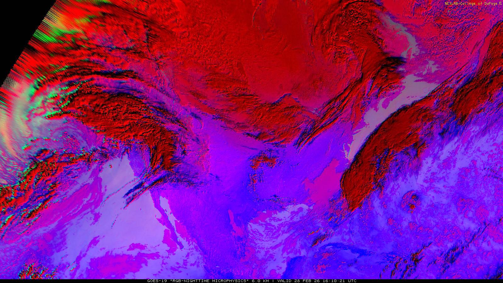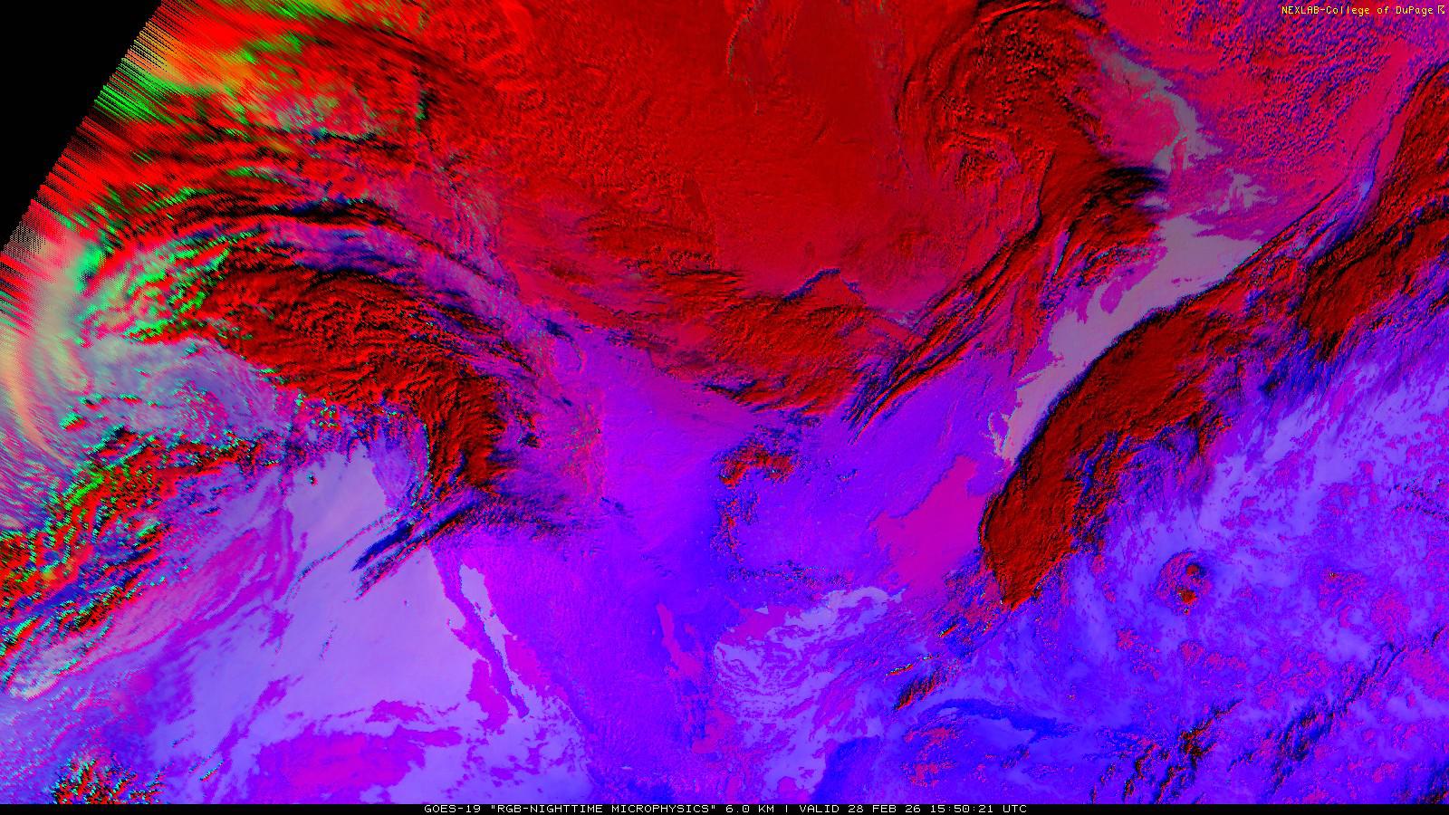 The RGB Nighttime Microphysics product is a combination of three different infrared bands. It is useful for discriminating between different cloud types, especially between low stratus clouds and fog. The ‘Red’ channel is a difference of ABI bands 15 and 13, while 'Green' is a difference of bands 13 and 7, and 'Blue' is solely being represented by ABI band 13. This product is only truly useful during the nighttime when it is dark because of the influence solar reflectance has on band 7.