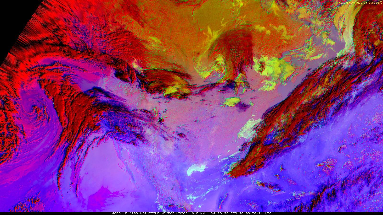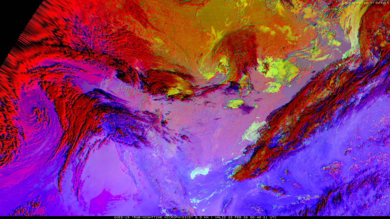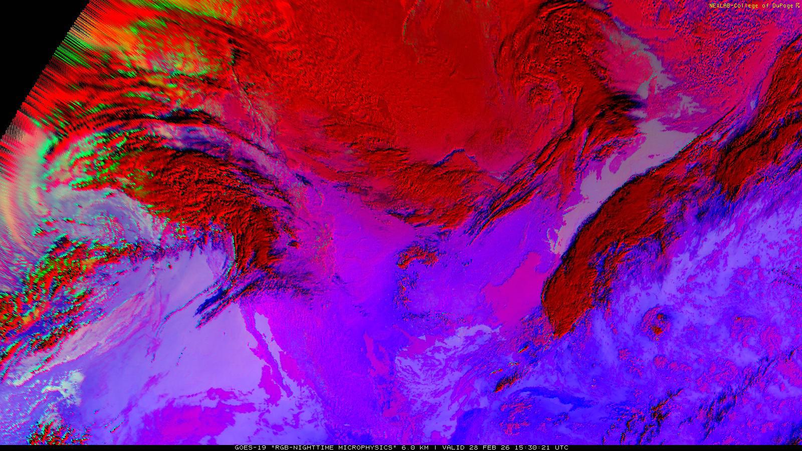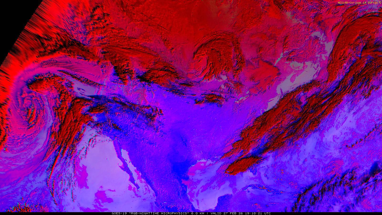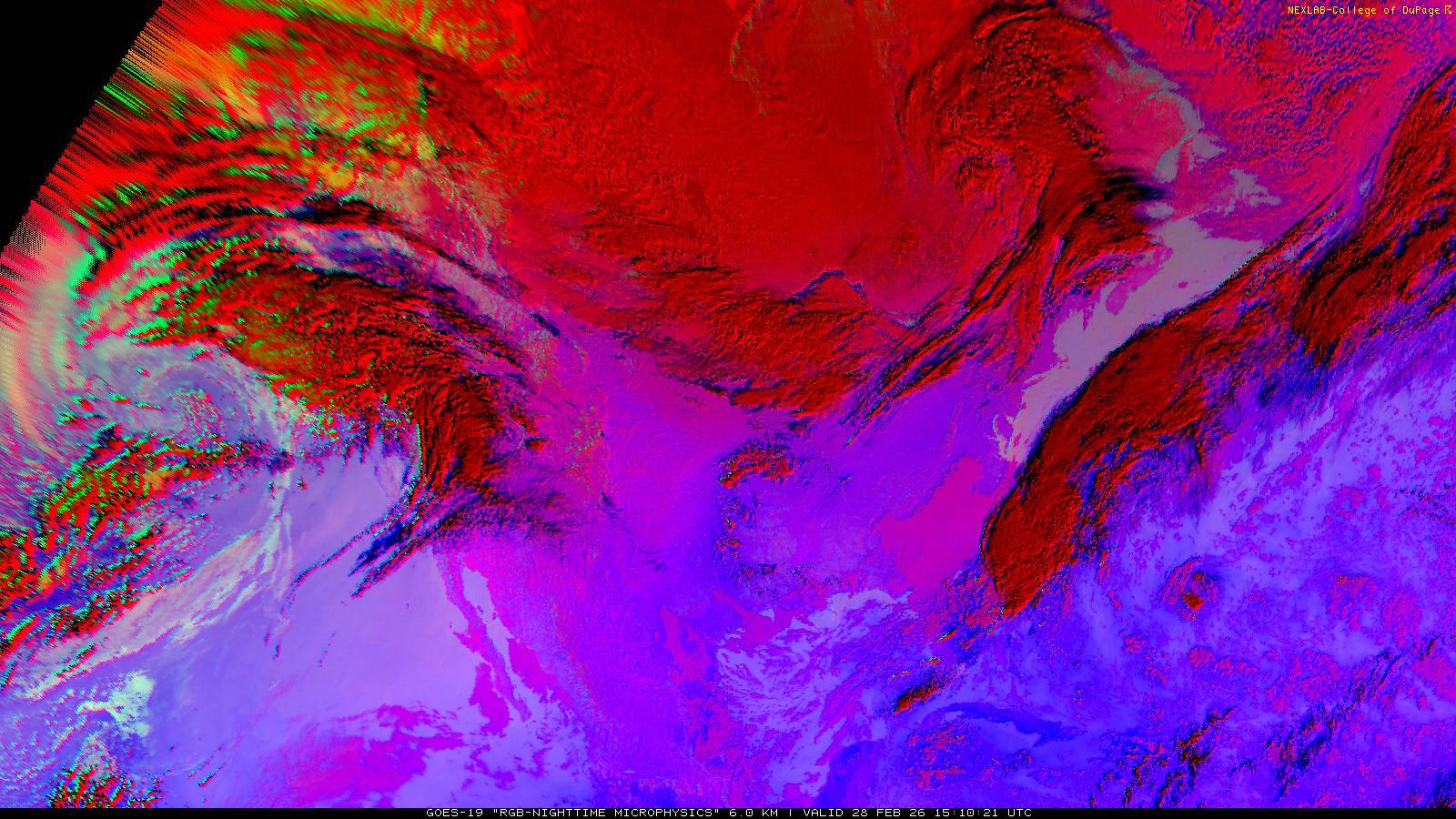 The RGB Nighttime Microphysics product is a combination of three different infrared bands. It is useful for discriminating between different cloud types, especially between low stratus clouds and fog. The ‘Red’ channel is a difference of ABI bands 15 and 13, while 'Green' is a difference of bands 13 and 7, and 'Blue' is solely being represented by ABI band 13. This product is only truly useful during the nighttime when it is dark because of the influence solar reflectance has on band 7.