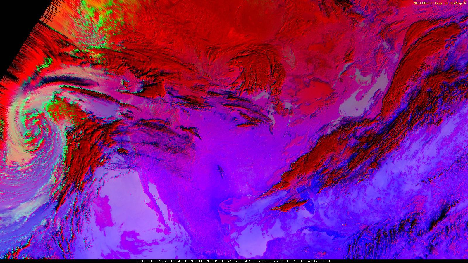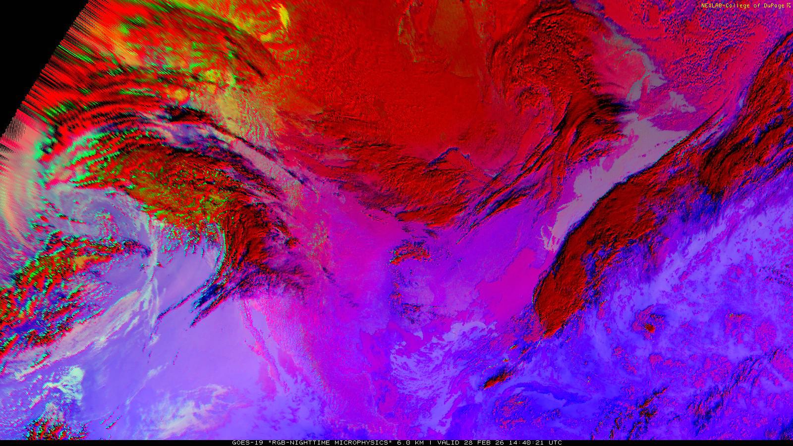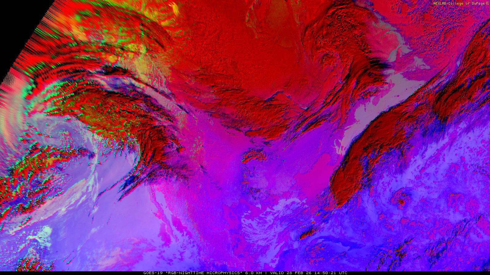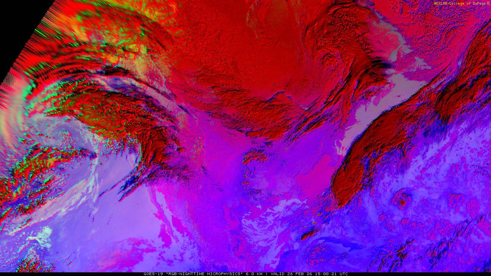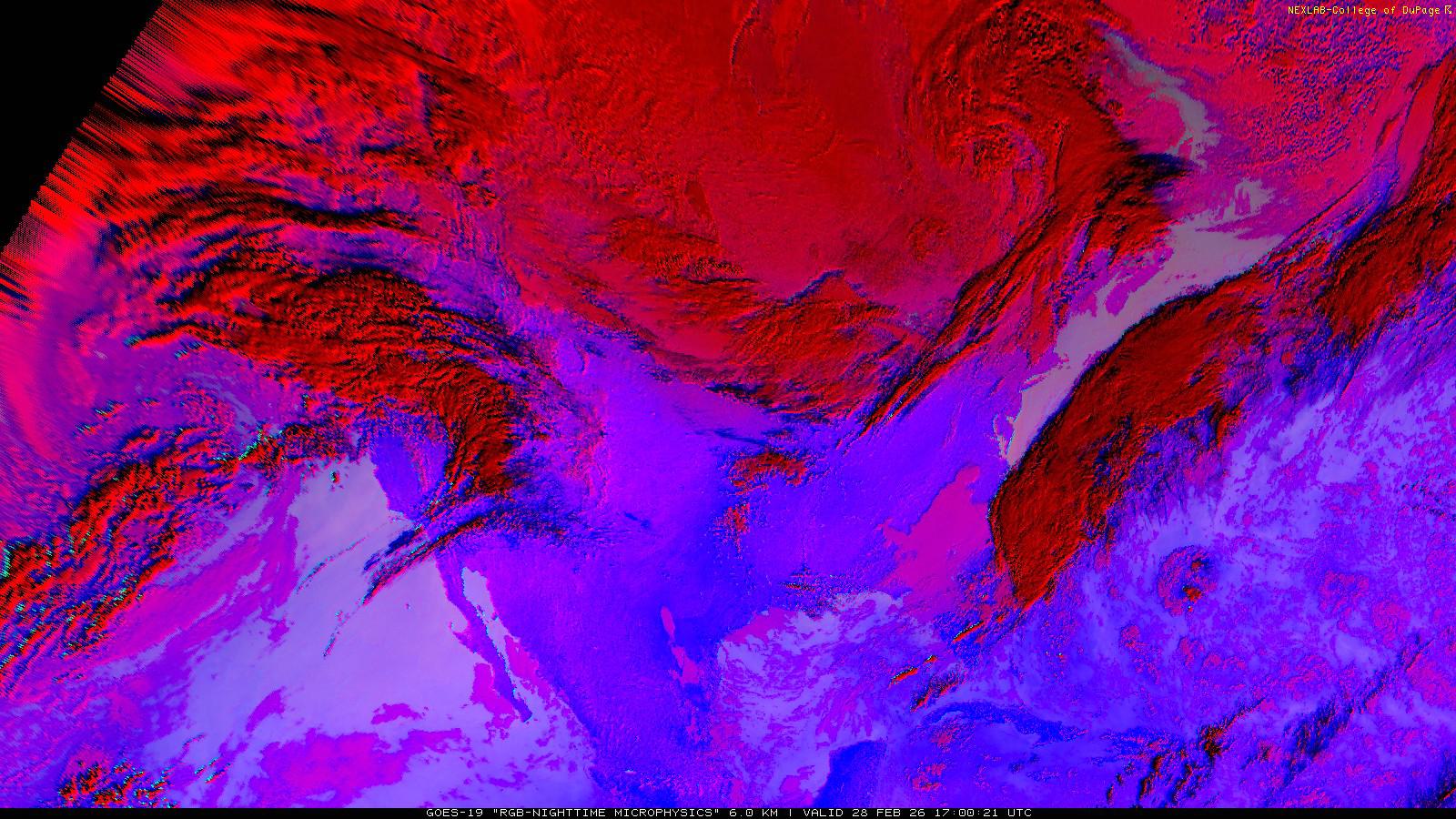 The RGB Nighttime Microphysics product is a combination of three different infrared bands. It is useful for discriminating between different cloud types, especially between low stratus clouds and fog. The ‘Red’ channel is a difference of ABI bands 15 and 13, while 'Green' is a difference of bands 13 and 7, and 'Blue' is solely being represented by ABI band 13. This product is only truly useful during the nighttime when it is dark because of the influence solar reflectance has on band 7.
