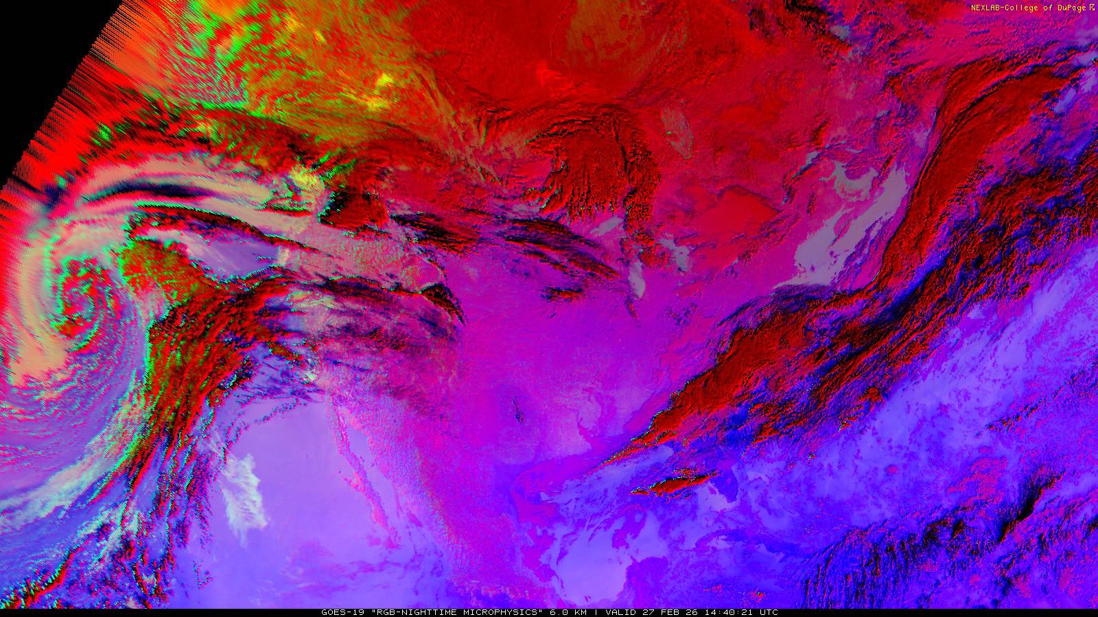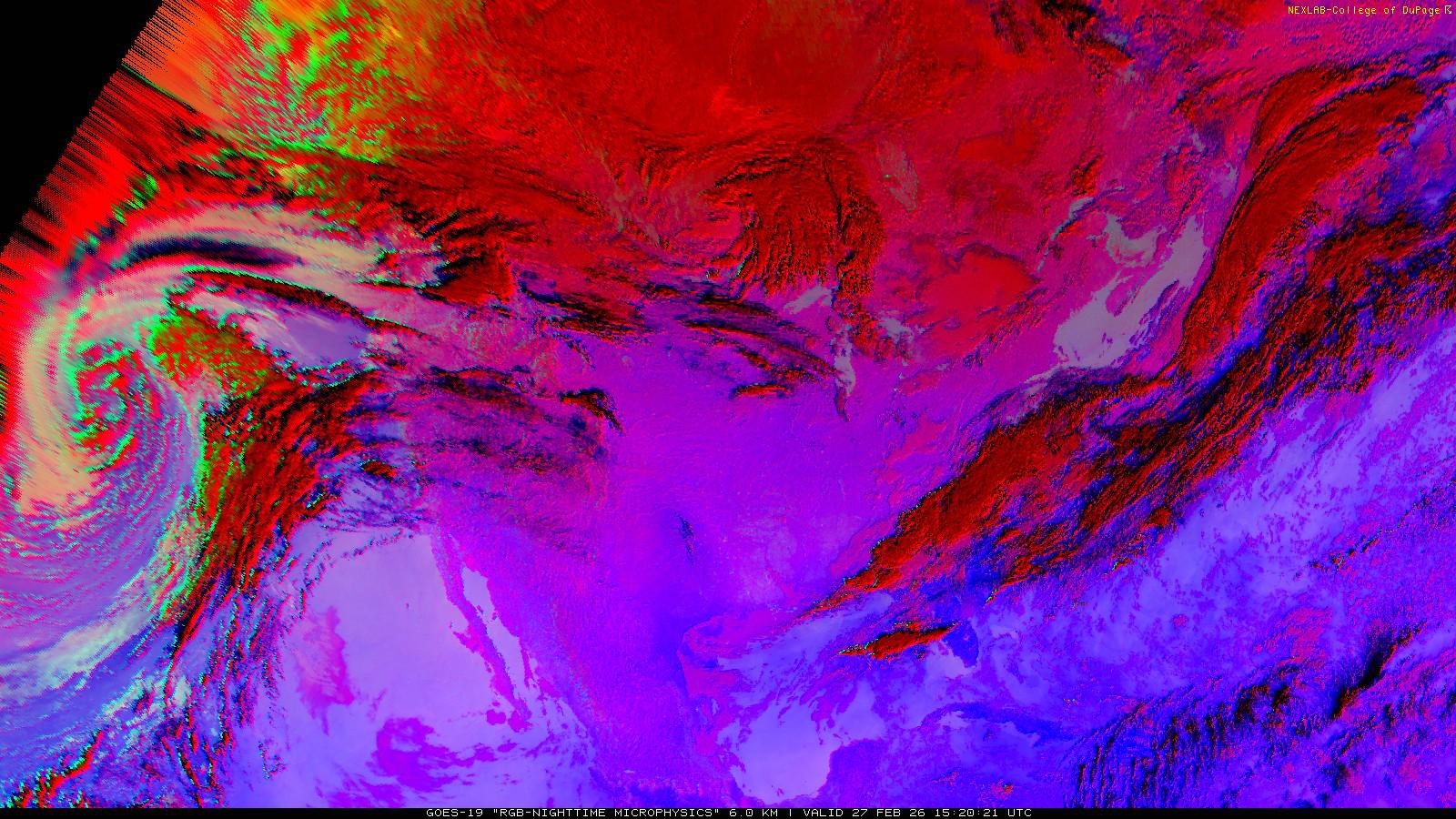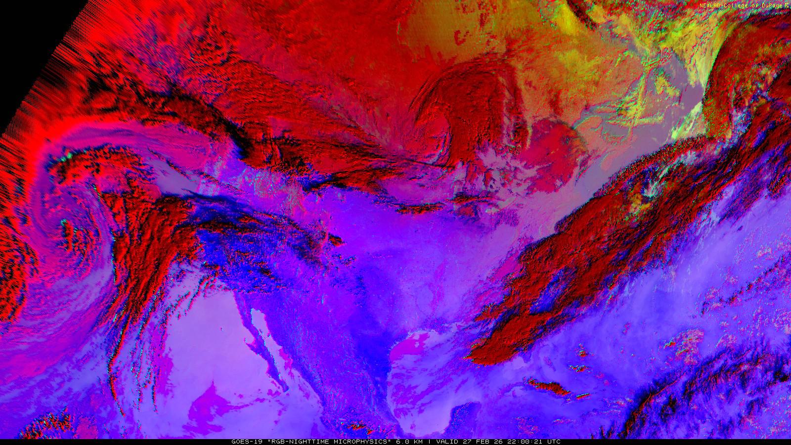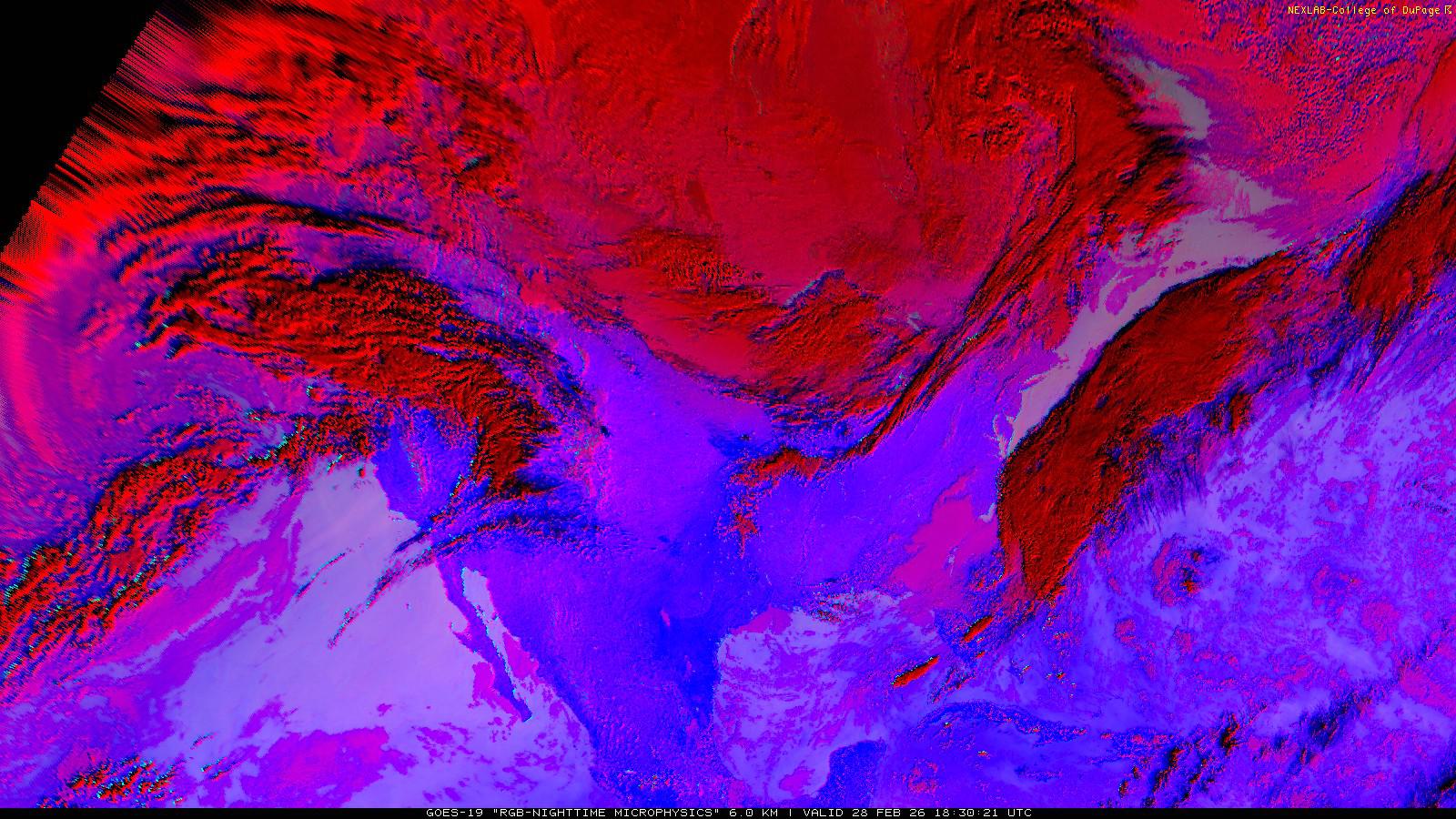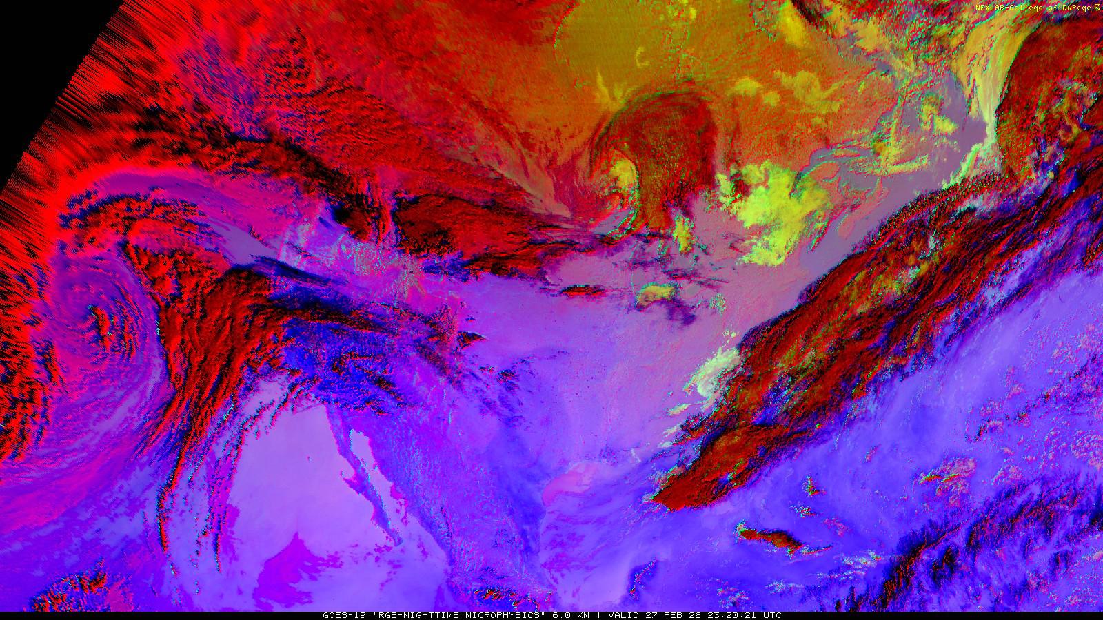 The RGB Nighttime Microphysics product is a combination of three different infrared bands. It is useful for discriminating between different cloud types, especially between low stratus clouds and fog. The ‘Red’ channel is a difference of ABI bands 15 and 13, while 'Green' is a difference of bands 13 and 7, and 'Blue' is solely being represented by ABI band 13. This product is only truly useful during the nighttime when it is dark because of the influence solar reflectance has on band 7.