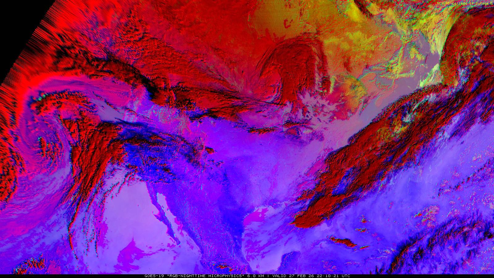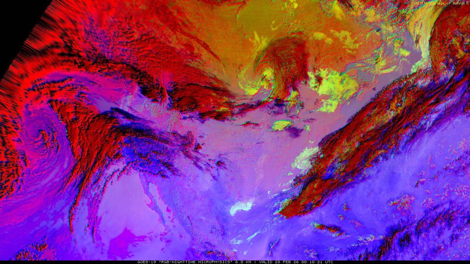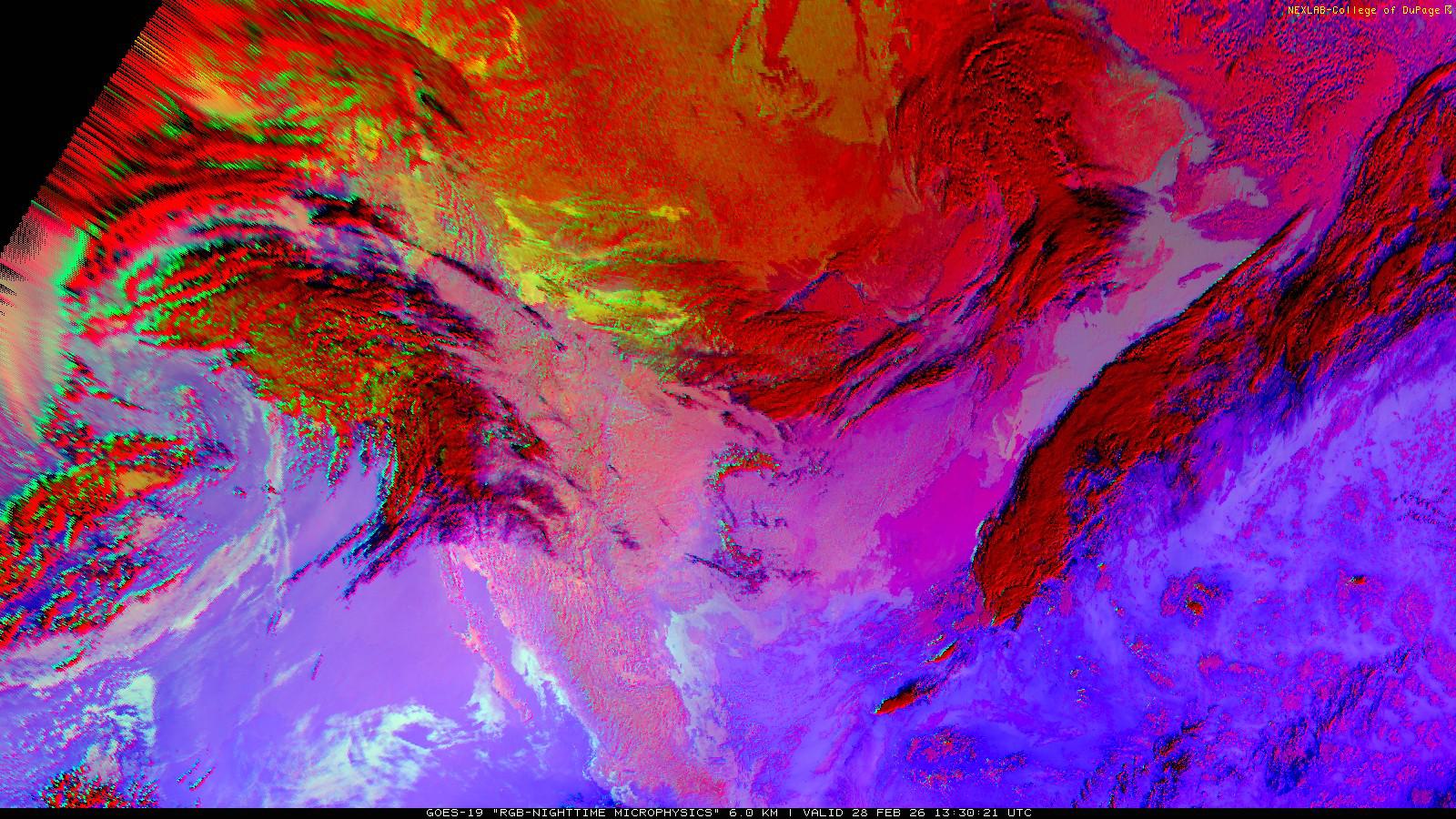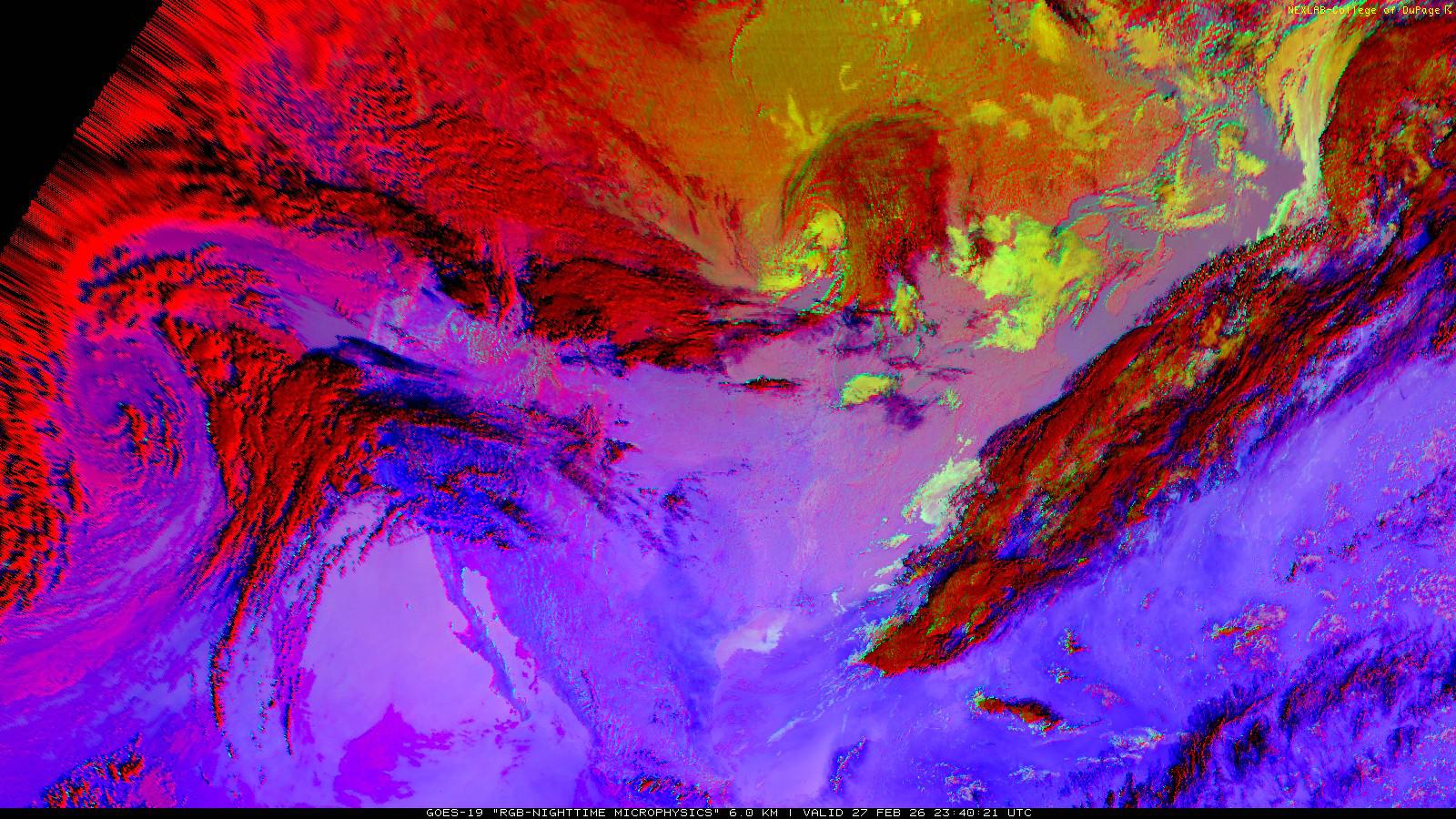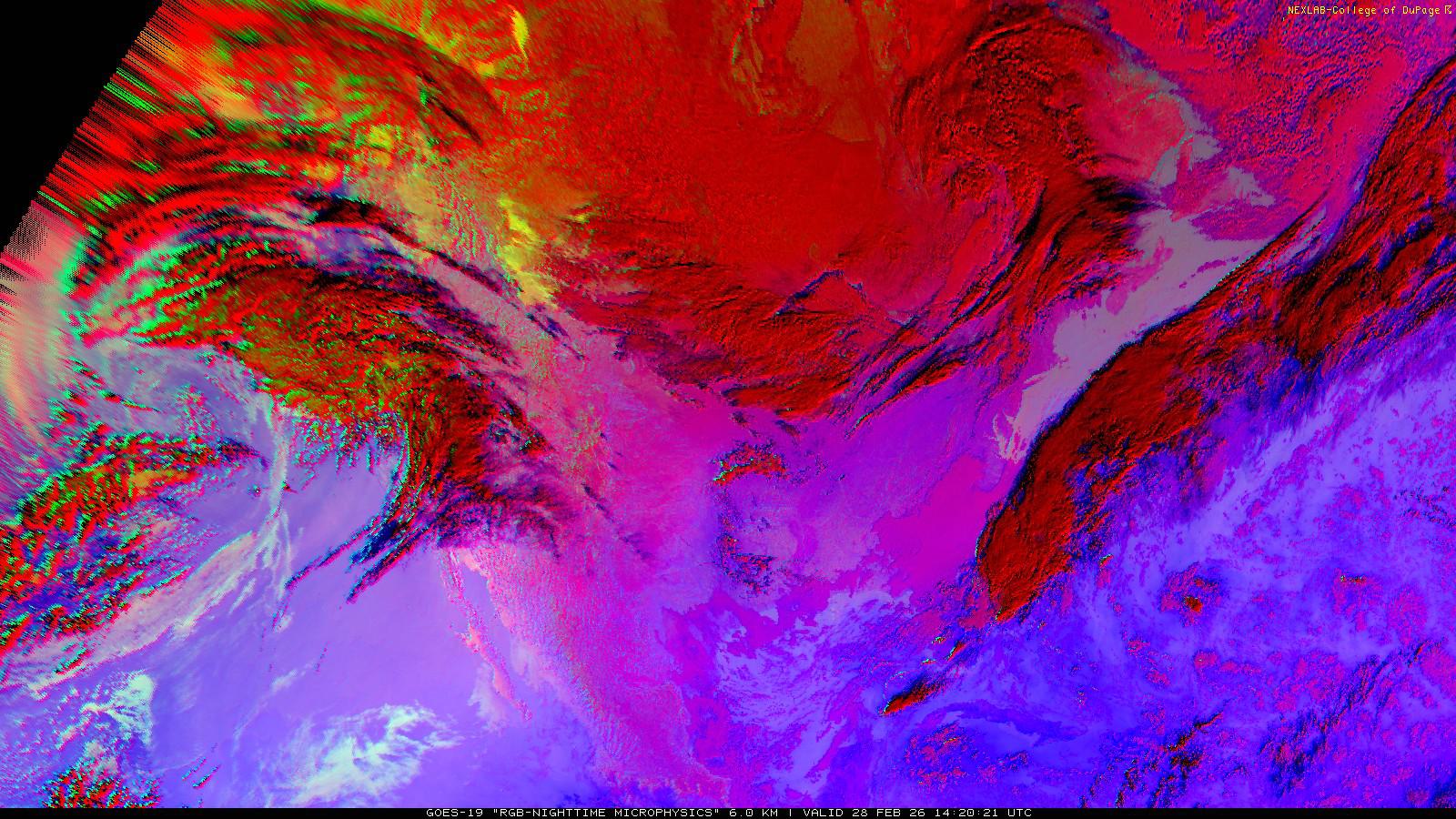 The RGB Nighttime Microphysics product is a combination of three different infrared bands. It is useful for discriminating between different cloud types, especially between low stratus clouds and fog. The ‘Red’ channel is a difference of ABI bands 15 and 13, while 'Green' is a difference of bands 13 and 7, and 'Blue' is solely being represented by ABI band 13. This product is only truly useful during the nighttime when it is dark because of the influence solar reflectance has on band 7.