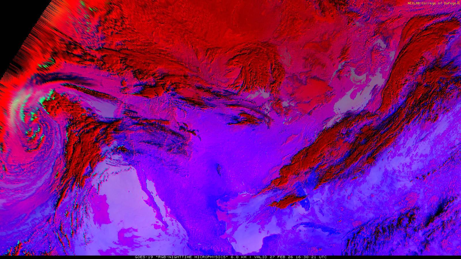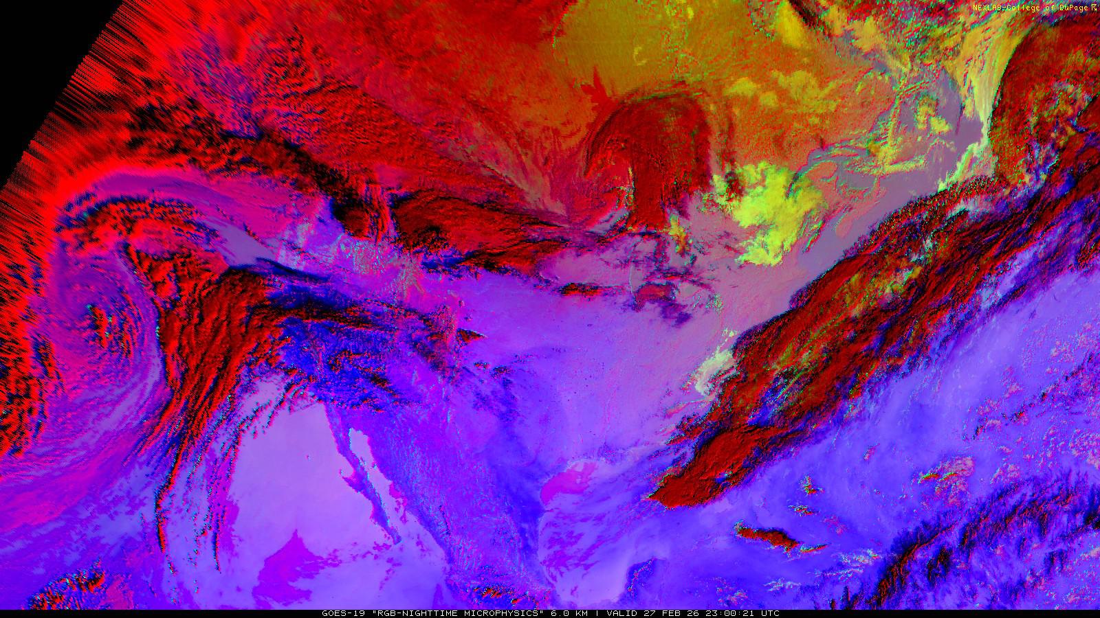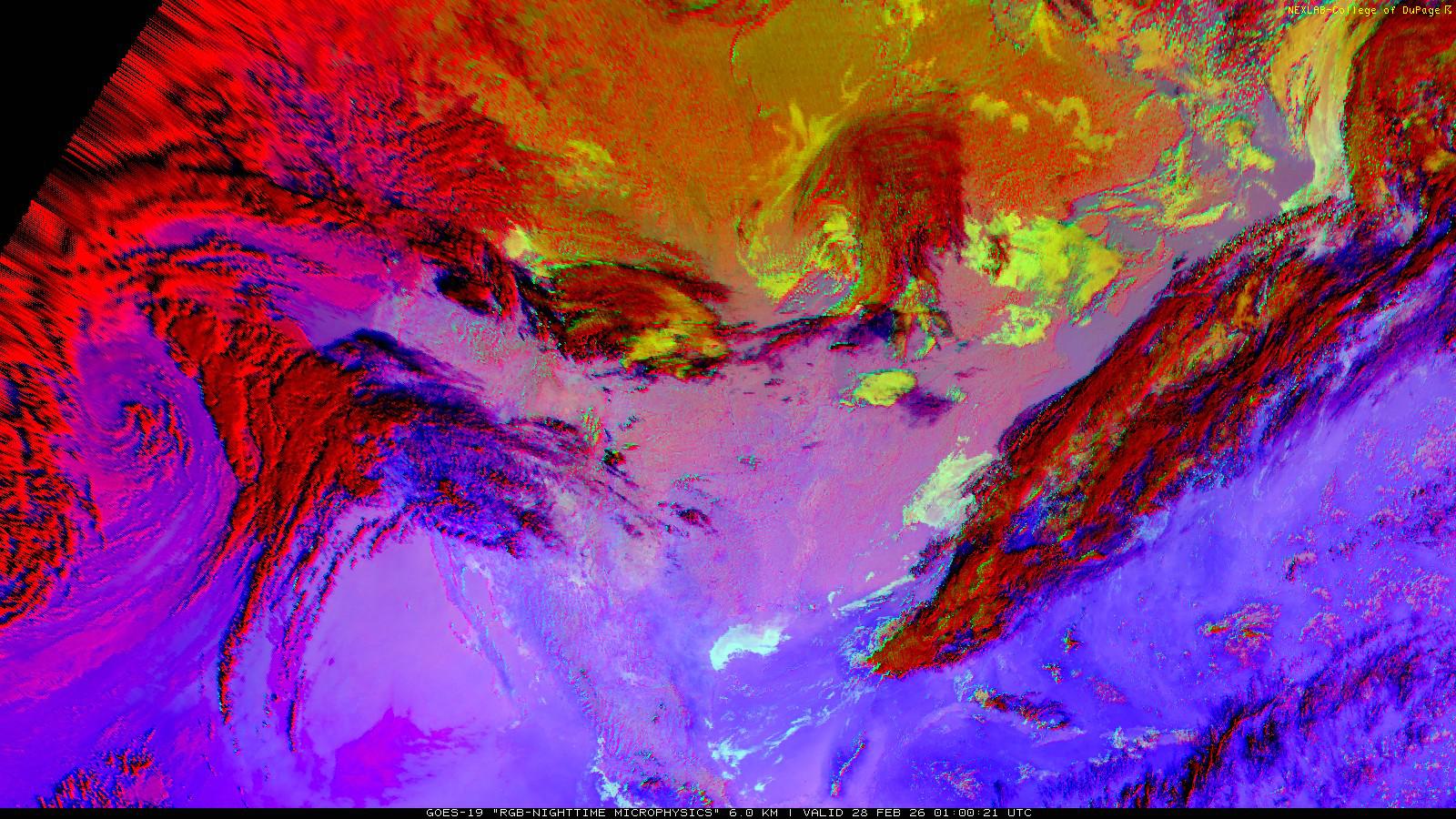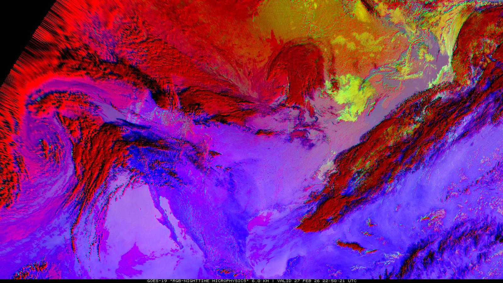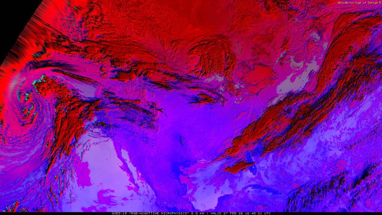 The RGB Nighttime Microphysics product is a combination of three different infrared bands. It is useful for discriminating between different cloud types, especially between low stratus clouds and fog. The ‘Red’ channel is a difference of ABI bands 15 and 13, while 'Green' is a difference of bands 13 and 7, and 'Blue' is solely being represented by ABI band 13. This product is only truly useful during the nighttime when it is dark because of the influence solar reflectance has on band 7.