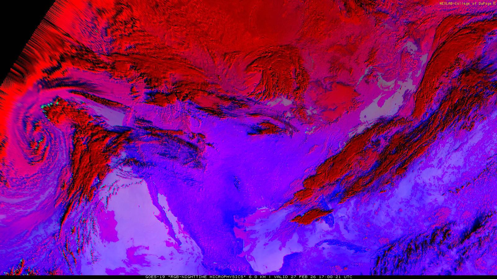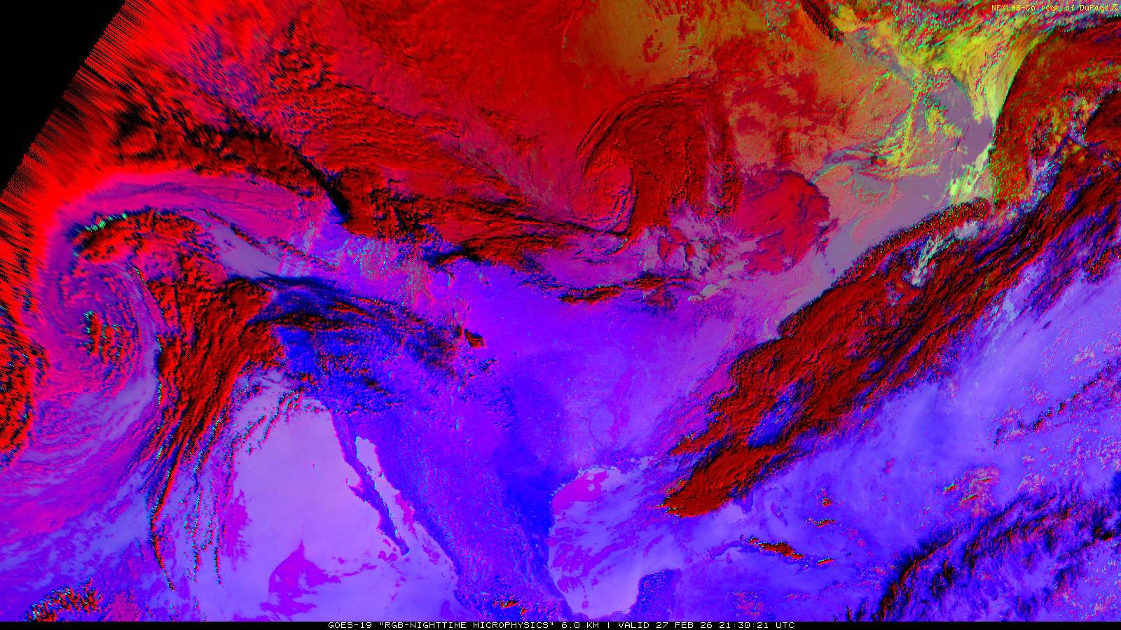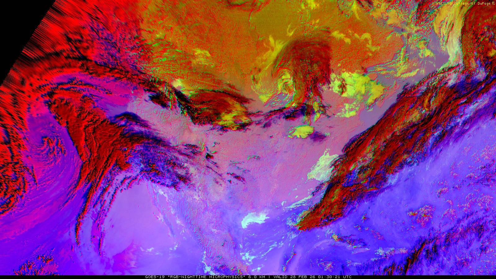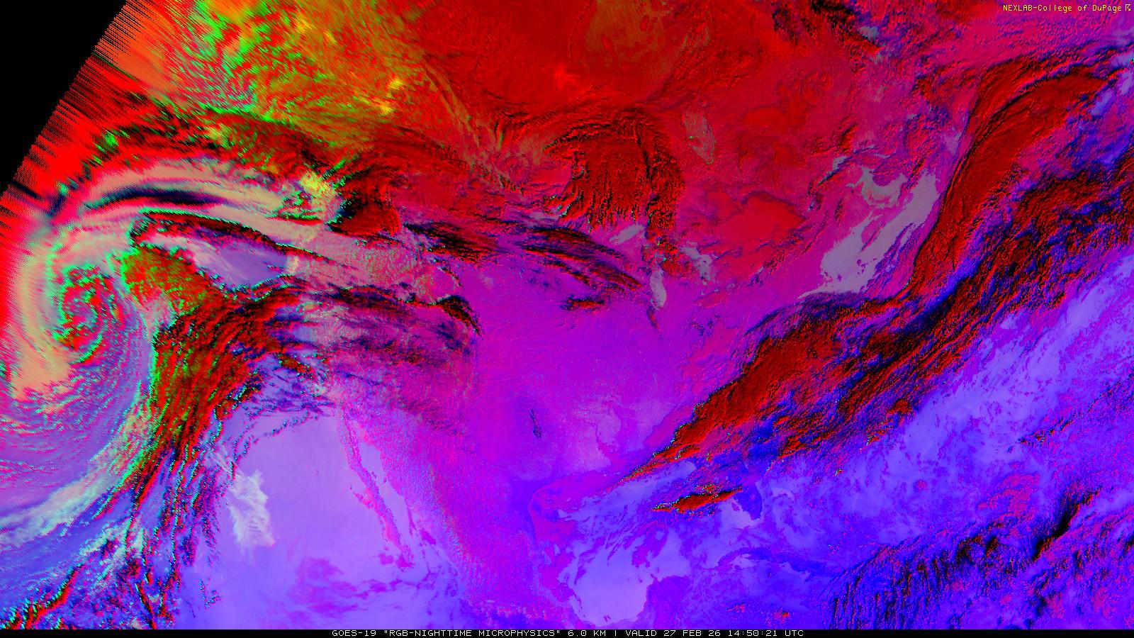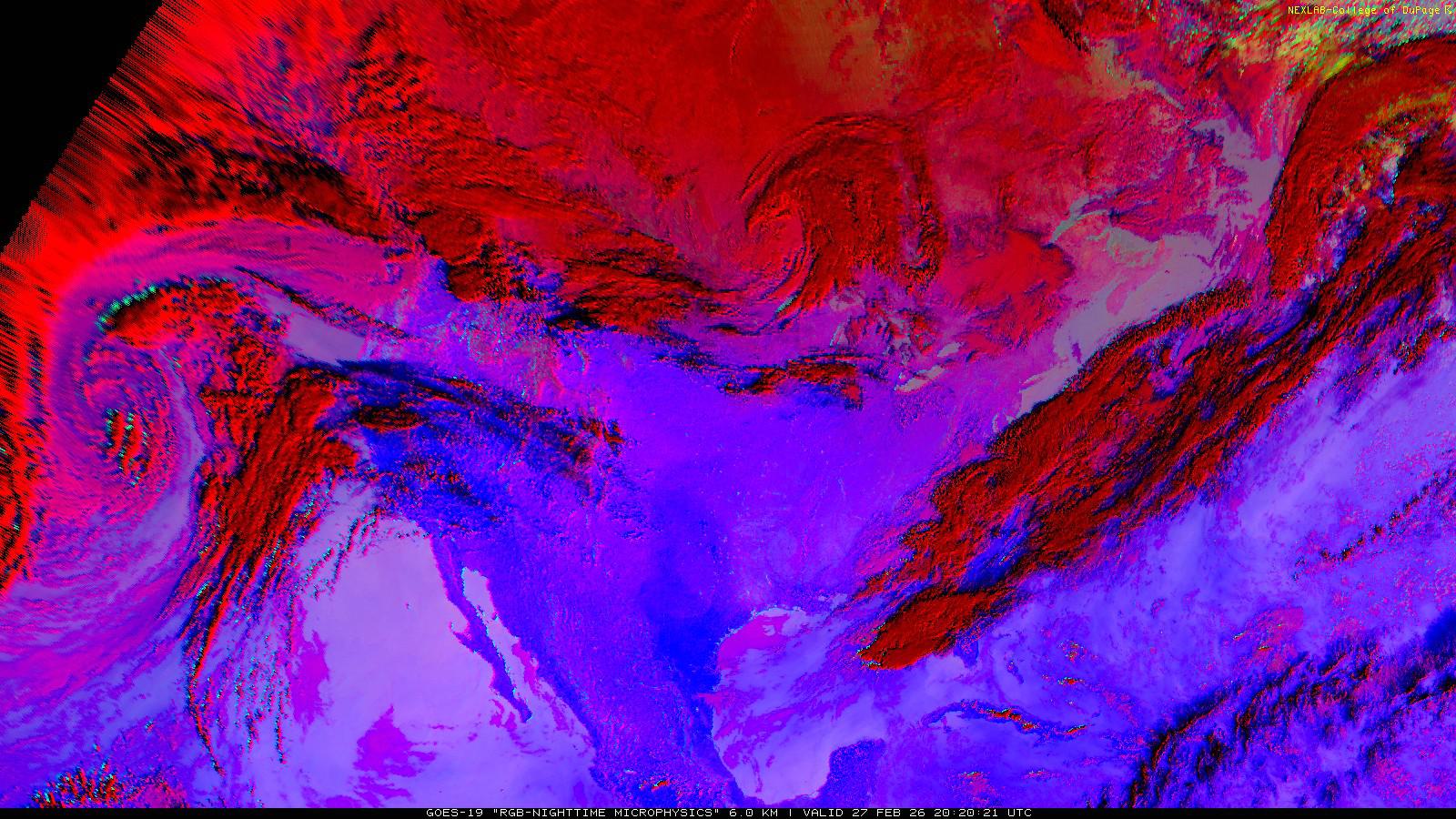 The RGB Nighttime Microphysics product is a combination of three different infrared bands. It is useful for discriminating between different cloud types, especially between low stratus clouds and fog. The ‘Red’ channel is a difference of ABI bands 15 and 13, while 'Green' is a difference of bands 13 and 7, and 'Blue' is solely being represented by ABI band 13. This product is only truly useful during the nighttime when it is dark because of the influence solar reflectance has on band 7.