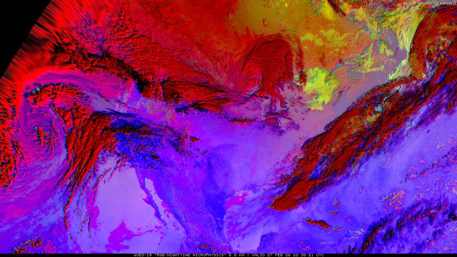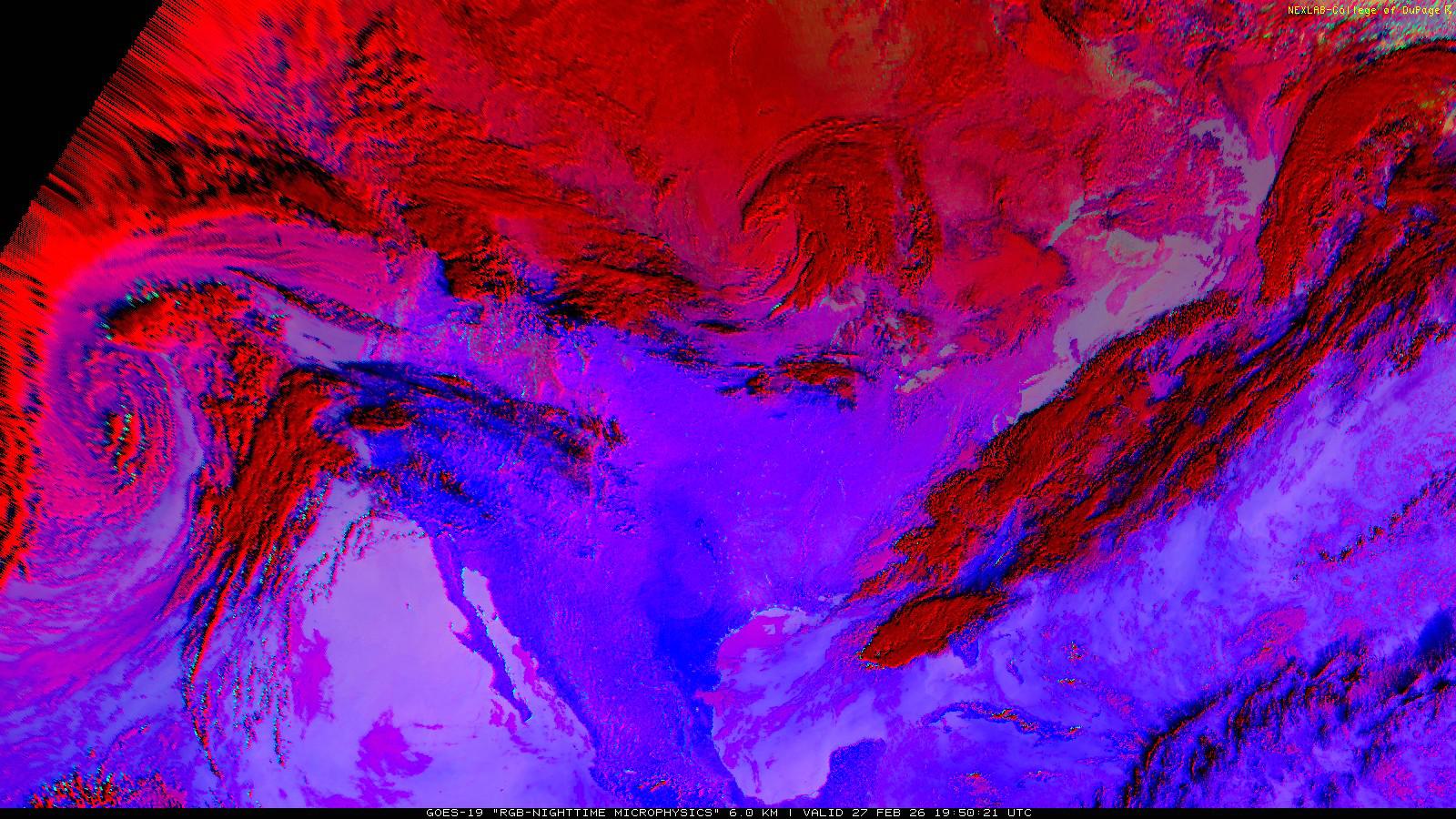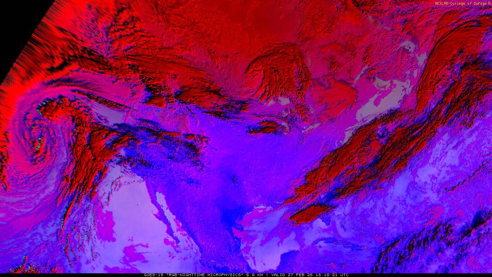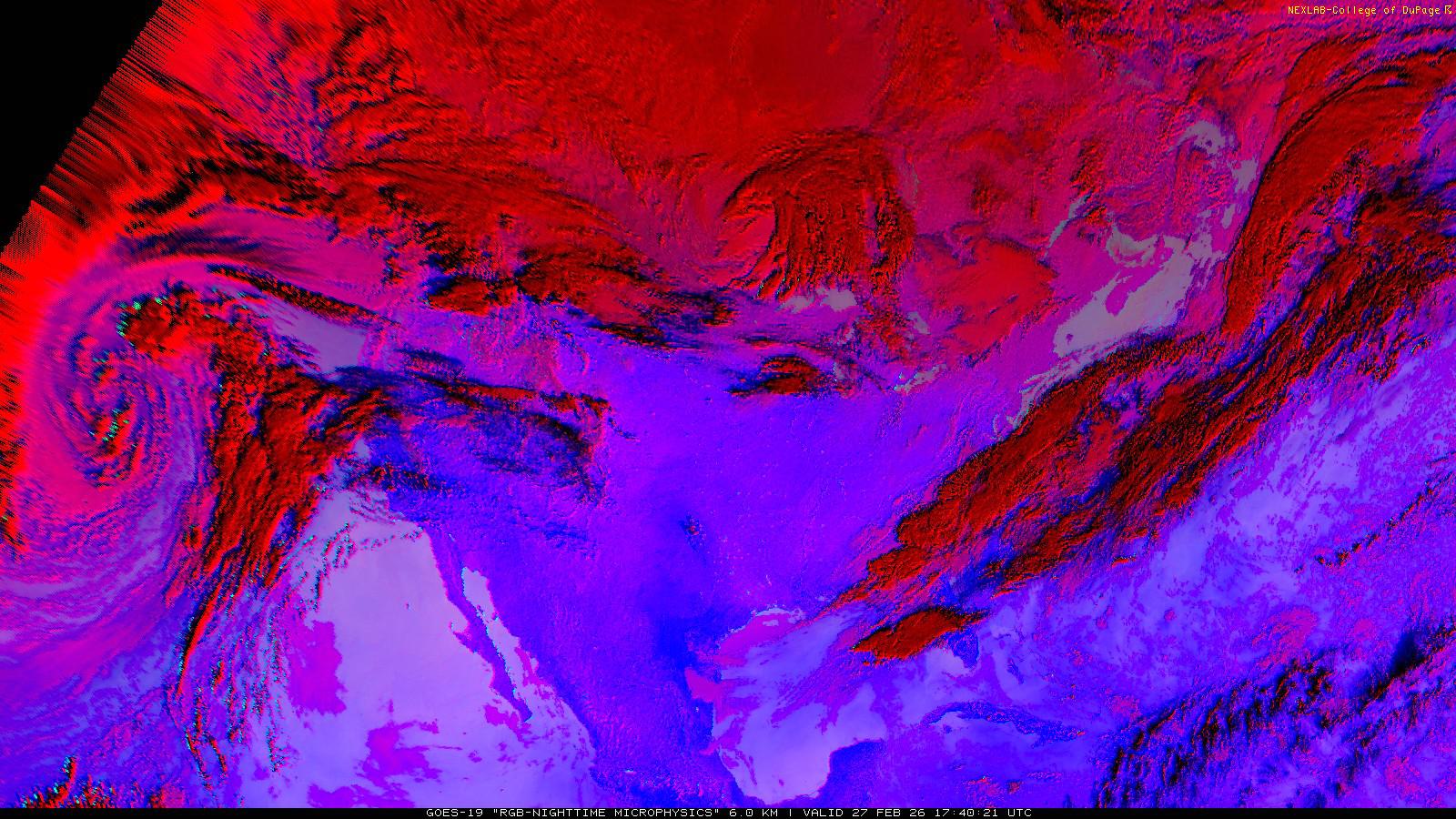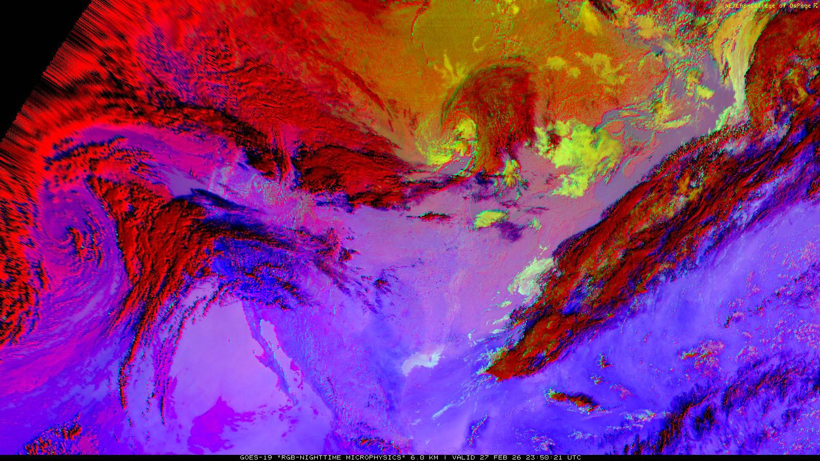 The RGB Nighttime Microphysics product is a combination of three different infrared bands. It is useful for discriminating between different cloud types, especially between low stratus clouds and fog. The ‘Red’ channel is a difference of ABI bands 15 and 13, while 'Green' is a difference of bands 13 and 7, and 'Blue' is solely being represented by ABI band 13. This product is only truly useful during the nighttime when it is dark because of the influence solar reflectance has on band 7.