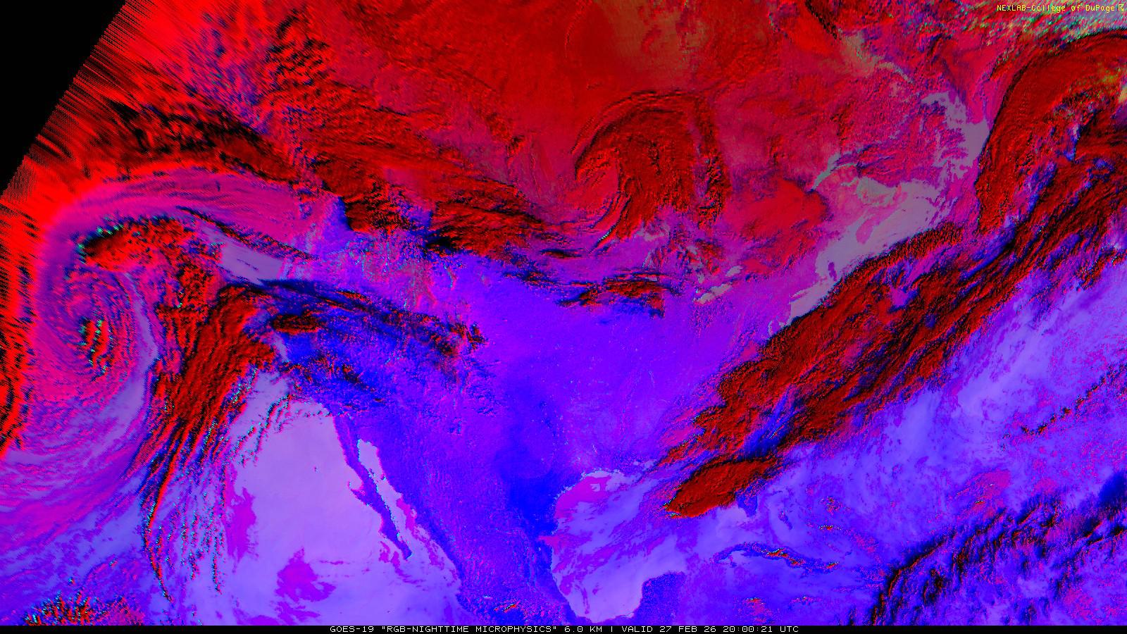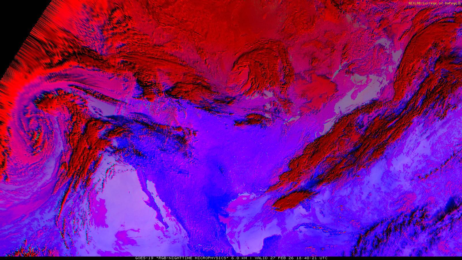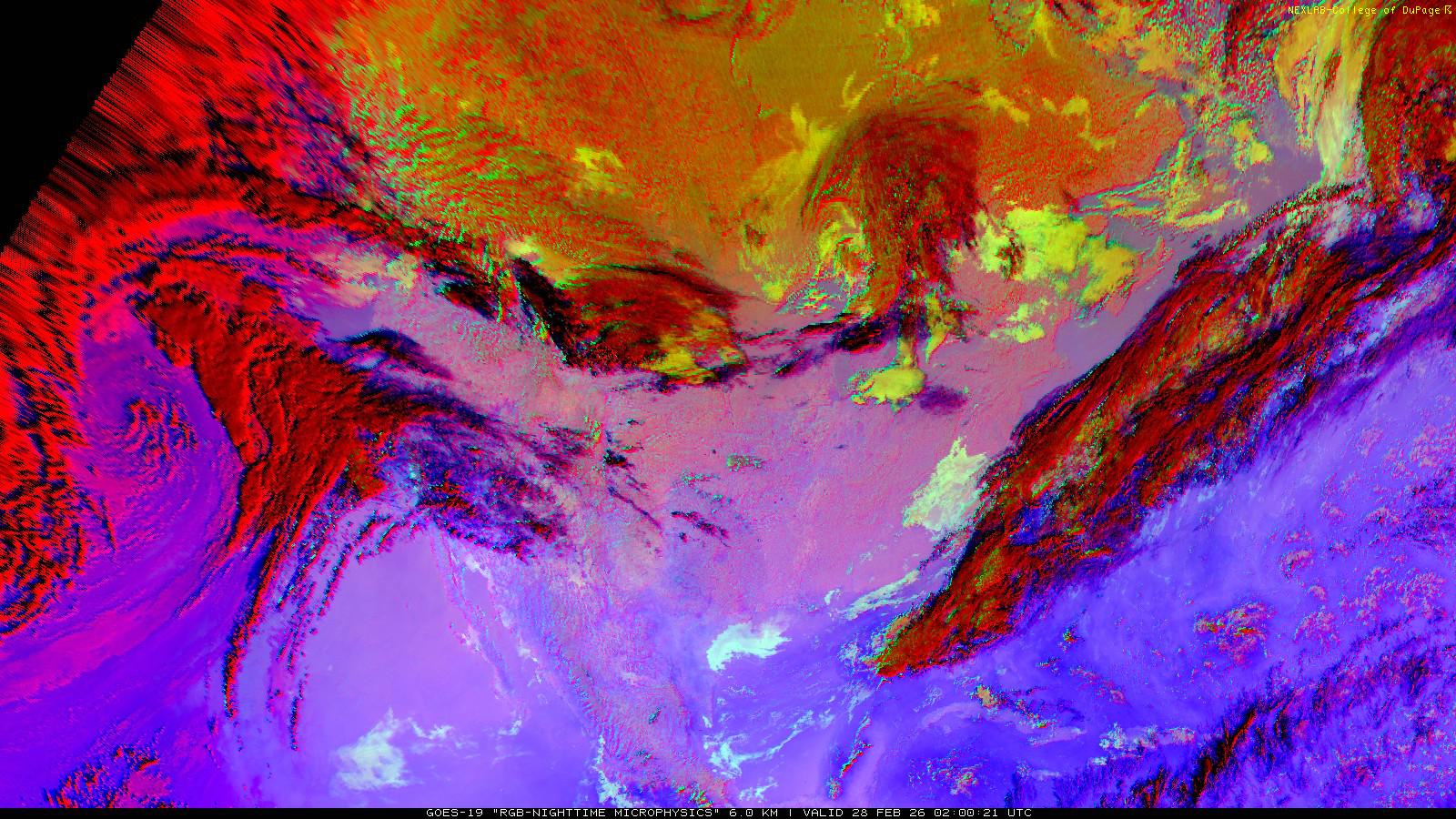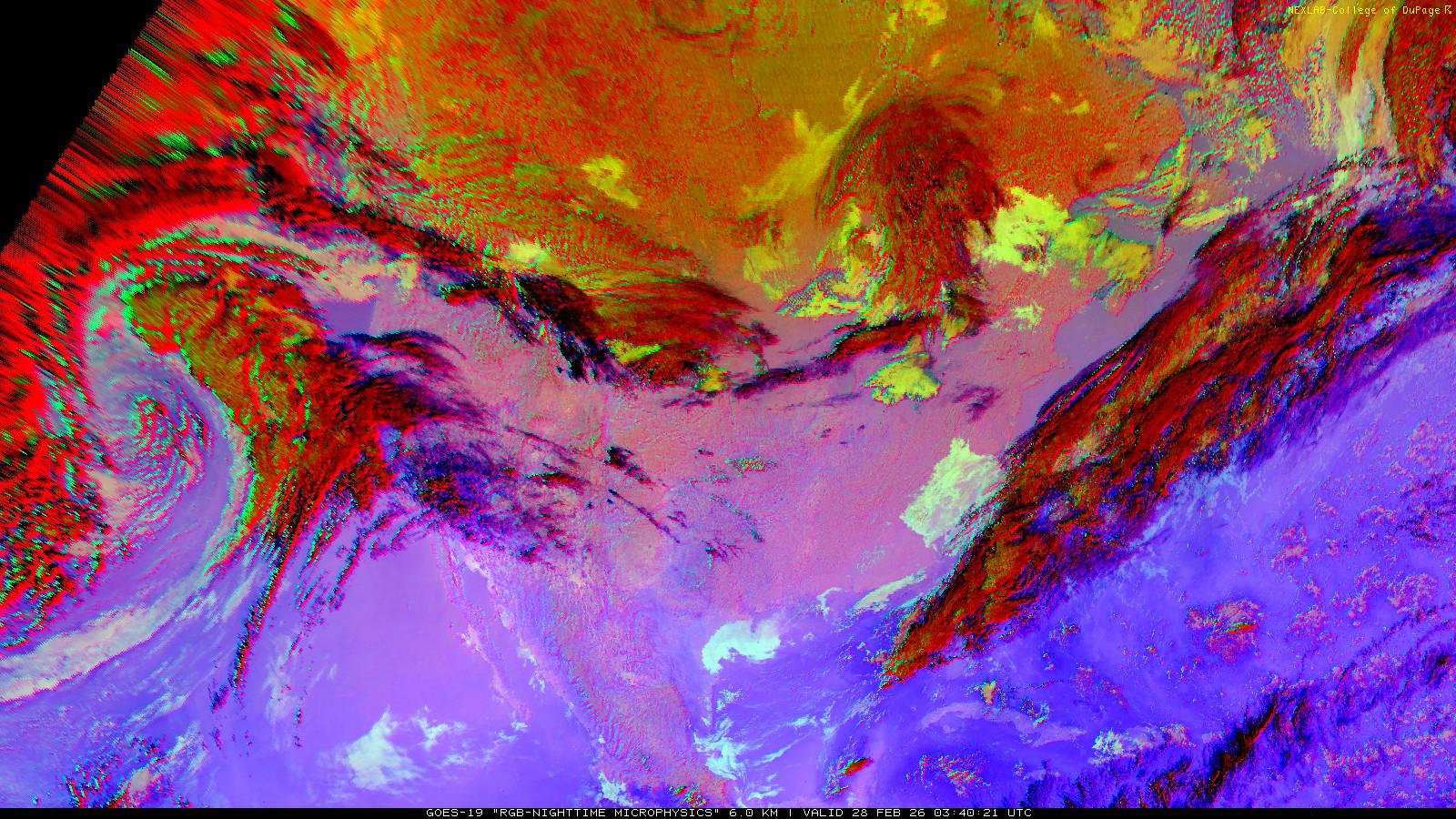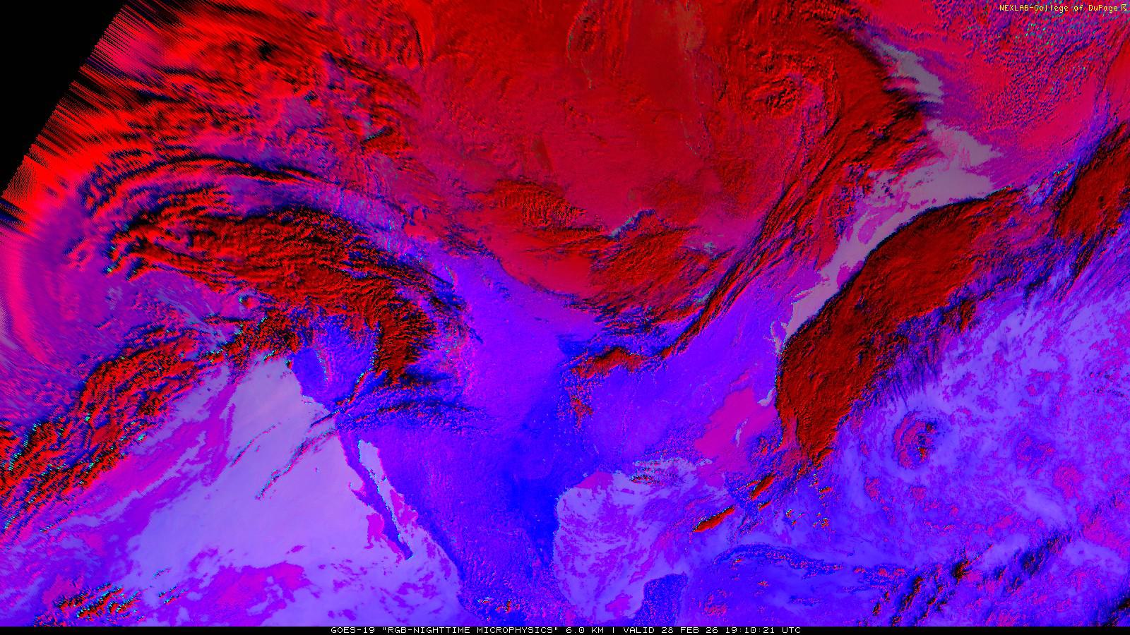 The RGB Nighttime Microphysics product is a combination of three different infrared bands. It is useful for discriminating between different cloud types, especially between low stratus clouds and fog. The ‘Red’ channel is a difference of ABI bands 15 and 13, while 'Green' is a difference of bands 13 and 7, and 'Blue' is solely being represented by ABI band 13. This product is only truly useful during the nighttime when it is dark because of the influence solar reflectance has on band 7.