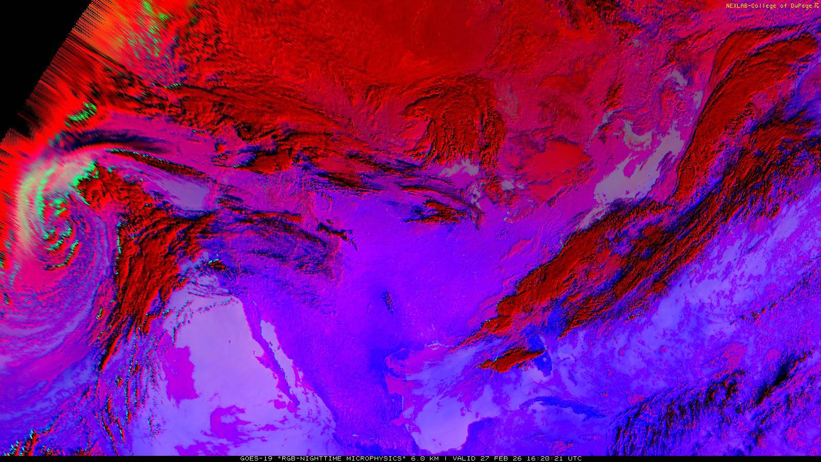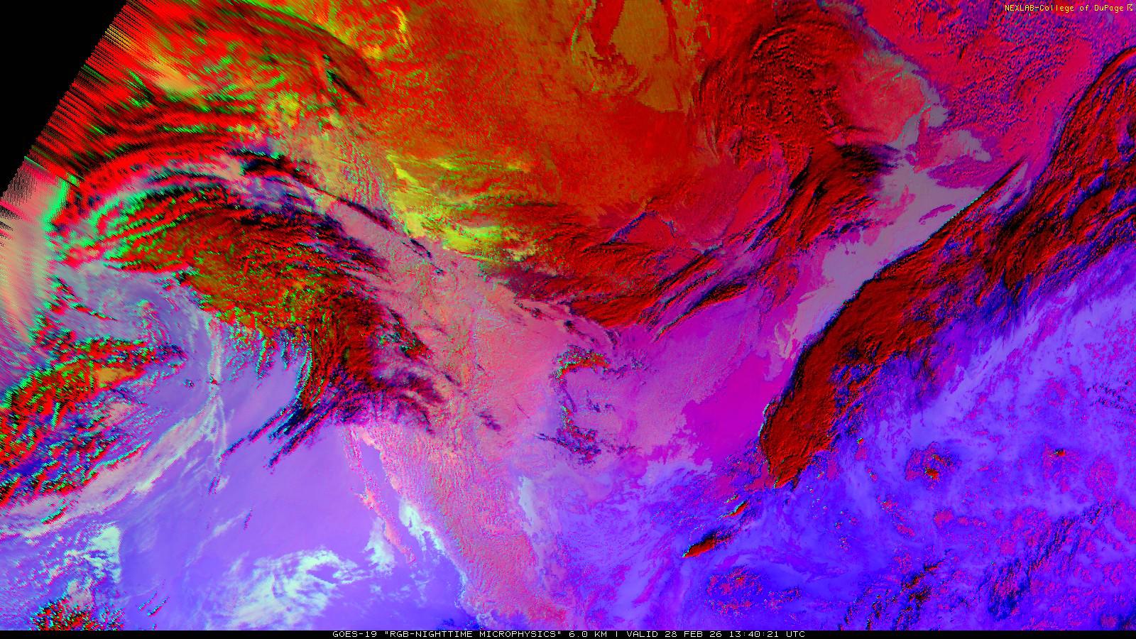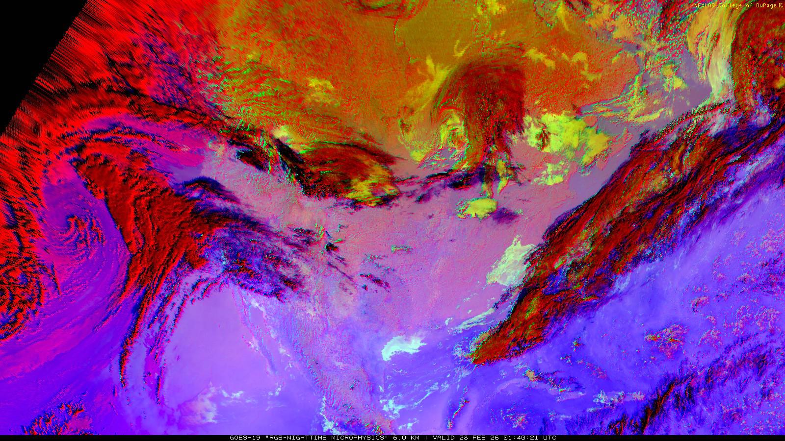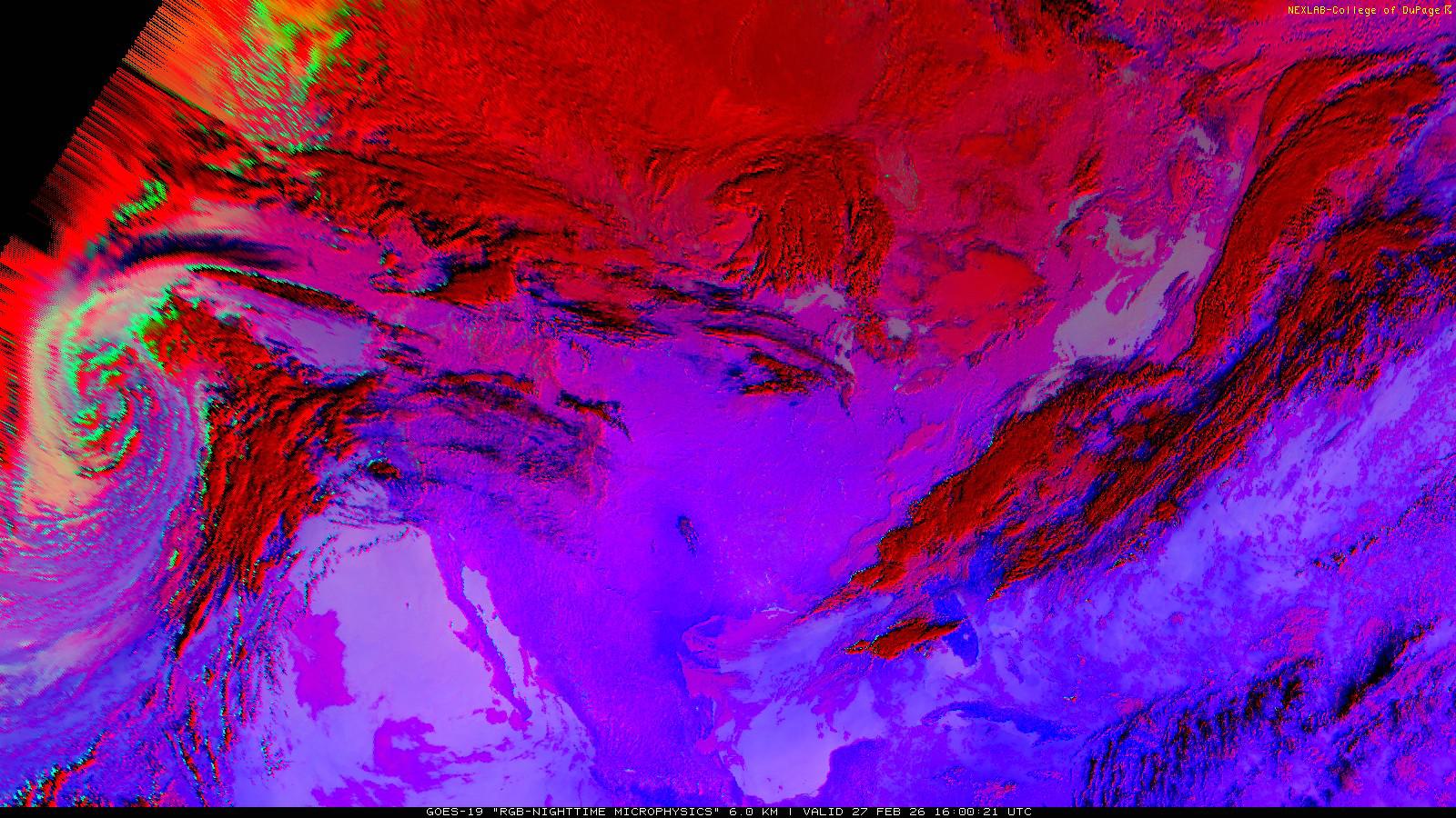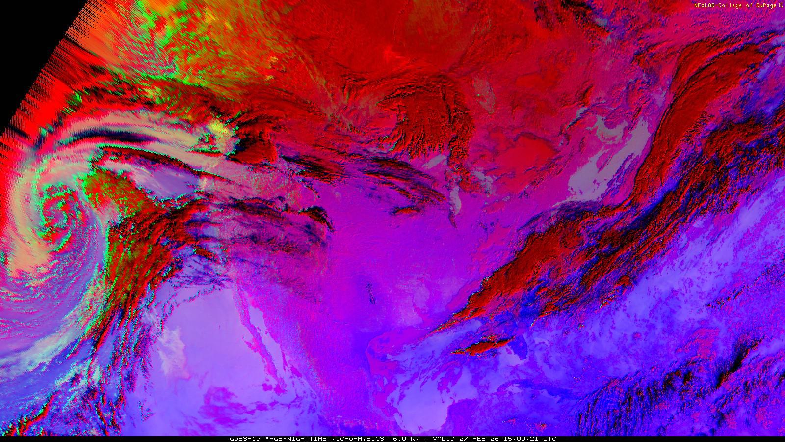 The RGB Nighttime Microphysics product is a combination of three different infrared bands. It is useful for discriminating between different cloud types, especially between low stratus clouds and fog. The ‘Red’ channel is a difference of ABI bands 15 and 13, while 'Green' is a difference of bands 13 and 7, and 'Blue' is solely being represented by ABI band 13. This product is only truly useful during the nighttime when it is dark because of the influence solar reflectance has on band 7.