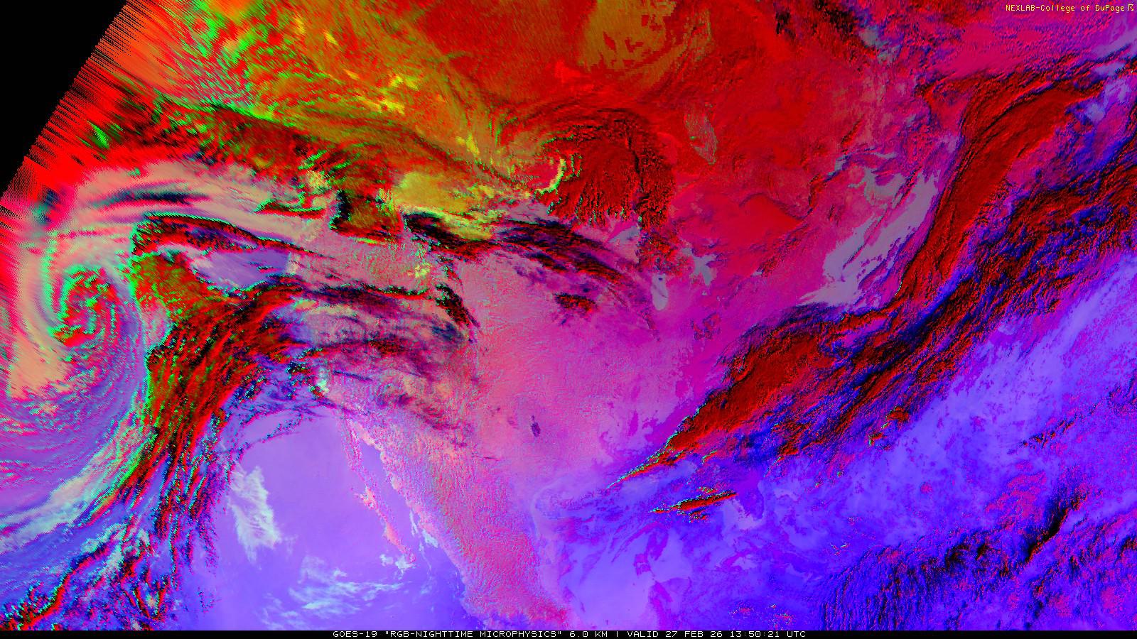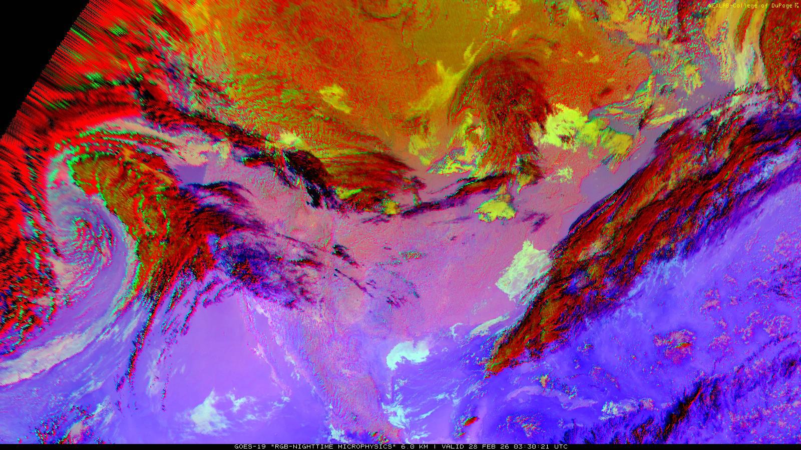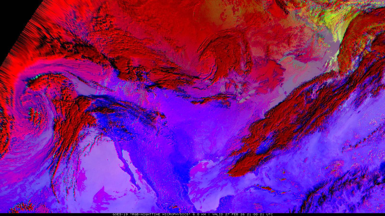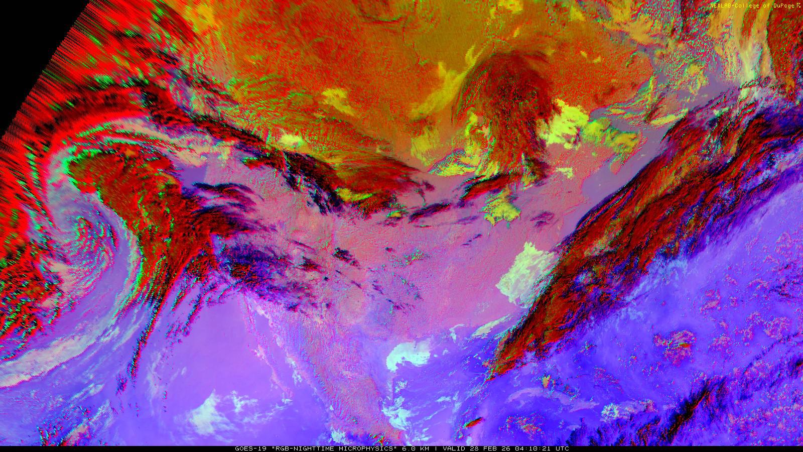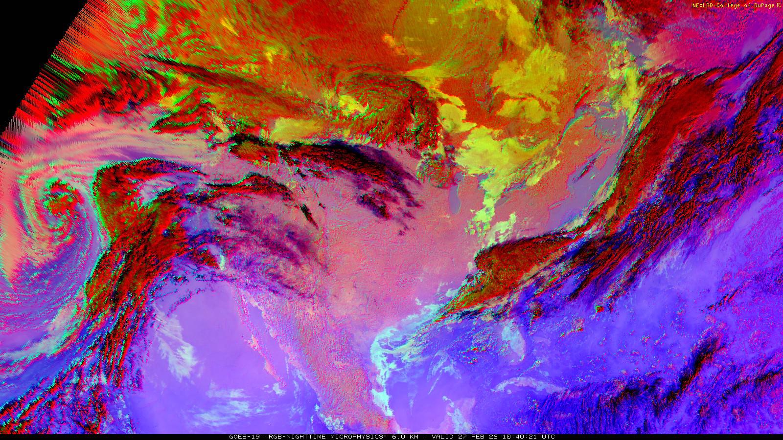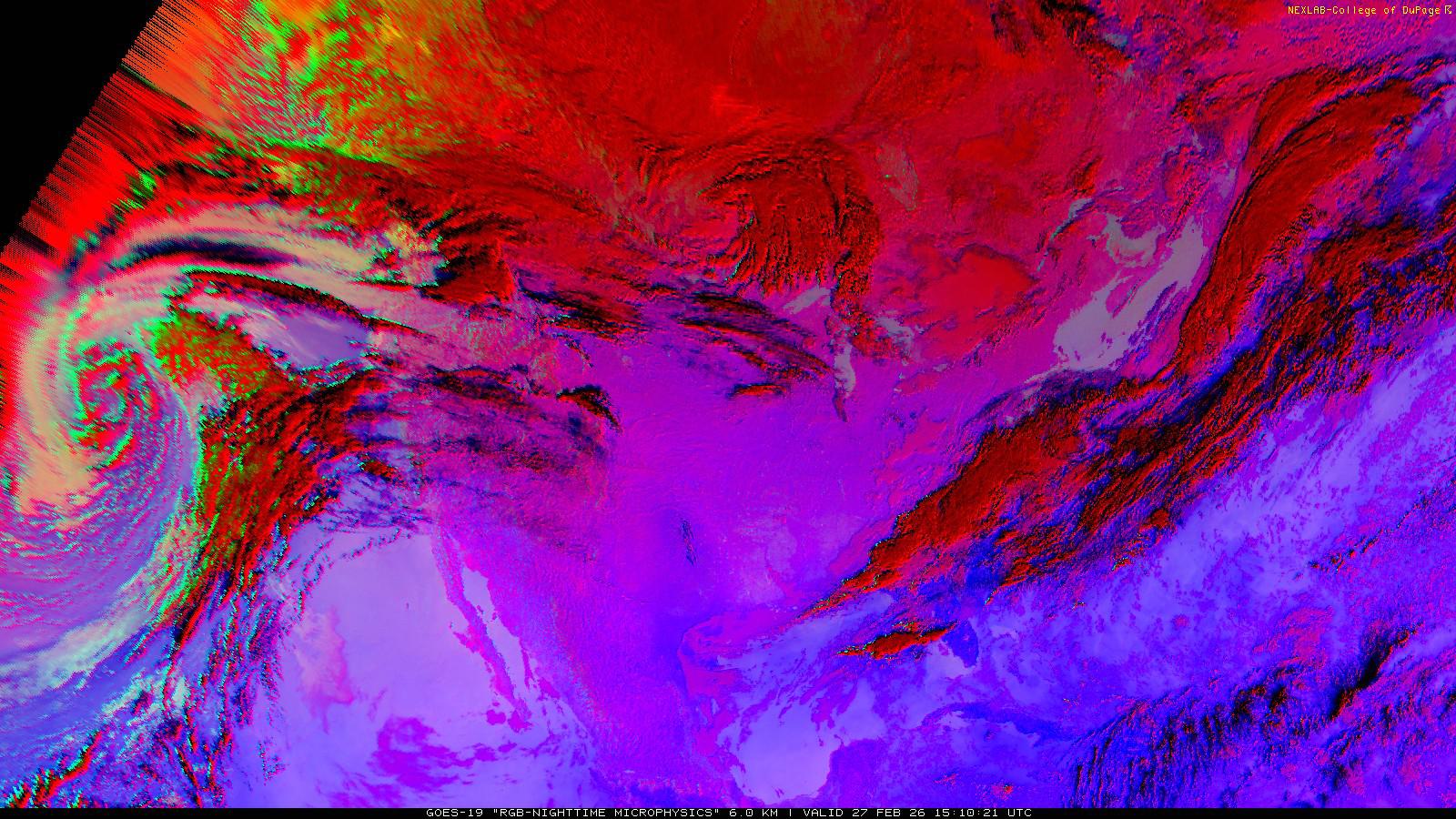 The RGB Nighttime Microphysics product is a combination of three different infrared bands. It is useful for discriminating between different cloud types, especially between low stratus clouds and fog. The ‘Red’ channel is a difference of ABI bands 15 and 13, while 'Green' is a difference of bands 13 and 7, and 'Blue' is solely being represented by ABI band 13. This product is only truly useful during the nighttime when it is dark because of the influence solar reflectance has on band 7.