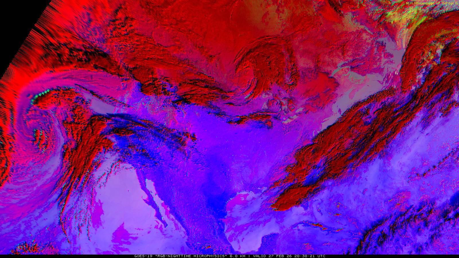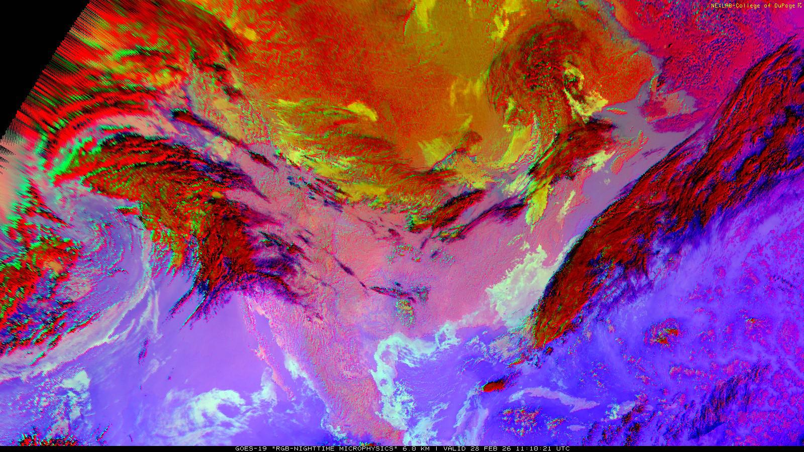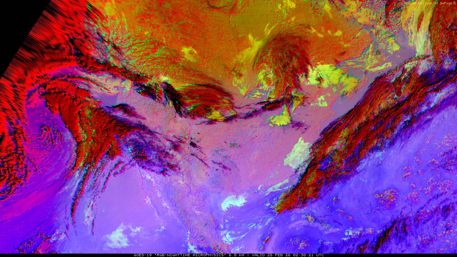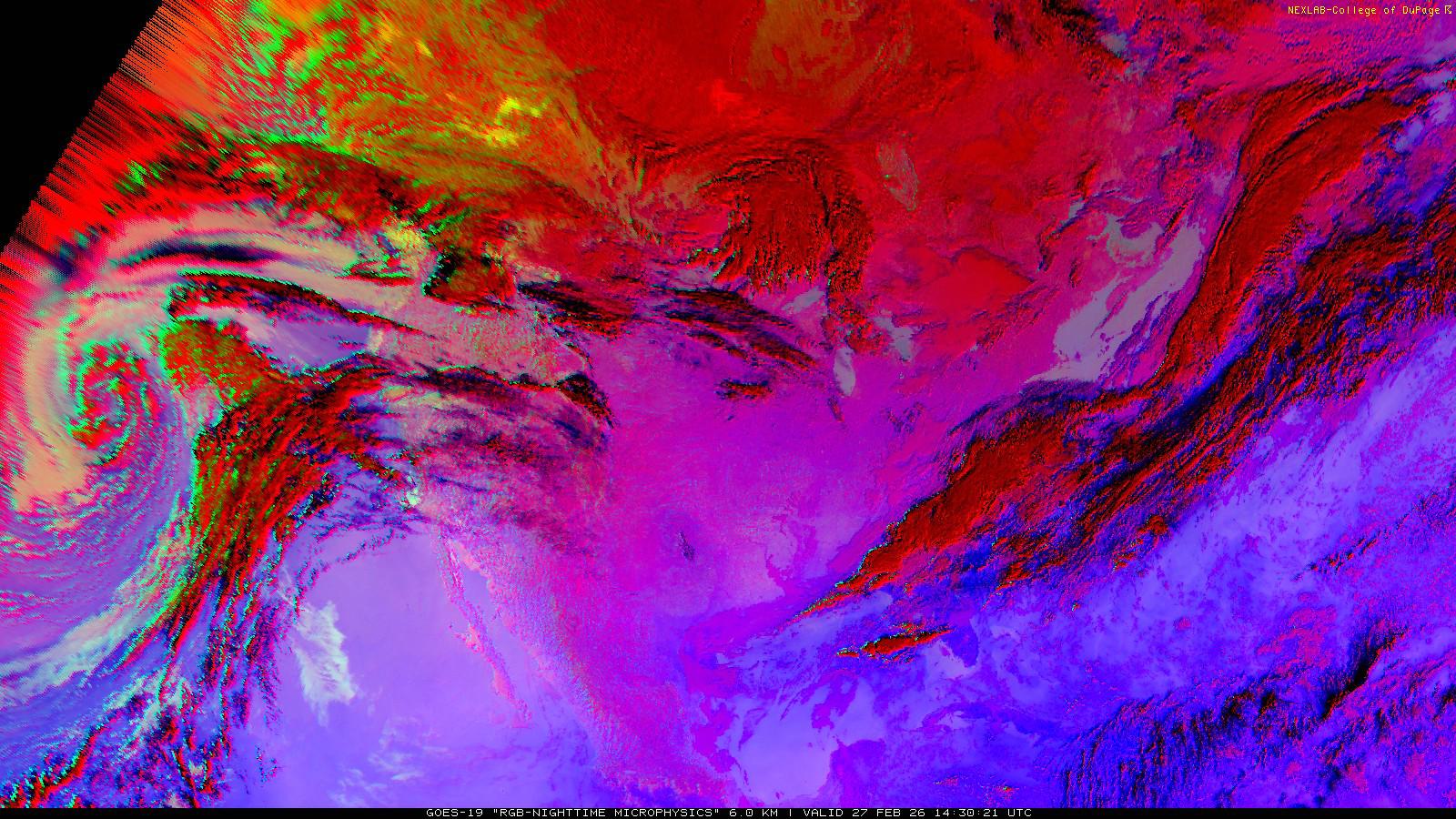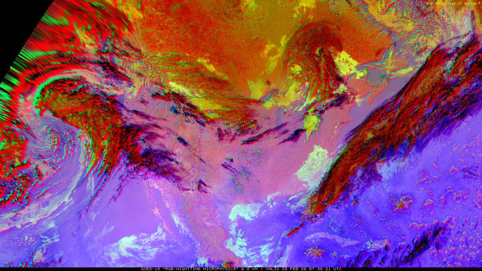 The RGB Nighttime Microphysics product is a combination of three different infrared bands. It is useful for discriminating between different cloud types, especially between low stratus clouds and fog. The ‘Red’ channel is a difference of ABI bands 15 and 13, while 'Green' is a difference of bands 13 and 7, and 'Blue' is solely being represented by ABI band 13. This product is only truly useful during the nighttime when it is dark because of the influence solar reflectance has on band 7.