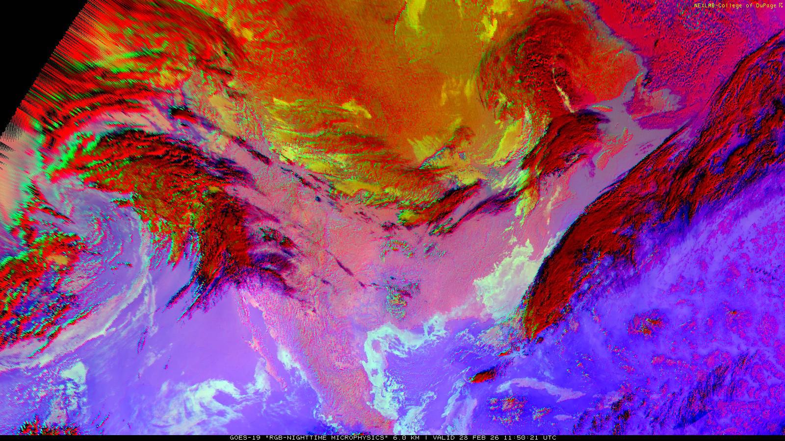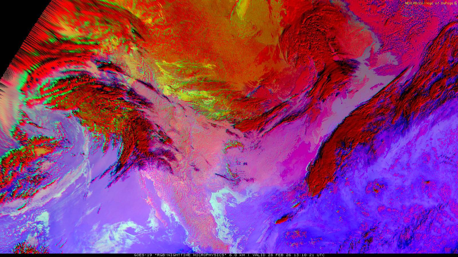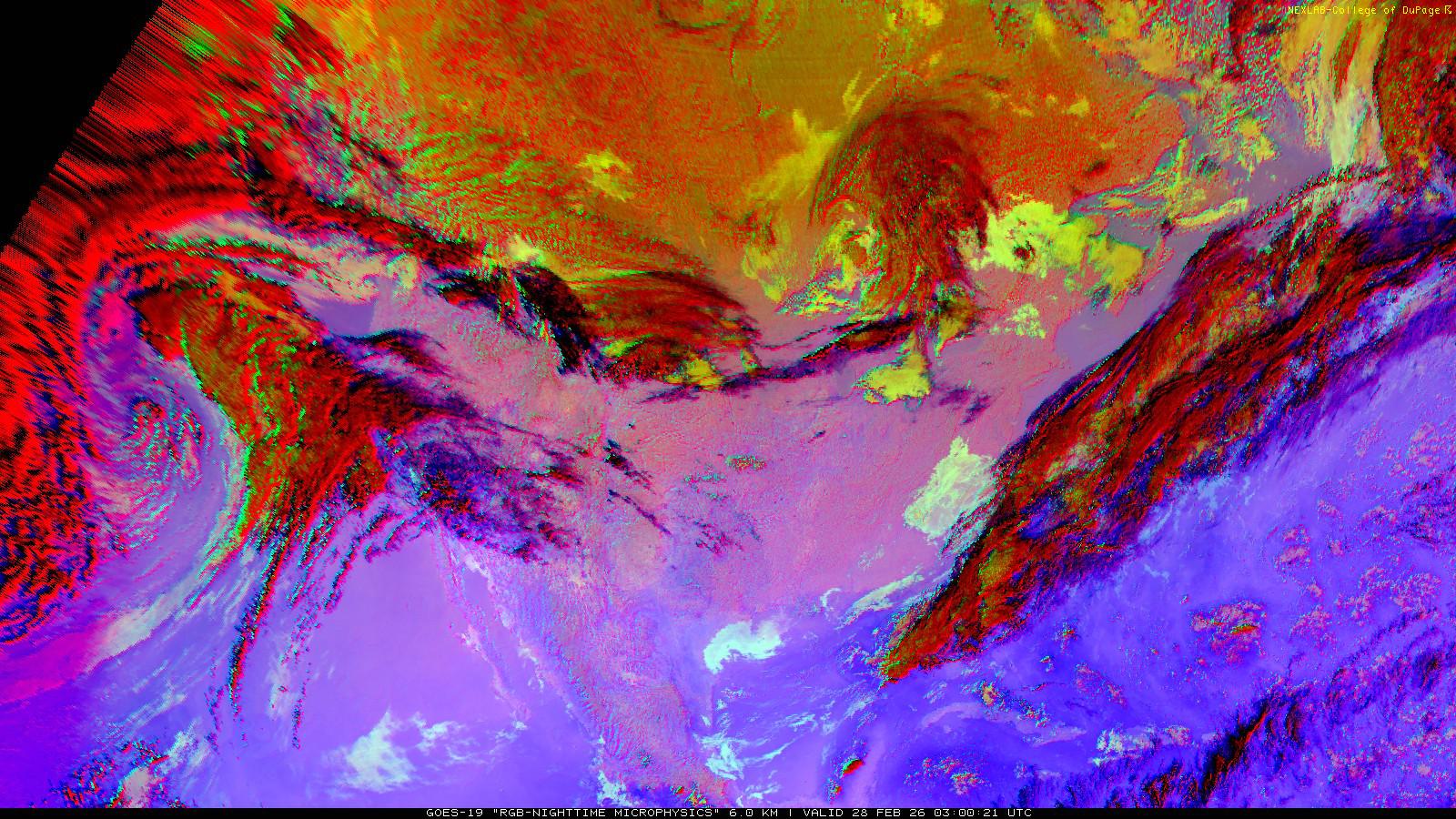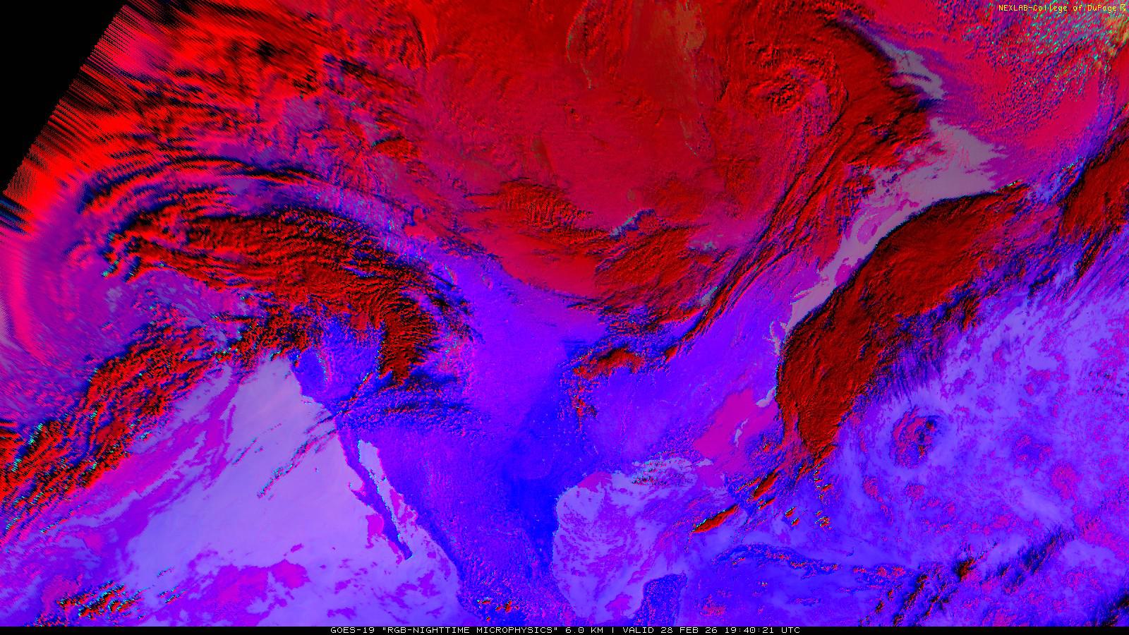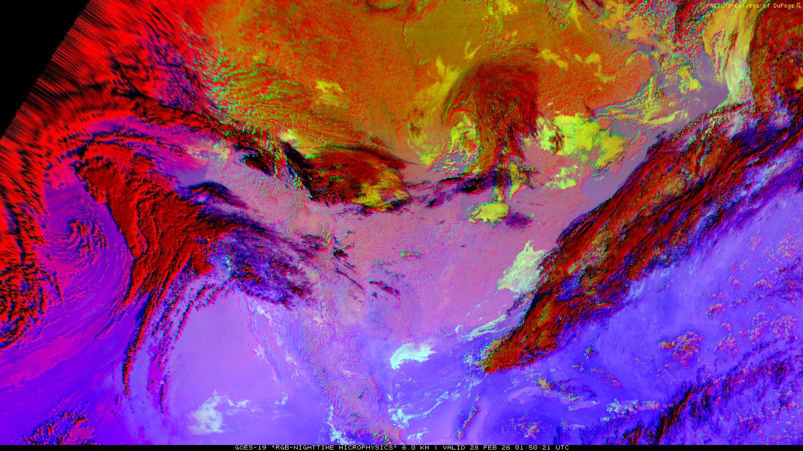The RGB Nighttime Microphysics product is a combination of three different infrared bands. It is useful for discriminating between different cloud types, especially between low stratus clouds and fog. The ‘Red’ channel is a difference of ABI bands 15 and 13, while 'Green' is a difference of bands 13 and 7, and 'Blue' is solely being represented by ABI band 13. This product is only truly useful during the nighttime when it is dark because of the influence solar reflectance has on band 7.