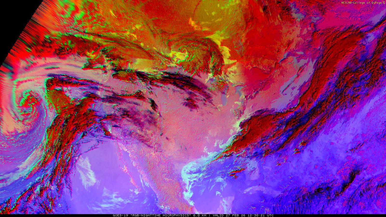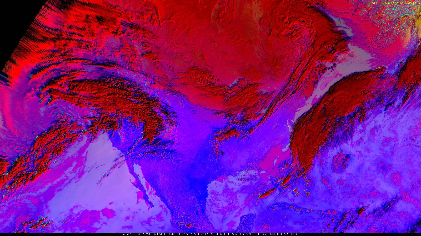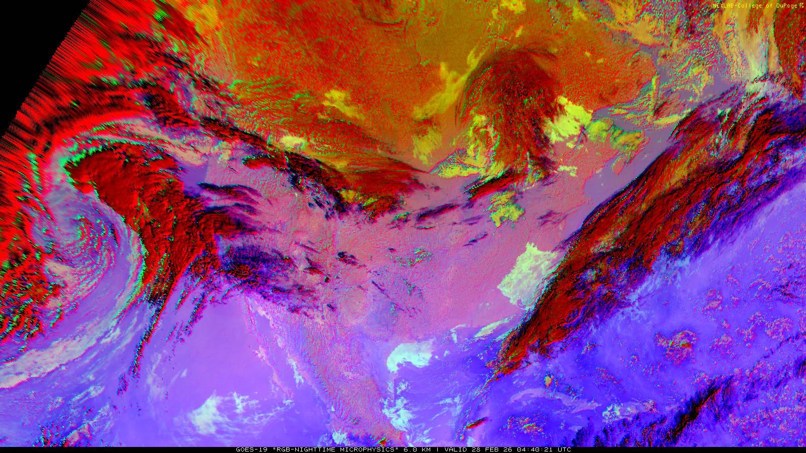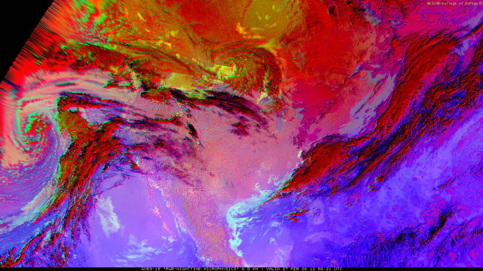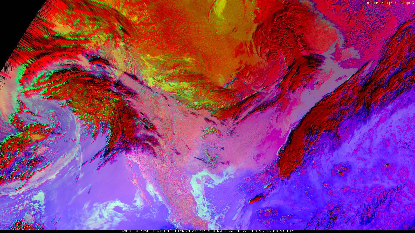 The RGB Nighttime Microphysics product is a combination of three different infrared bands. It is useful for discriminating between different cloud types, especially between low stratus clouds and fog. The ‘Red’ channel is a difference of ABI bands 15 and 13, while 'Green' is a difference of bands 13 and 7, and 'Blue' is solely being represented by ABI band 13. This product is only truly useful during the nighttime when it is dark because of the influence solar reflectance has on band 7.