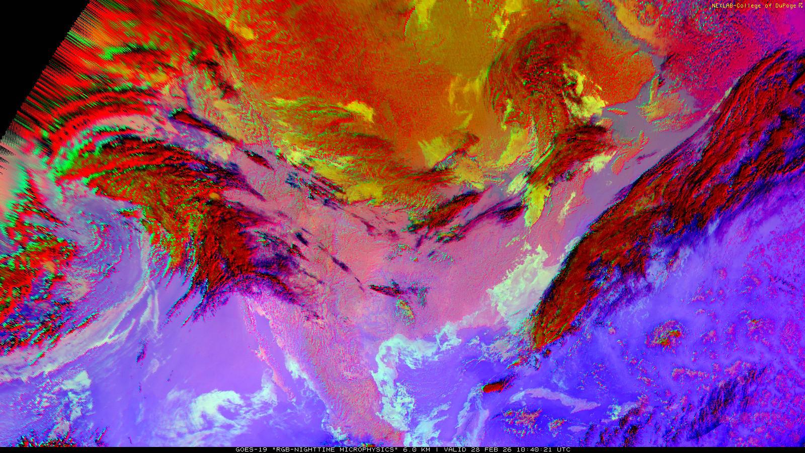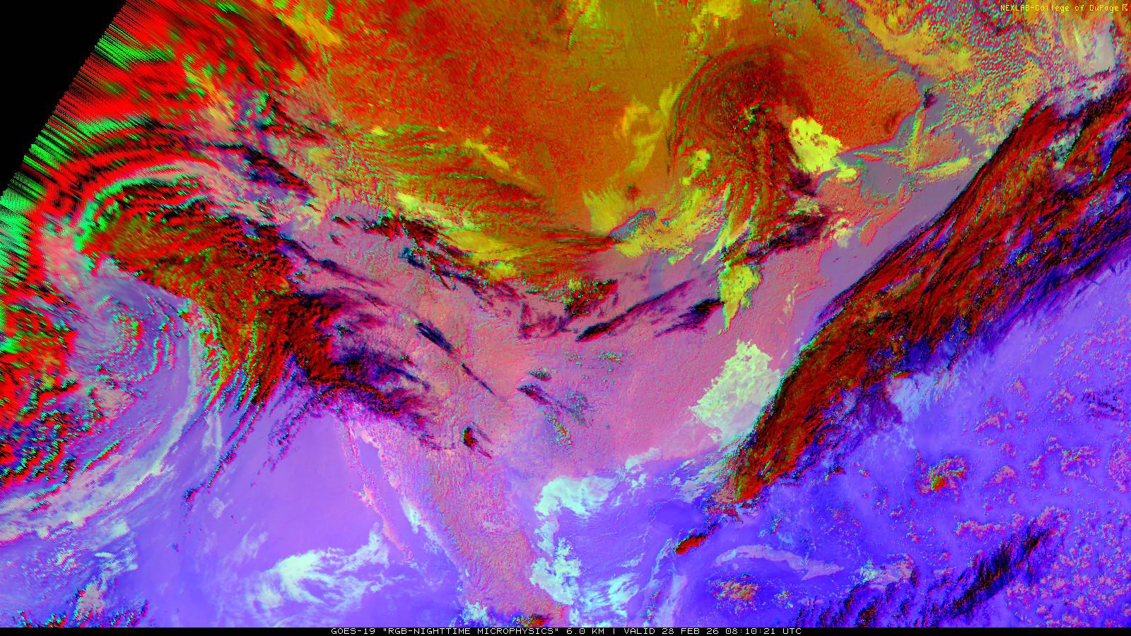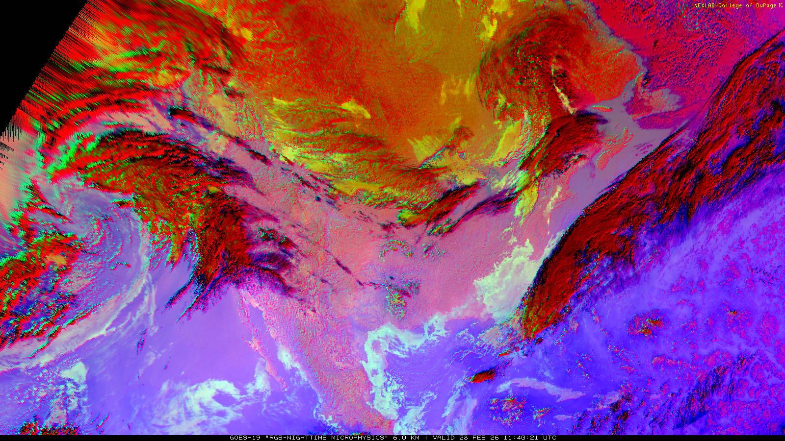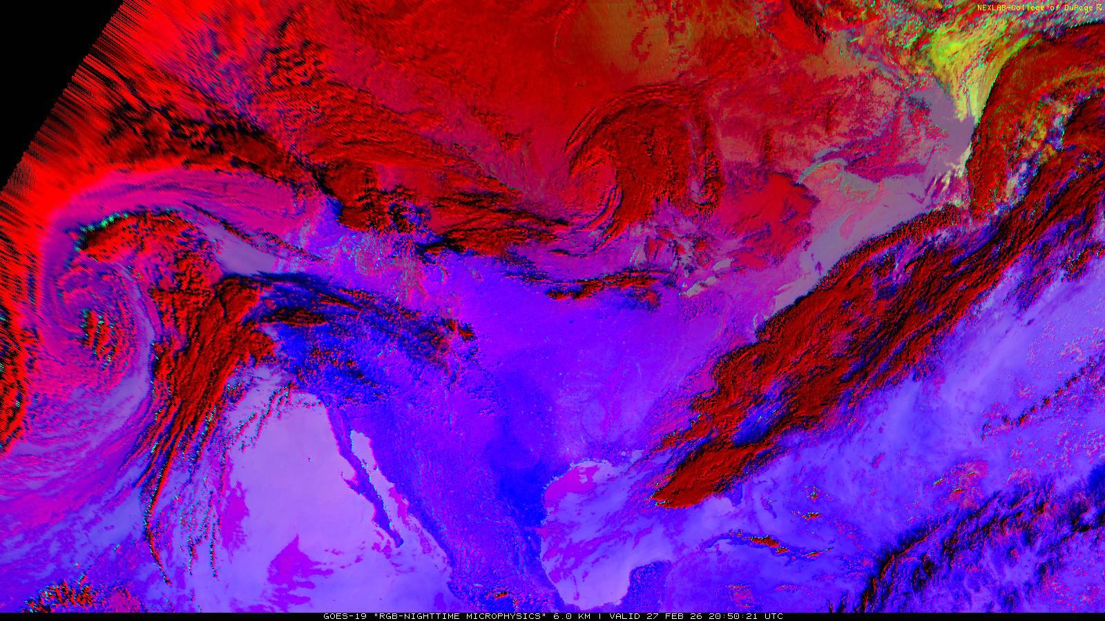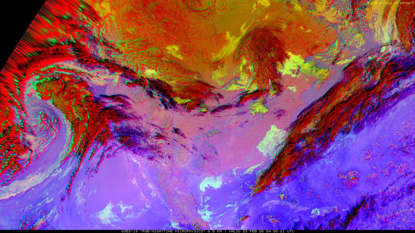 The RGB Nighttime Microphysics product is a combination of three different infrared bands. It is useful for discriminating between different cloud types, especially between low stratus clouds and fog. The ‘Red’ channel is a difference of ABI bands 15 and 13, while 'Green' is a difference of bands 13 and 7, and 'Blue' is solely being represented by ABI band 13. This product is only truly useful during the nighttime when it is dark because of the influence solar reflectance has on band 7.