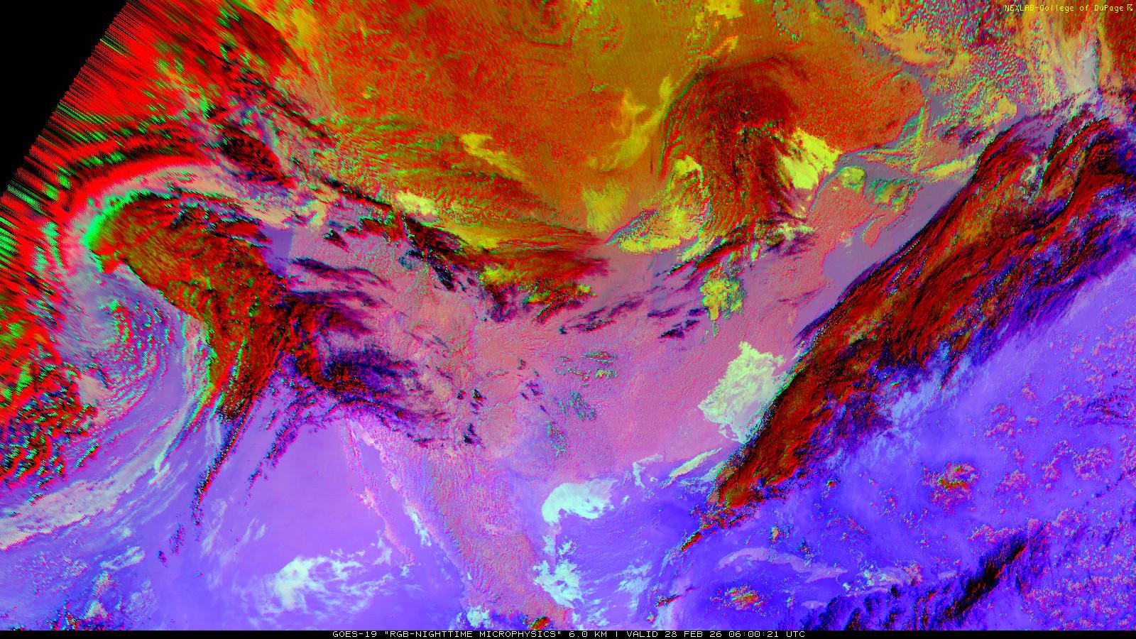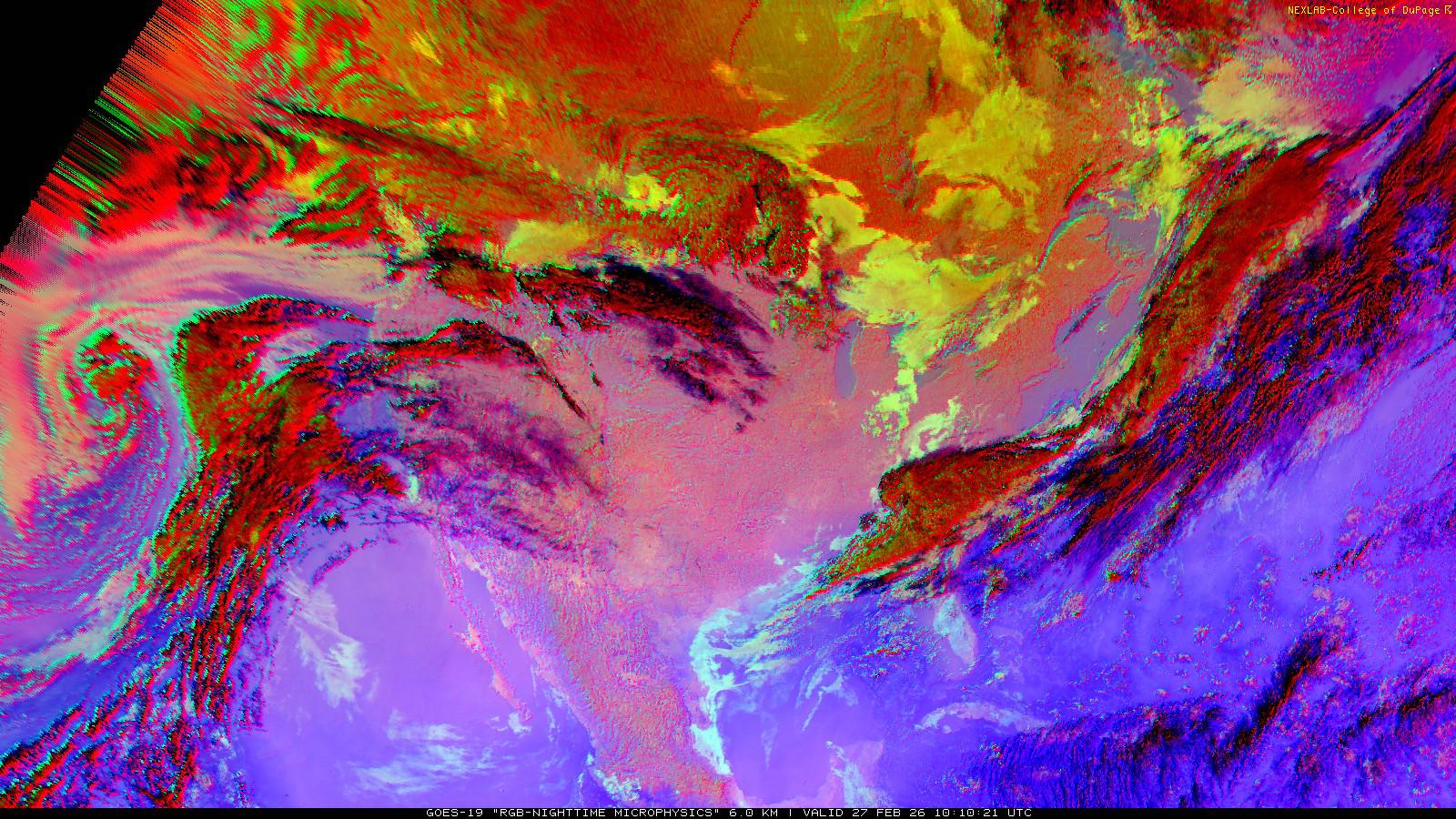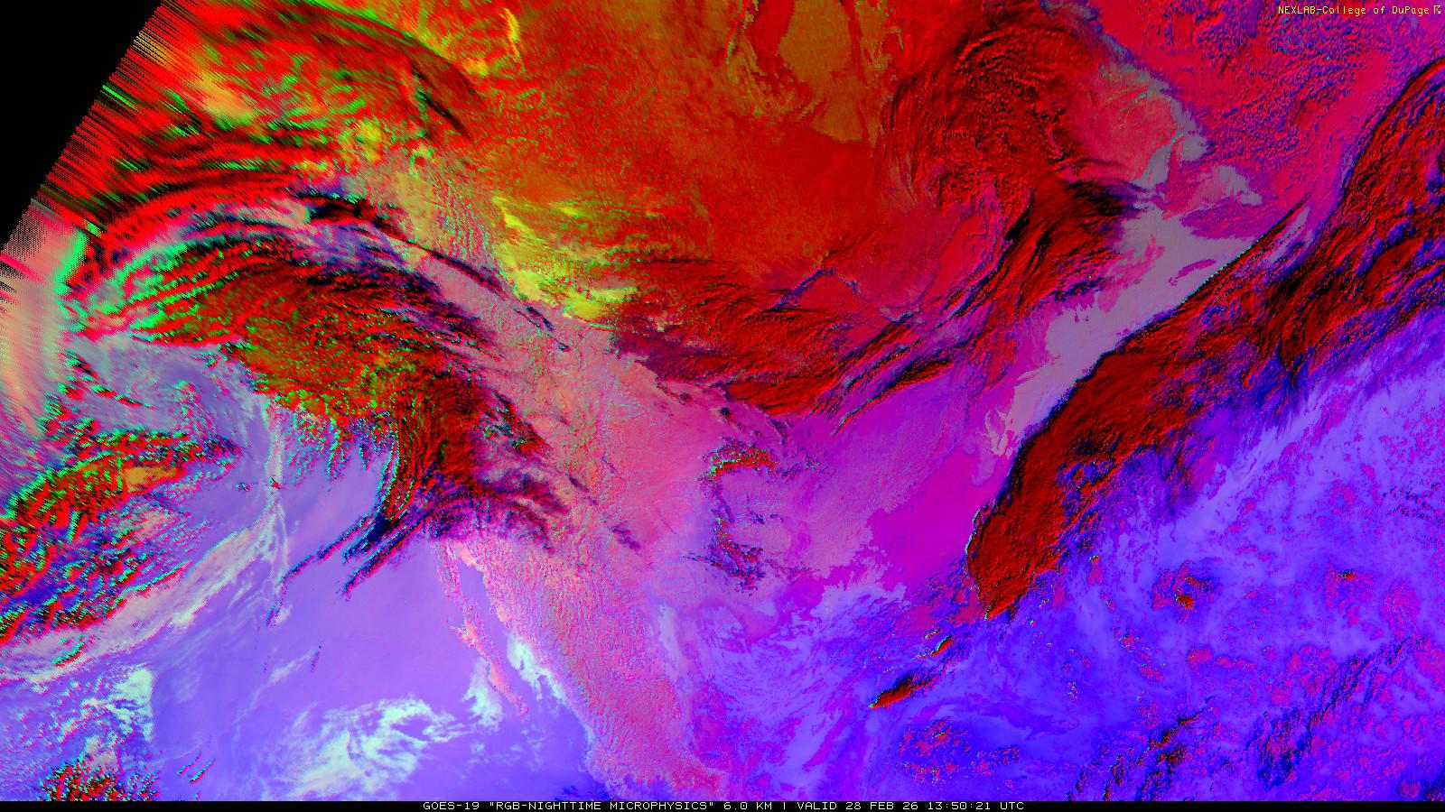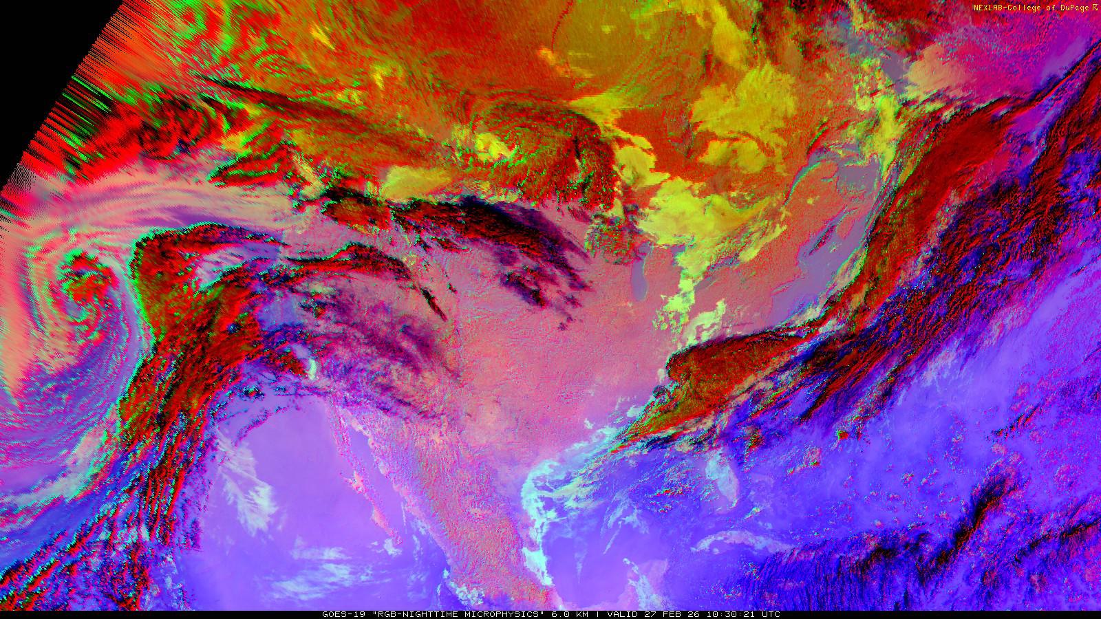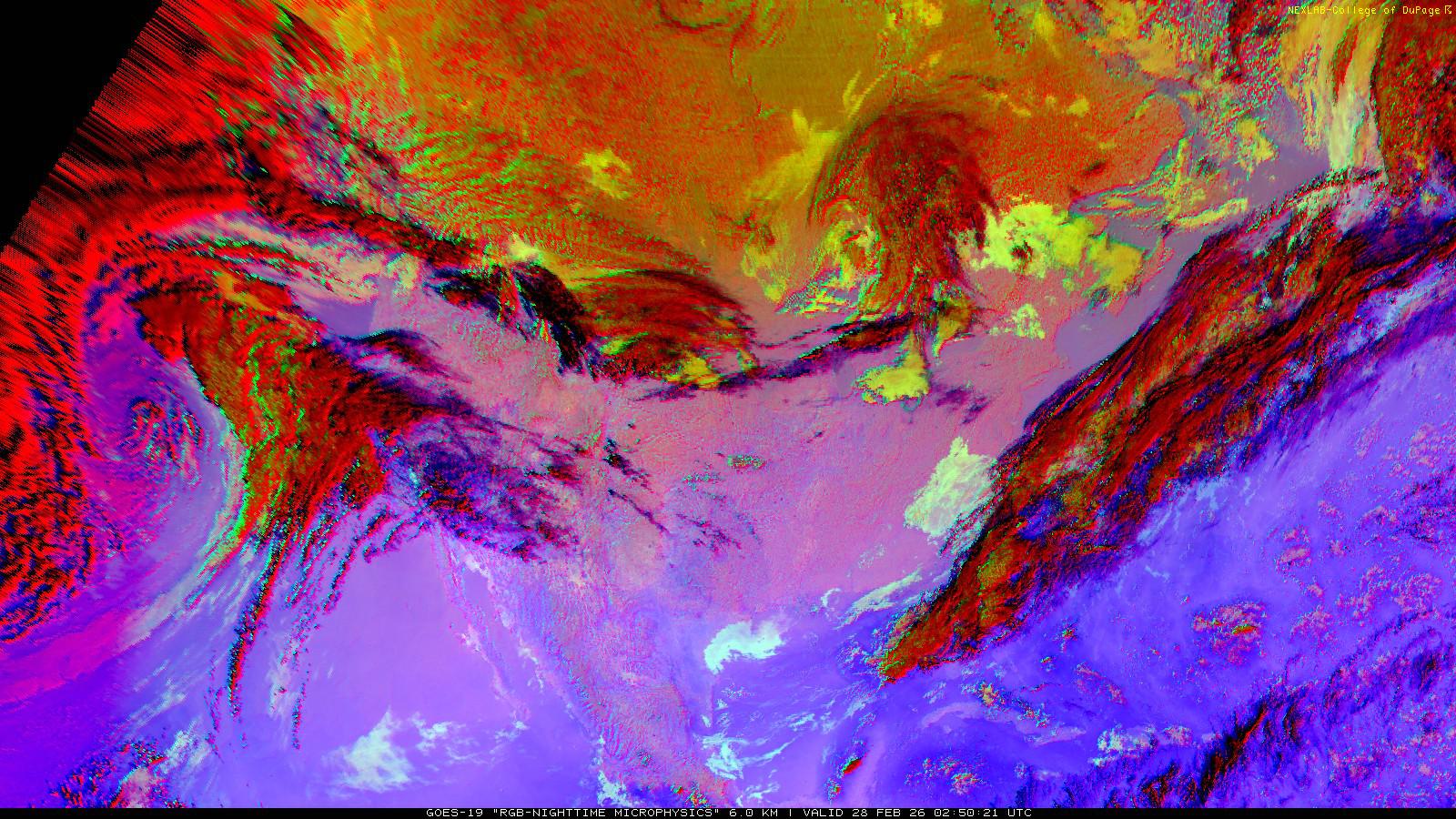 The RGB Nighttime Microphysics product is a combination of three different infrared bands. It is useful for discriminating between different cloud types, especially between low stratus clouds and fog. The ‘Red’ channel is a difference of ABI bands 15 and 13, while 'Green' is a difference of bands 13 and 7, and 'Blue' is solely being represented by ABI band 13. This product is only truly useful during the nighttime when it is dark because of the influence solar reflectance has on band 7.