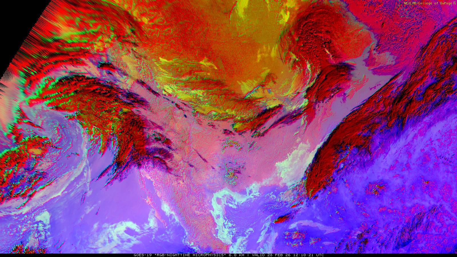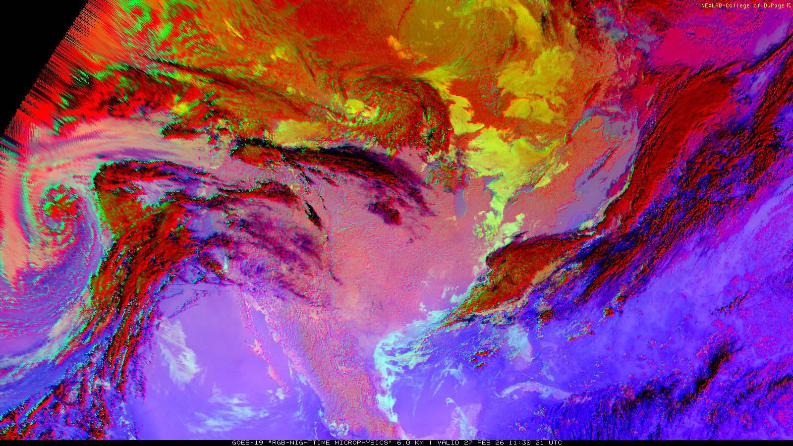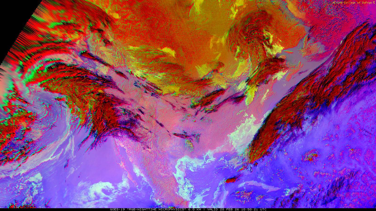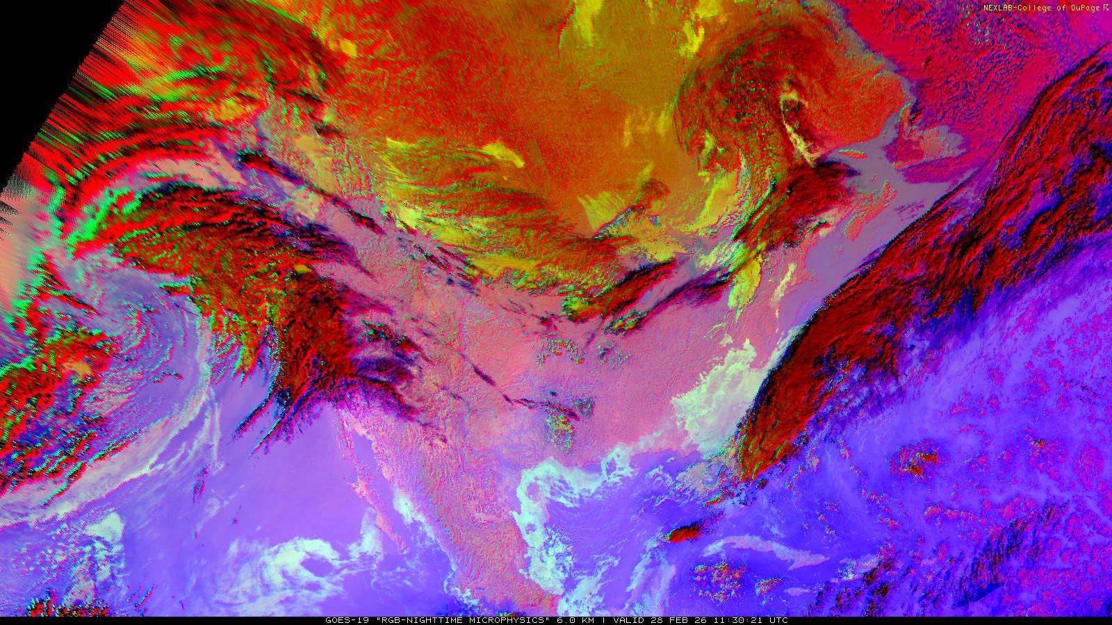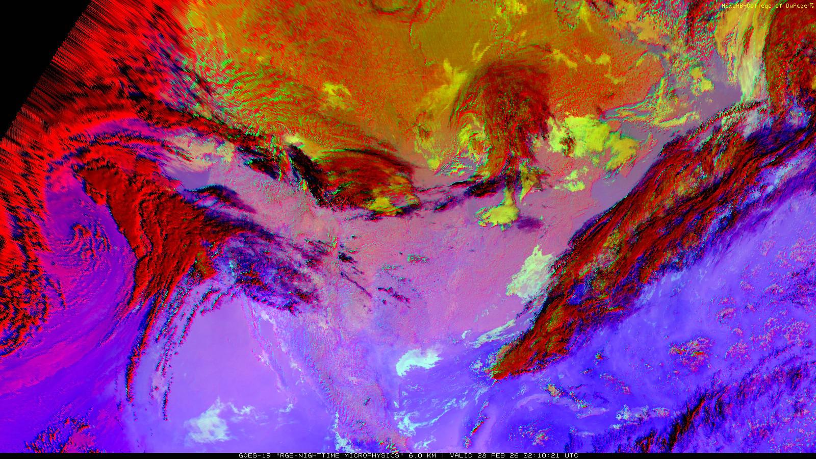 The RGB Nighttime Microphysics product is a combination of three different infrared bands. It is useful for discriminating between different cloud types, especially between low stratus clouds and fog. The ‘Red’ channel is a difference of ABI bands 15 and 13, while 'Green' is a difference of bands 13 and 7, and 'Blue' is solely being represented by ABI band 13. This product is only truly useful during the nighttime when it is dark because of the influence solar reflectance has on band 7.
