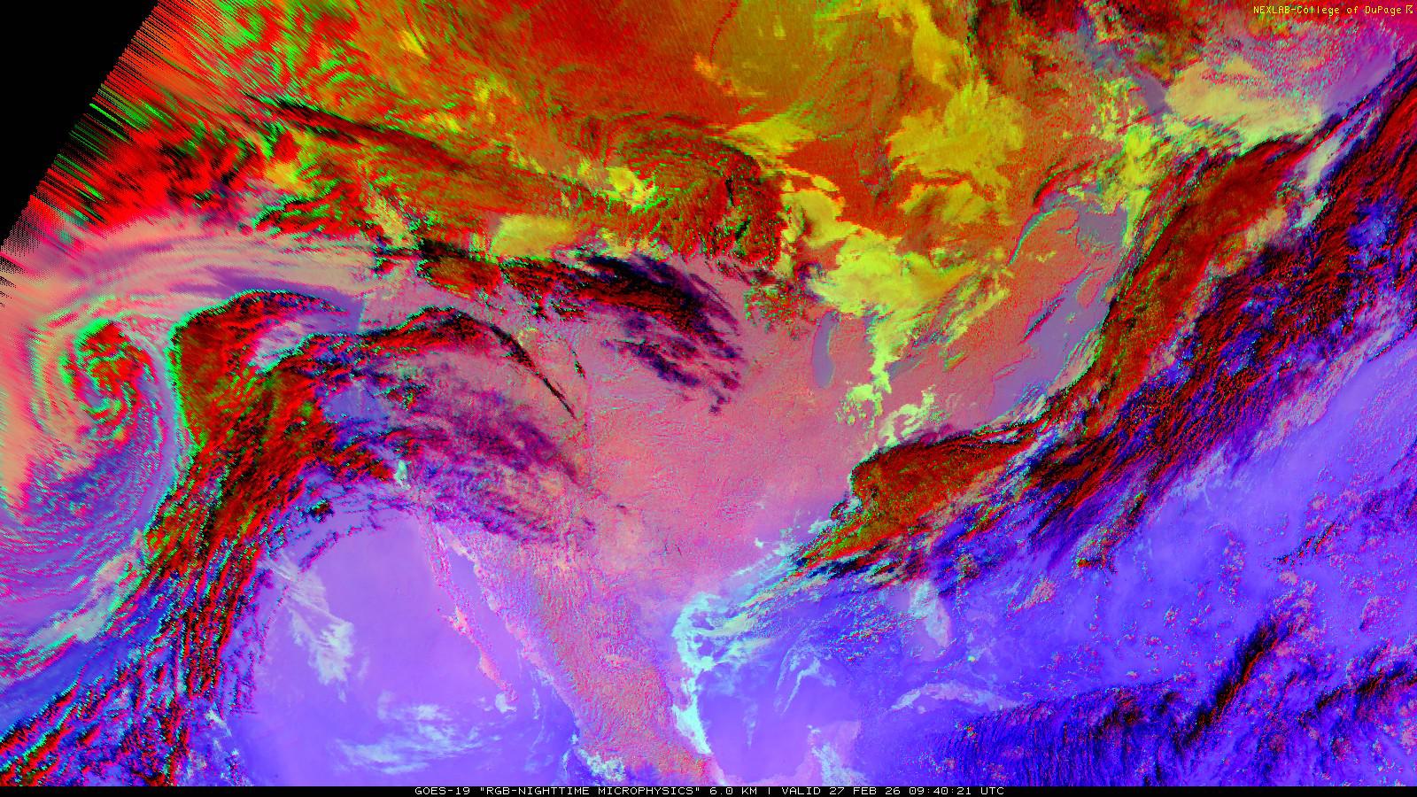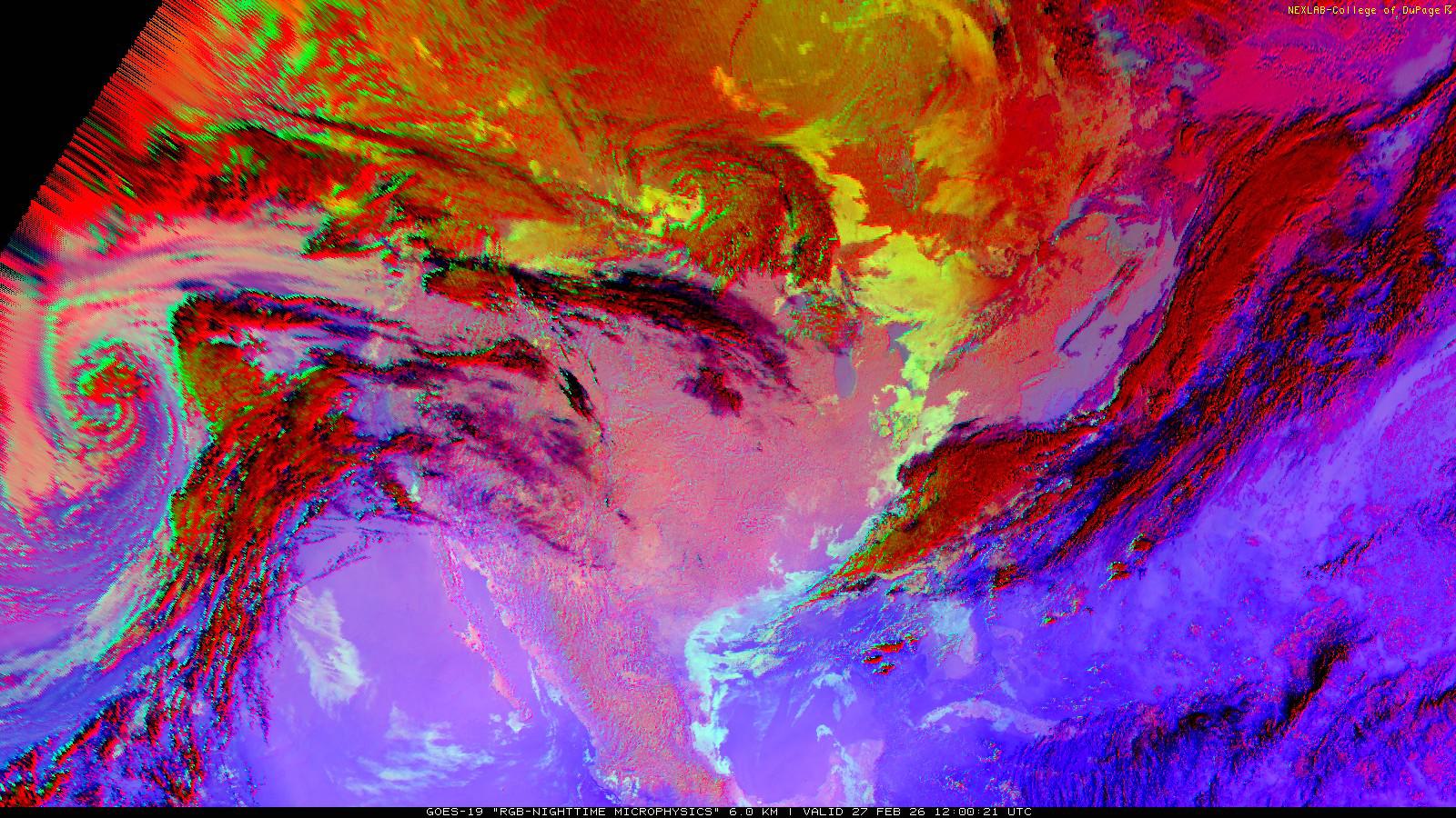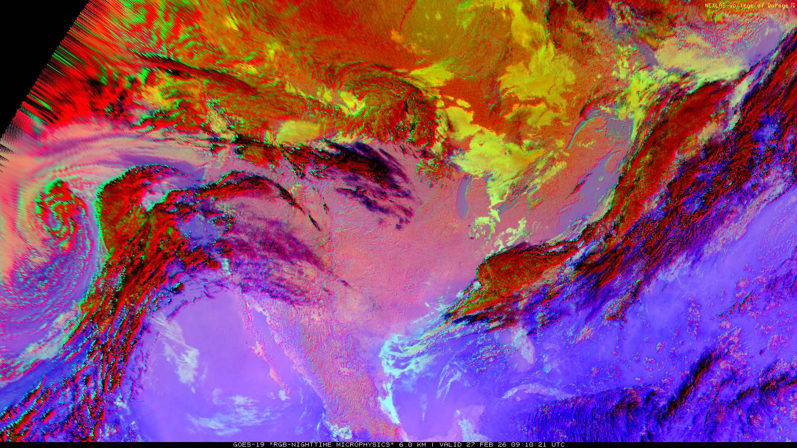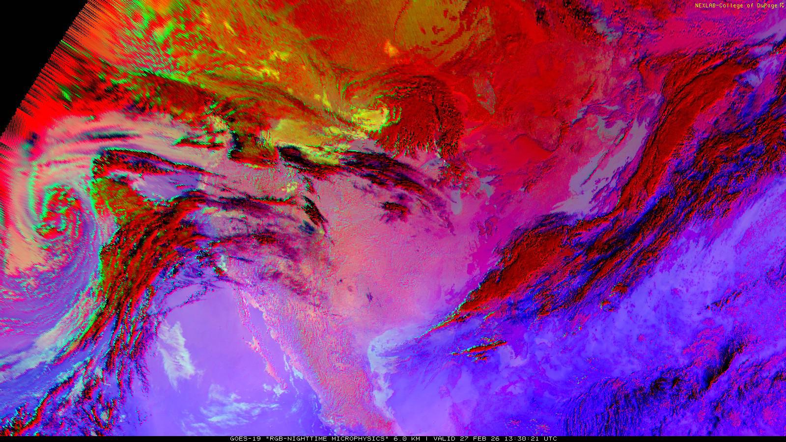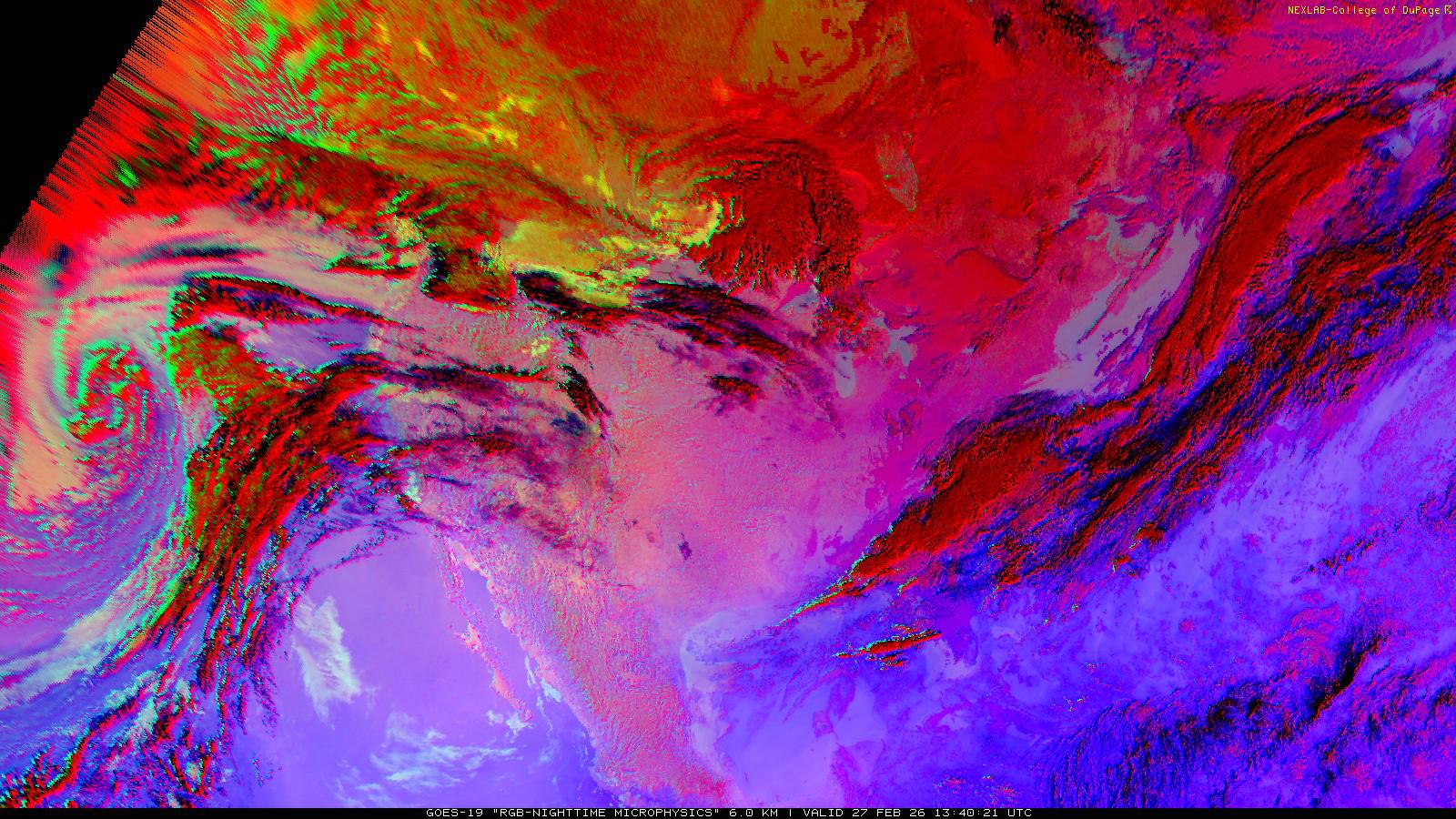 The RGB Nighttime Microphysics product is a combination of three different infrared bands. It is useful for discriminating between different cloud types, especially between low stratus clouds and fog. The ‘Red’ channel is a difference of ABI bands 15 and 13, while 'Green' is a difference of bands 13 and 7, and 'Blue' is solely being represented by ABI band 13. This product is only truly useful during the nighttime when it is dark because of the influence solar reflectance has on band 7.