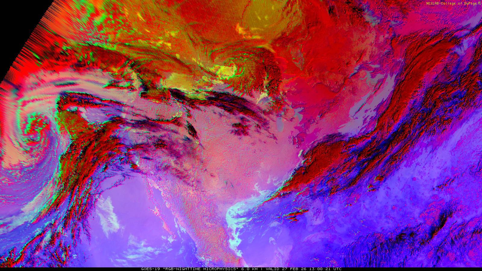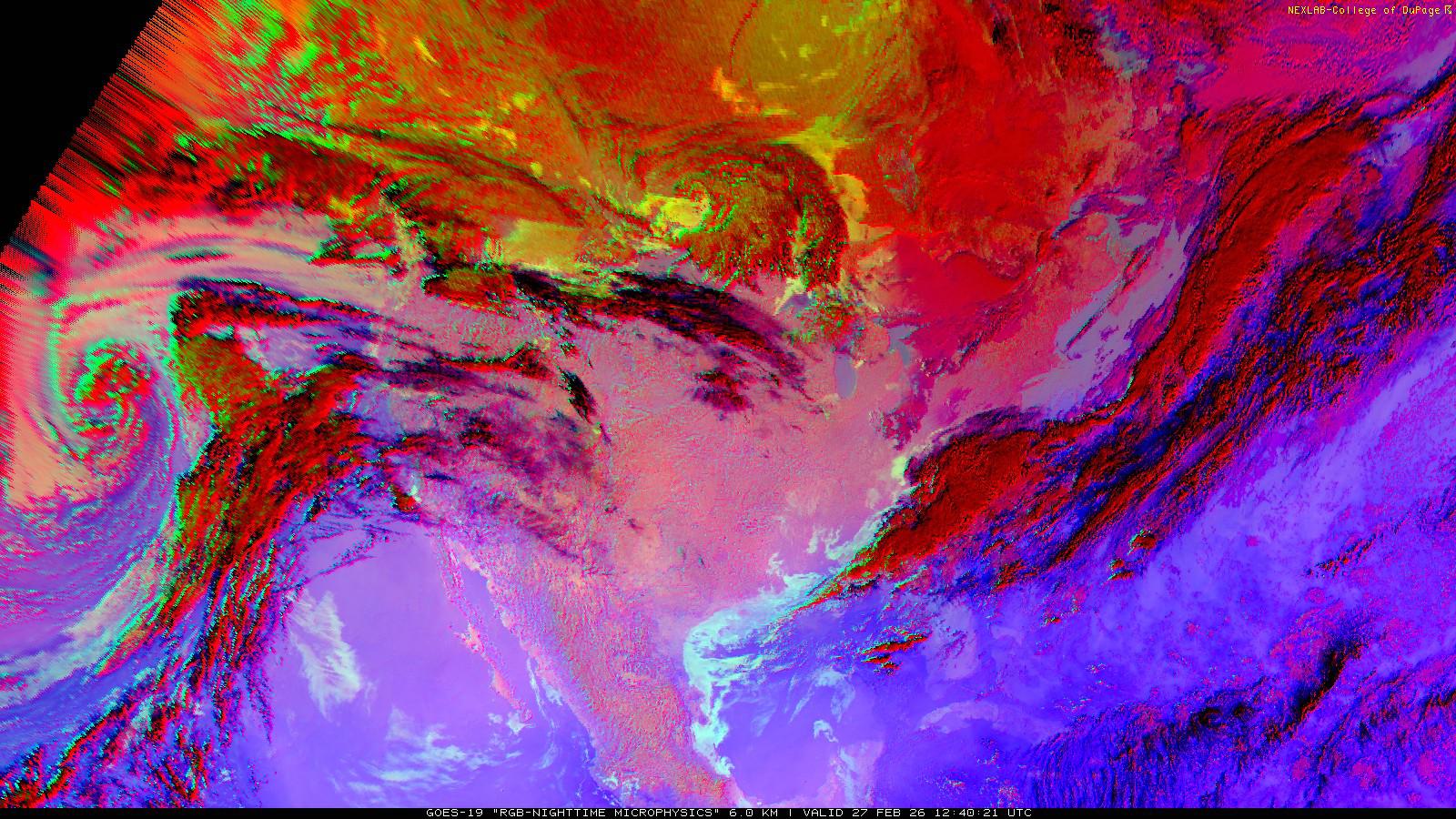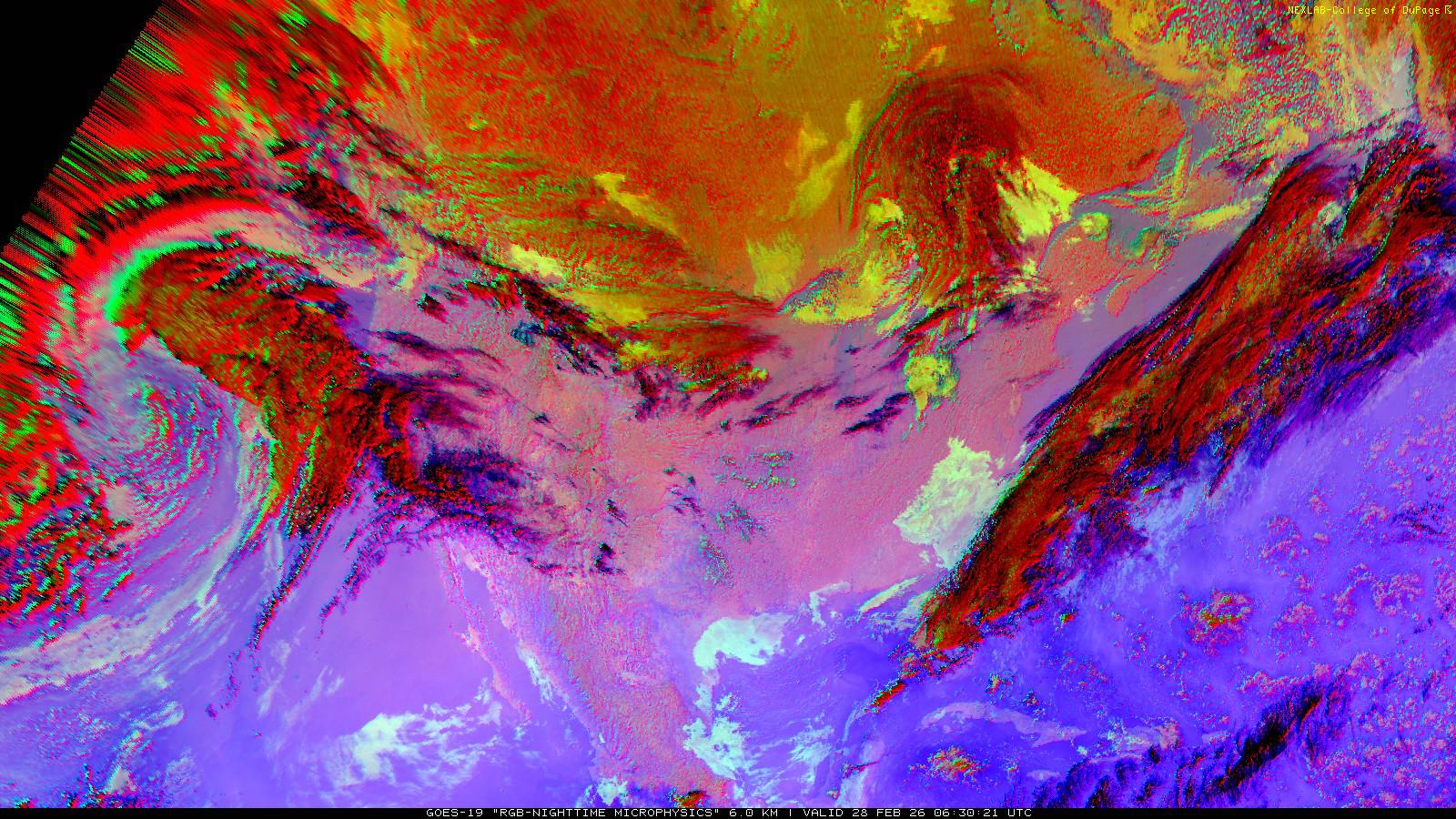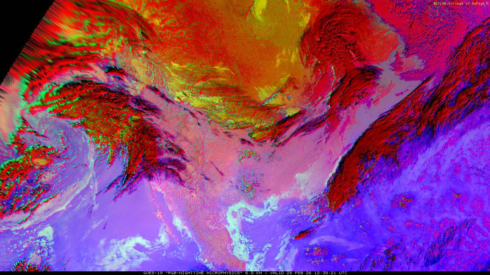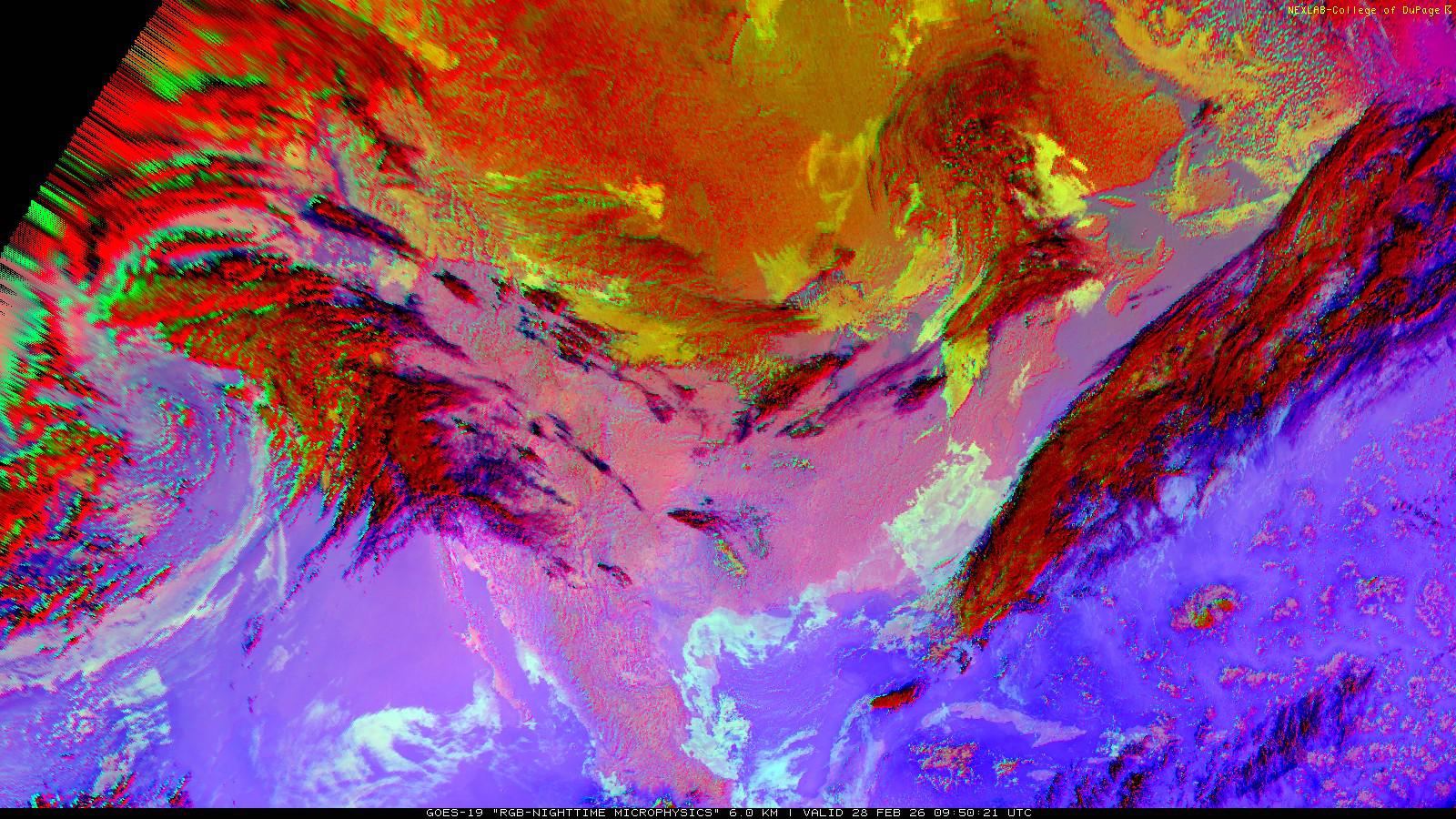 The RGB Nighttime Microphysics product is a combination of three different infrared bands. It is useful for discriminating between different cloud types, especially between low stratus clouds and fog. The ‘Red’ channel is a difference of ABI bands 15 and 13, while 'Green' is a difference of bands 13 and 7, and 'Blue' is solely being represented by ABI band 13. This product is only truly useful during the nighttime when it is dark because of the influence solar reflectance has on band 7.