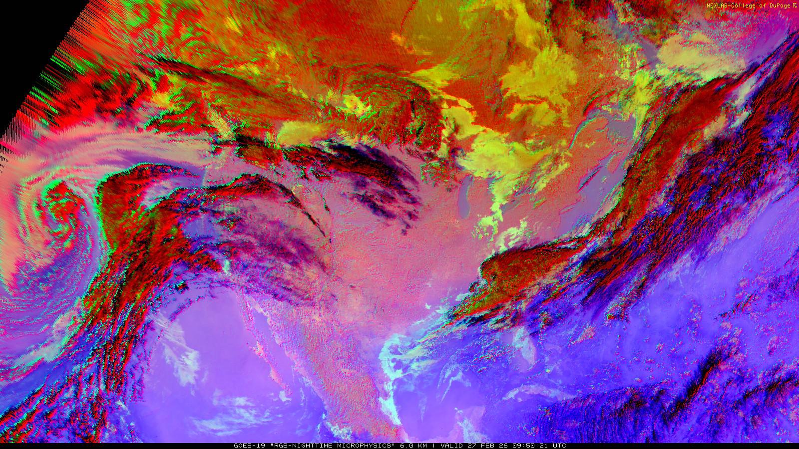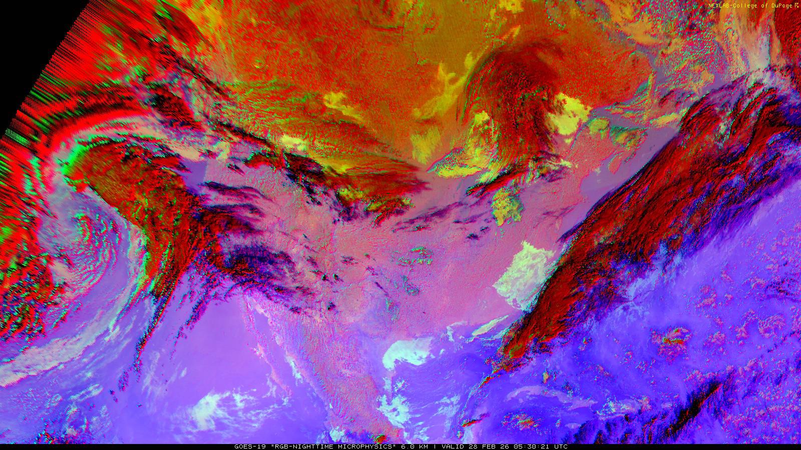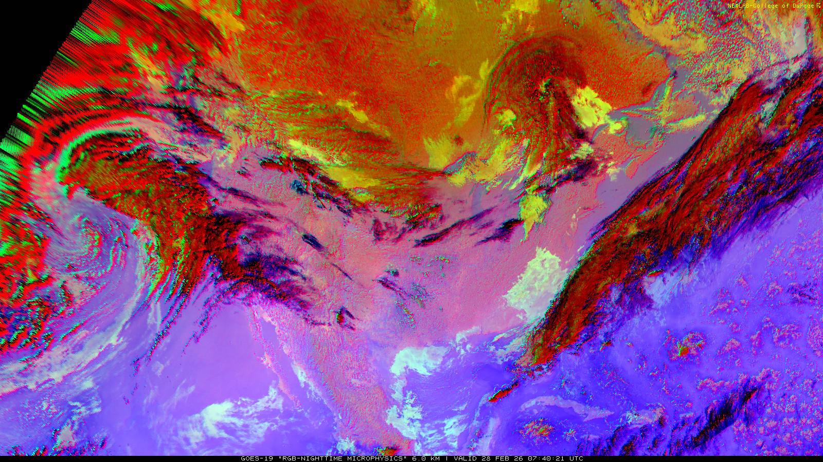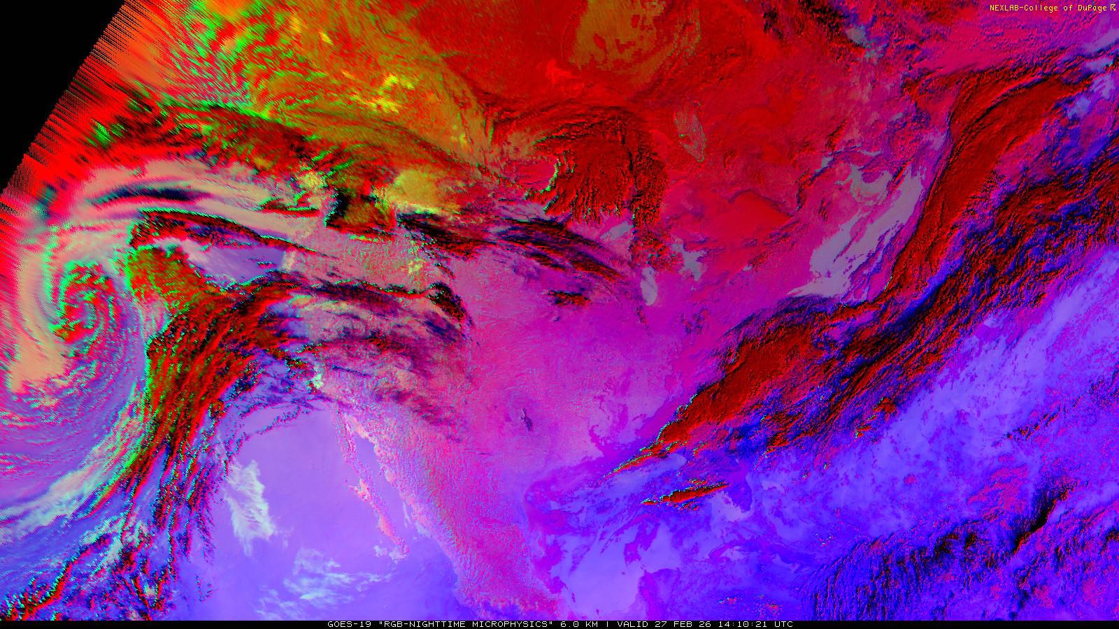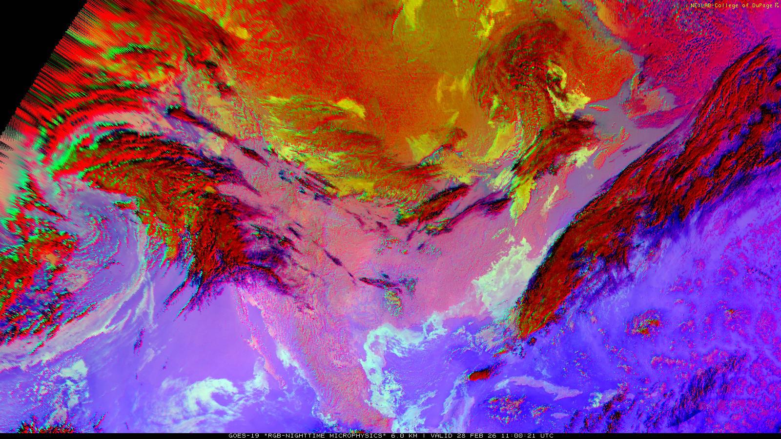 The RGB Nighttime Microphysics product is a combination of three different infrared bands. It is useful for discriminating between different cloud types, especially between low stratus clouds and fog. The ‘Red’ channel is a difference of ABI bands 15 and 13, while 'Green' is a difference of bands 13 and 7, and 'Blue' is solely being represented by ABI band 13. This product is only truly useful during the nighttime when it is dark because of the influence solar reflectance has on band 7.