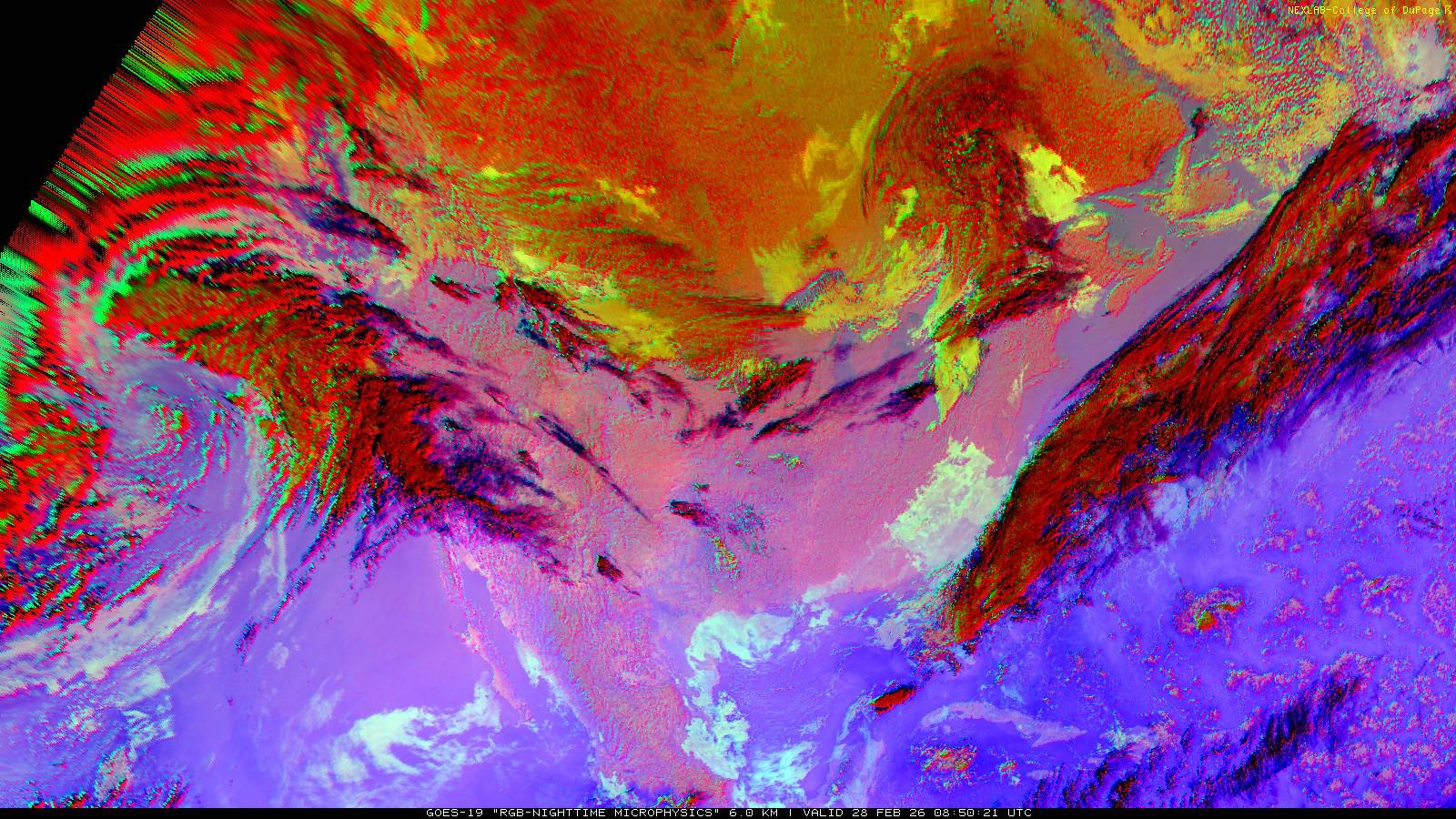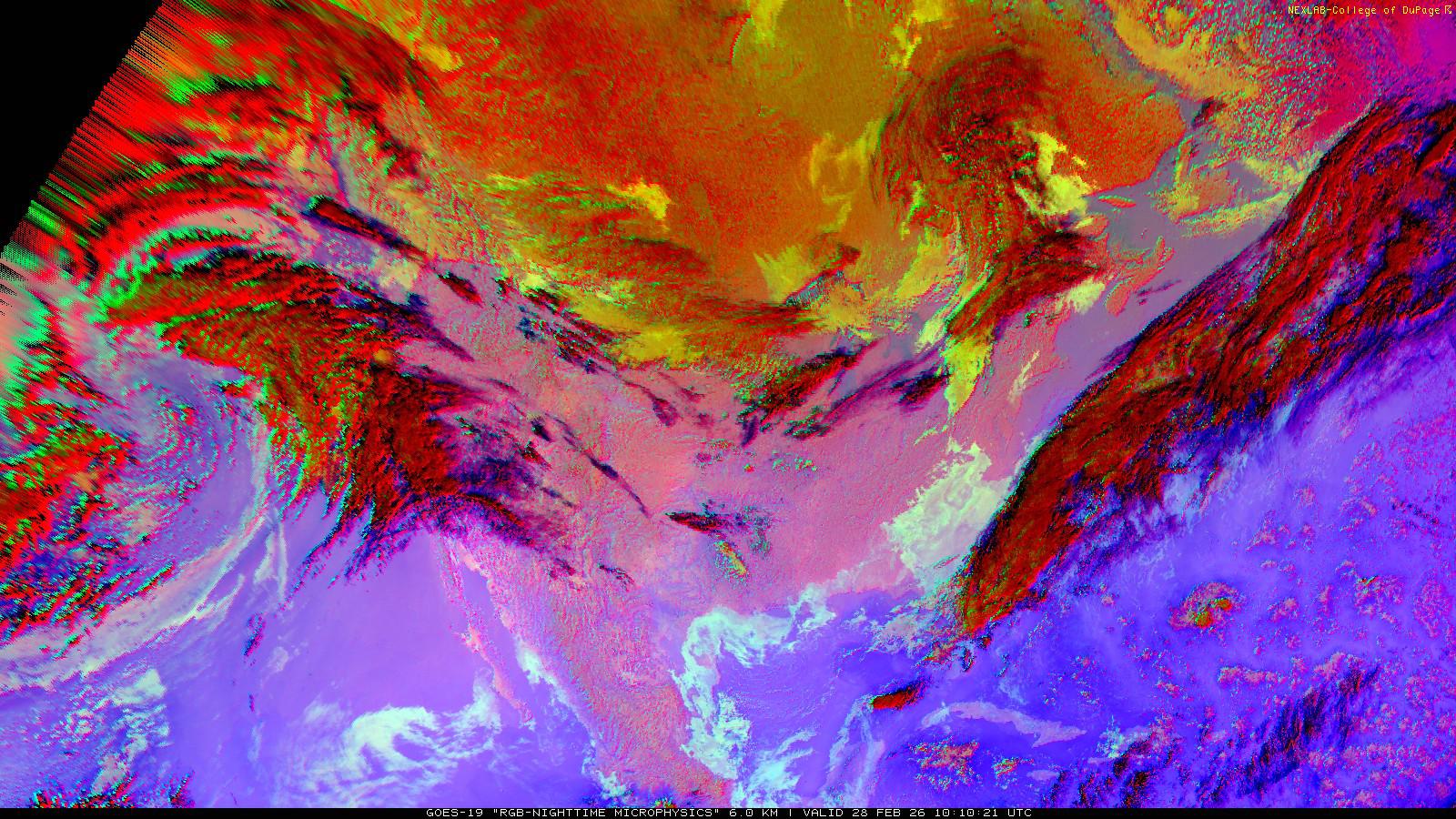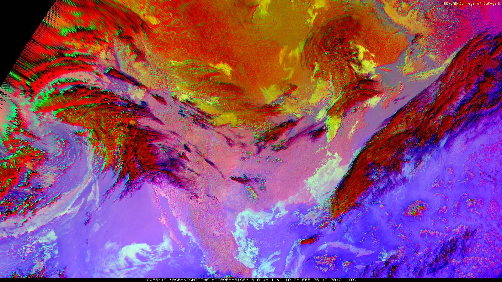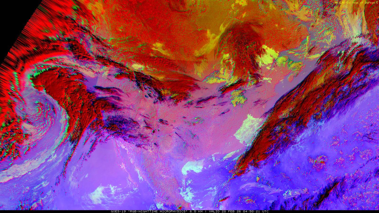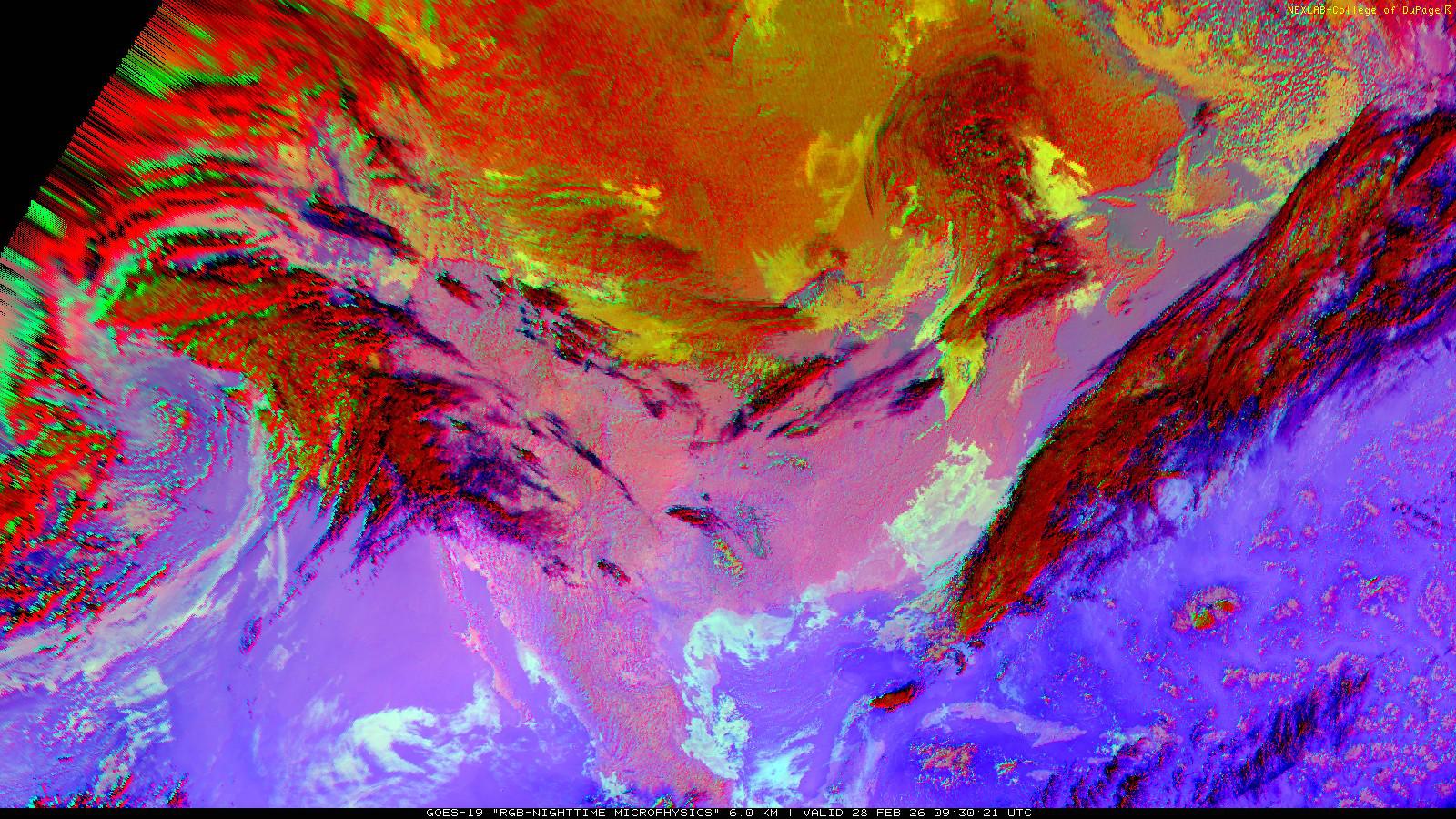 The RGB Nighttime Microphysics product is a combination of three different infrared bands. It is useful for discriminating between different cloud types, especially between low stratus clouds and fog. The ‘Red’ channel is a difference of ABI bands 15 and 13, while 'Green' is a difference of bands 13 and 7, and 'Blue' is solely being represented by ABI band 13. This product is only truly useful during the nighttime when it is dark because of the influence solar reflectance has on band 7.