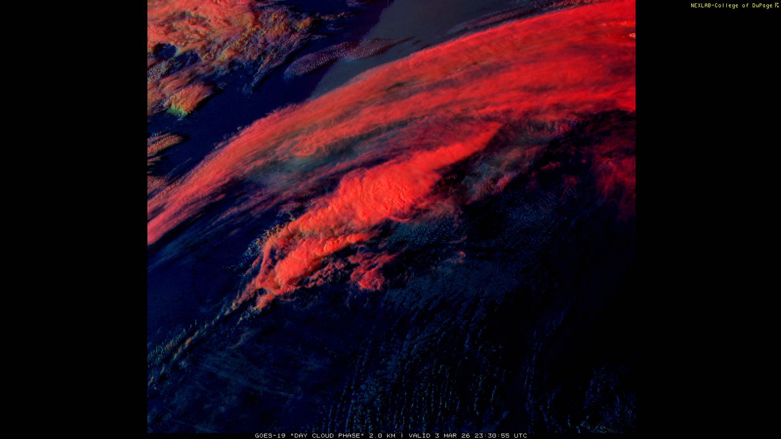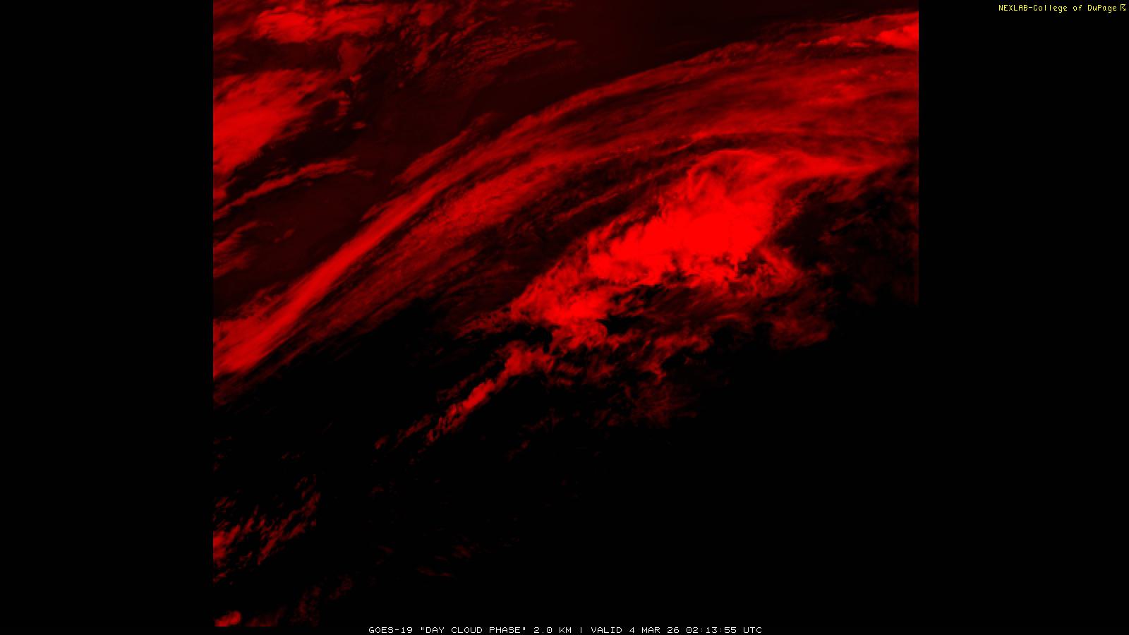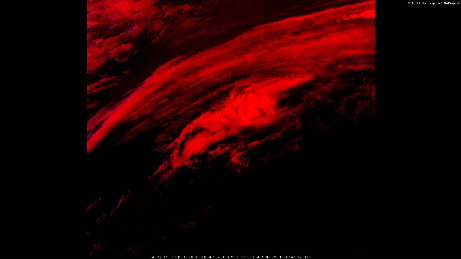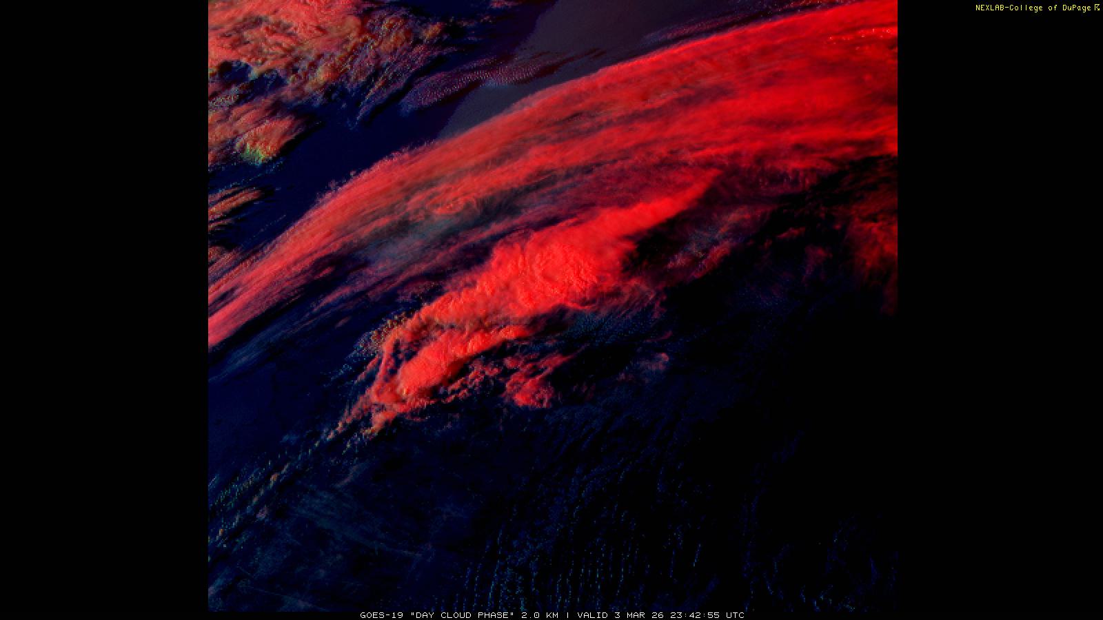 The Day Cloud Phase RGB product is designed to help distinguish between surface features and cloud types. Bare land surface will typically appear dark blue, although snow cover will show as green. Clouds comprised of liquid water will be light blue or aqua in color. And ice clouds will appear yellow/orange/reddish in color, depending on their content as well as time of day. This product is a combination of one infrared band (ABI band 13), one visible band (ABI band 02) and one near-infrared band (ABI band 05). These three ABI bands make up the Red, Green and Blue channels respectively. Because of the visible and near-infrared bands, this product is only useful during the daytime.