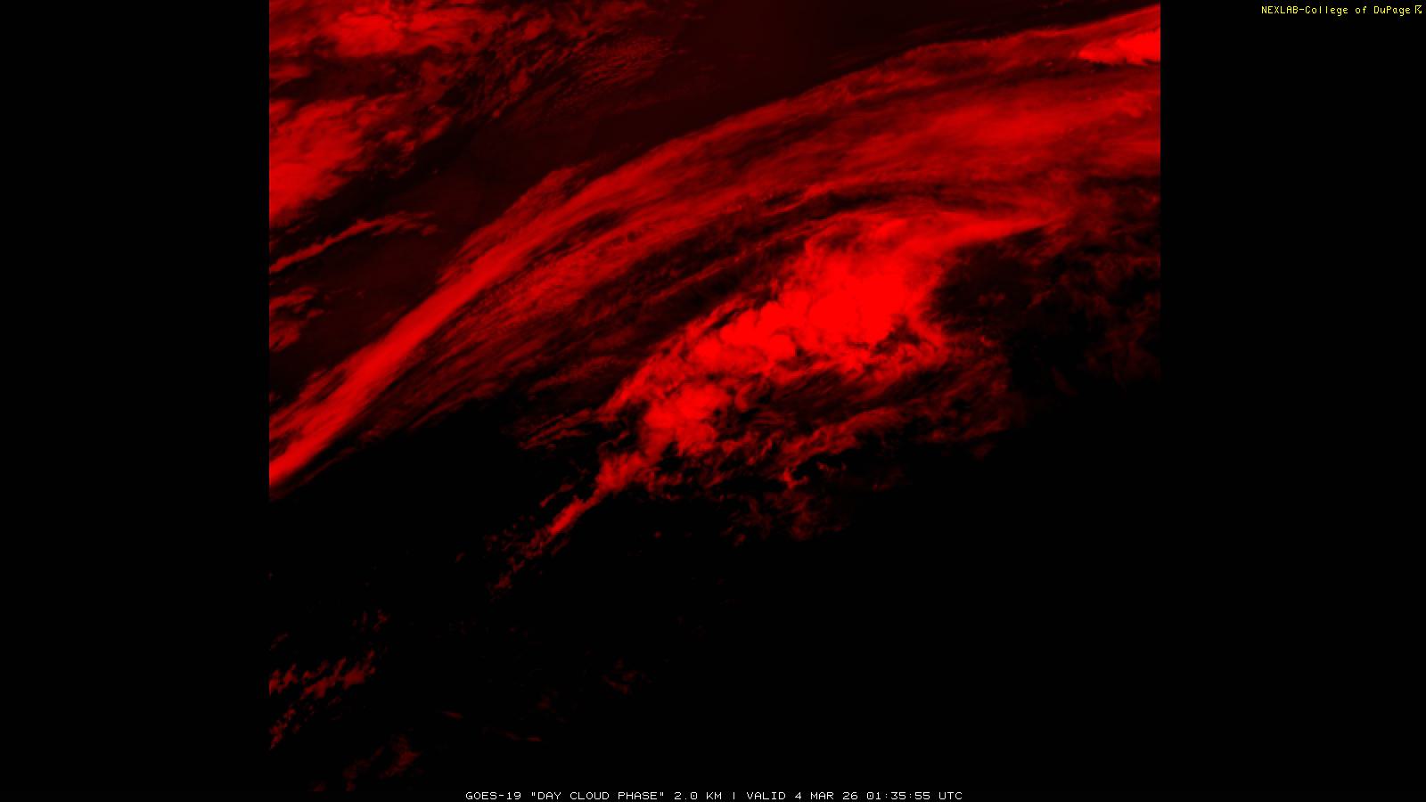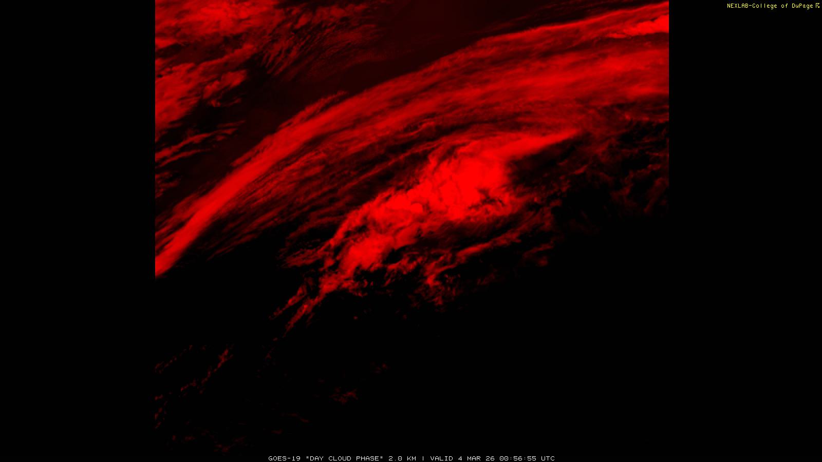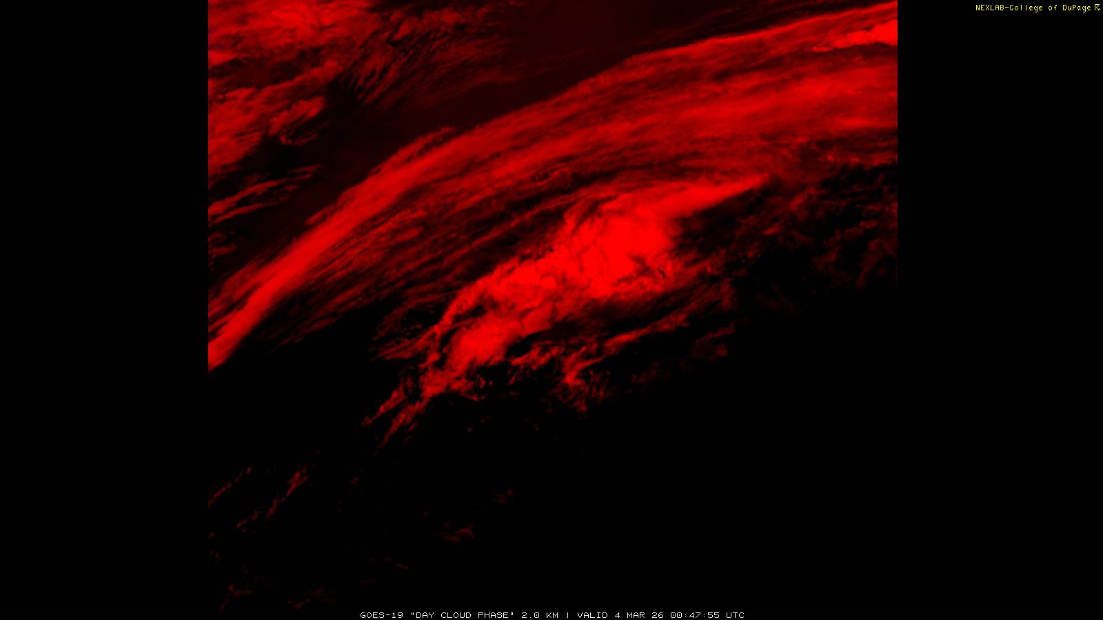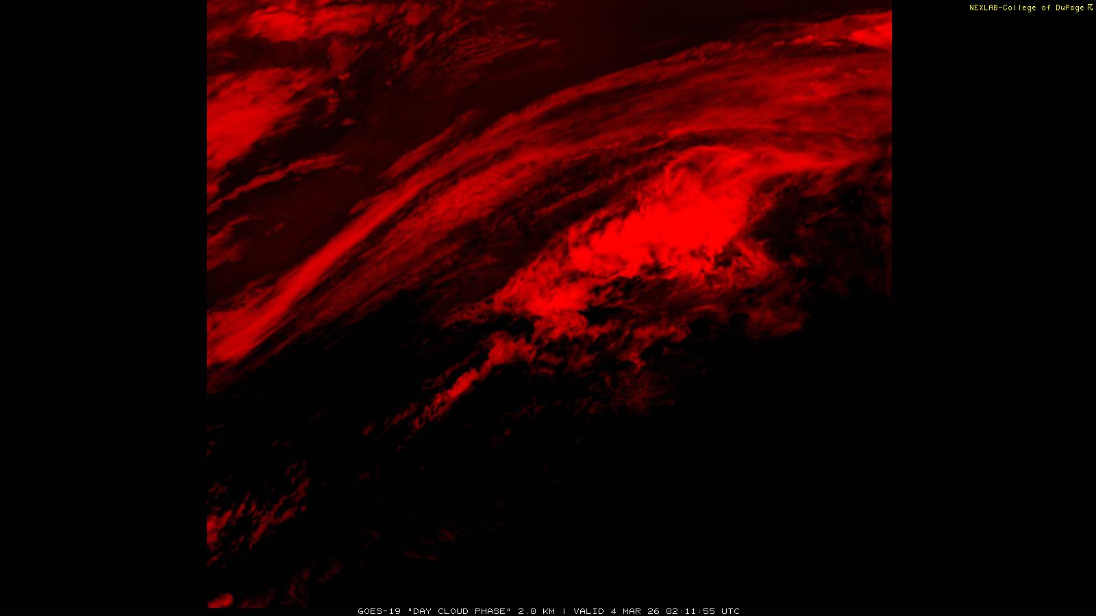 The Day Cloud Phase RGB product is designed to help distinguish between surface features and cloud types. Bare land surface will typically appear dark blue, although snow cover will show as green. Clouds comprised of liquid water will be light blue or aqua in color. And ice clouds will appear yellow/orange/reddish in color, depending on their content as well as time of day. This product is a combination of one infrared band (ABI band 13), one visible band (ABI band 02) and one near-infrared band (ABI band 05). These three ABI bands make up the Red, Green and Blue channels respectively. Because of the visible and near-infrared bands, this product is only useful during the daytime.