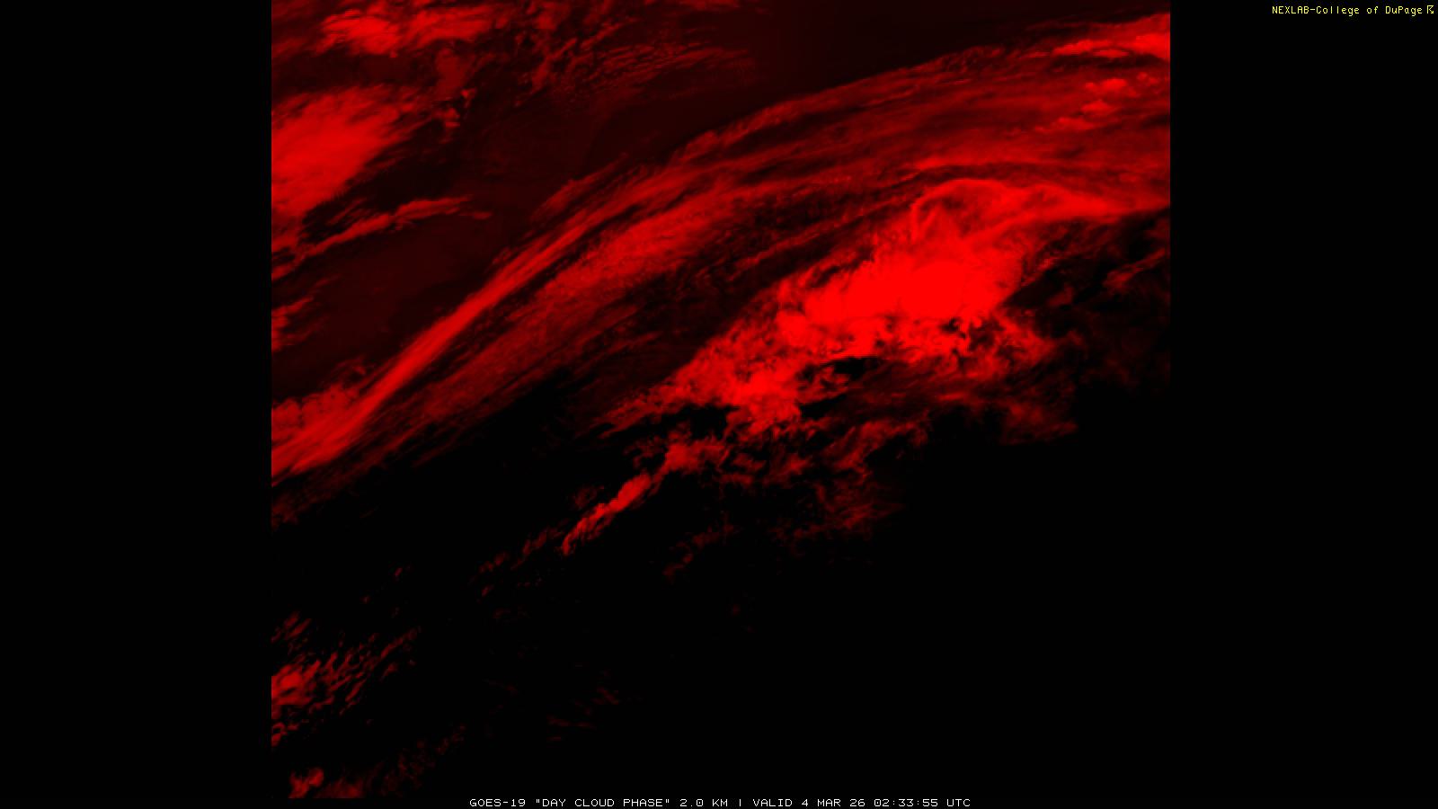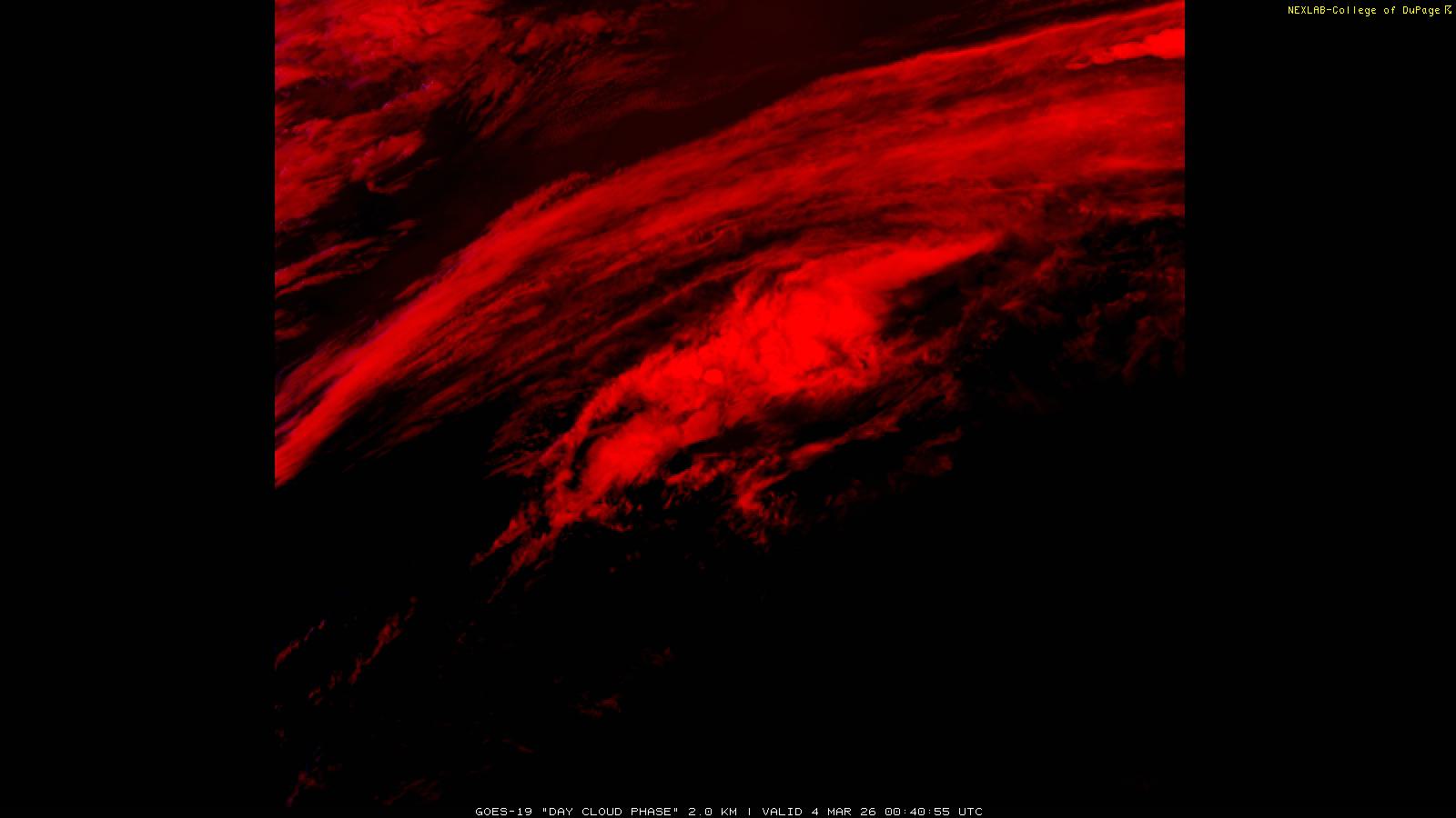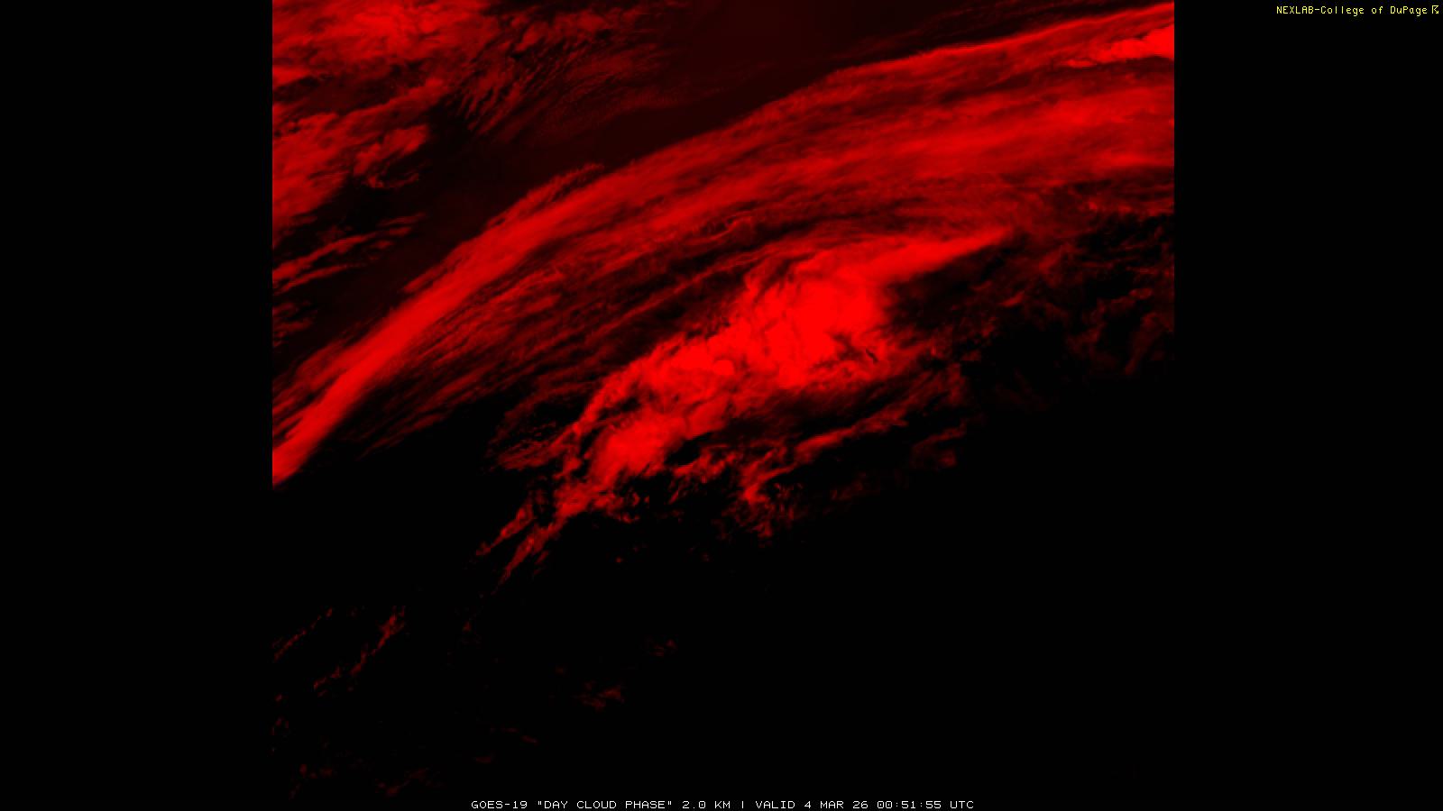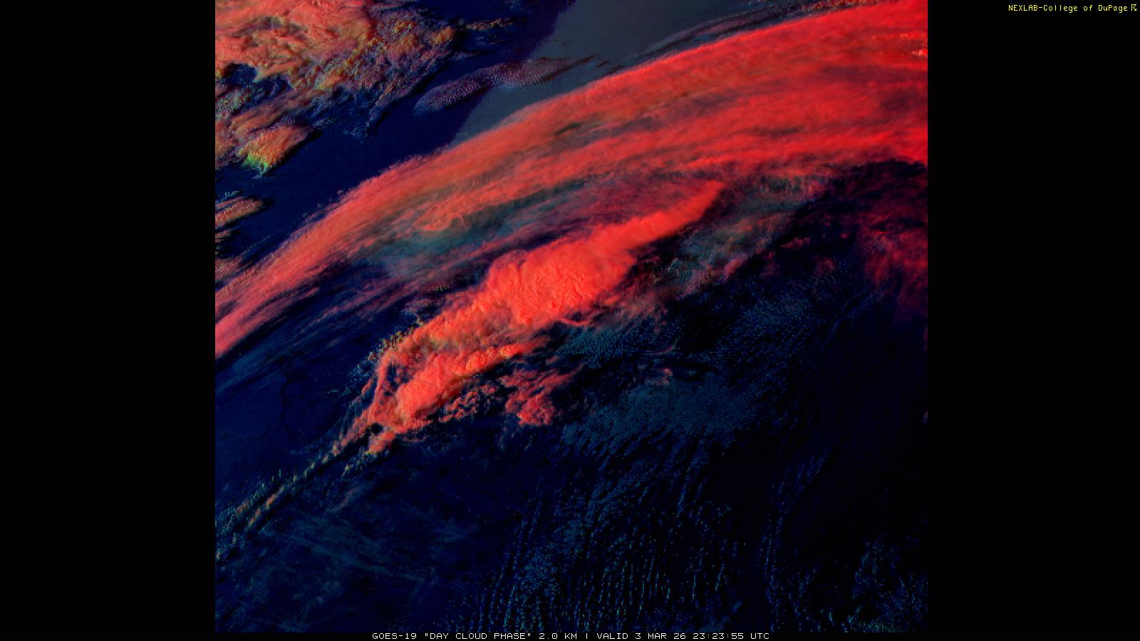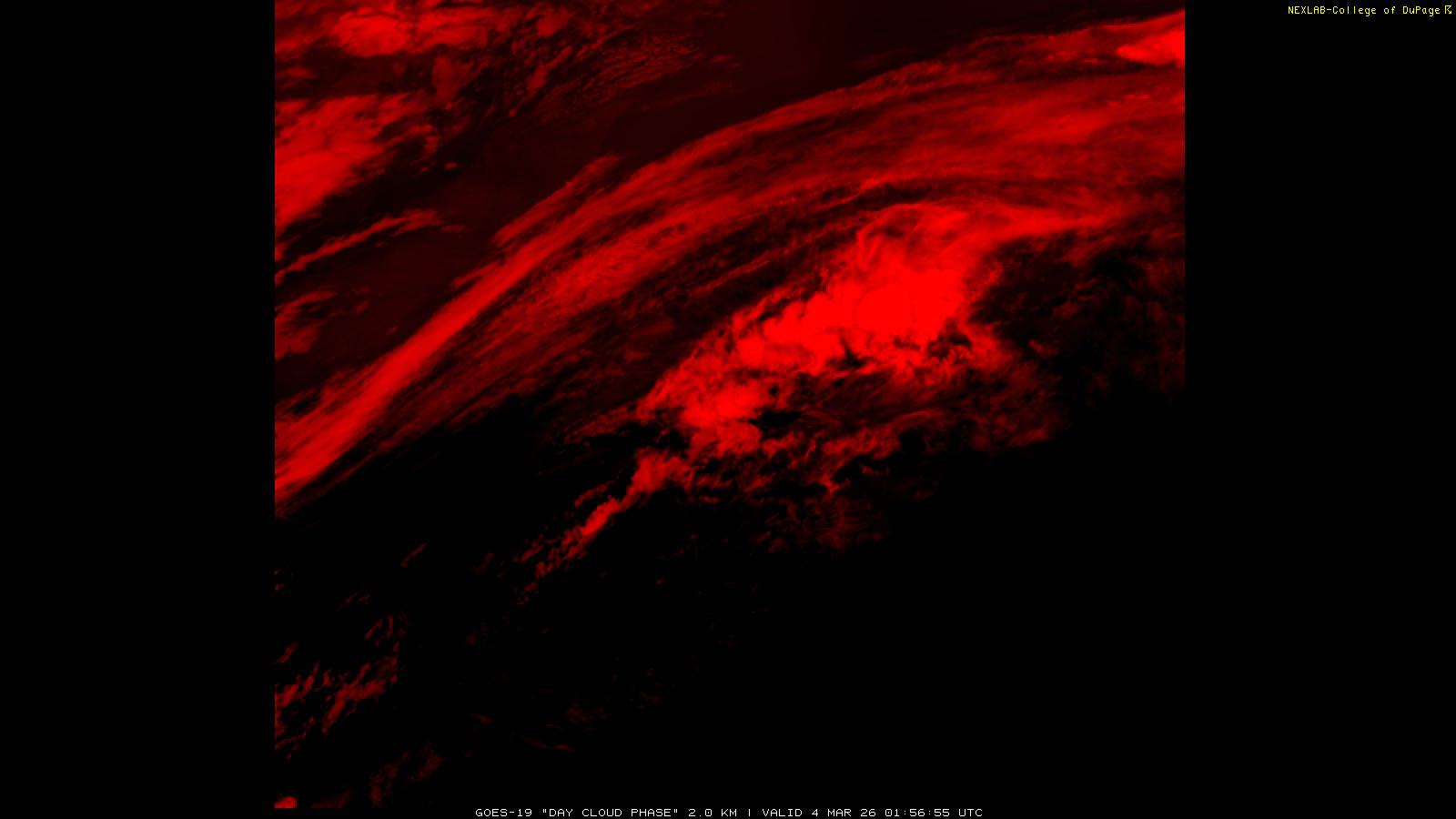 The Day Cloud Phase RGB product is designed to help distinguish between surface features and cloud types. Bare land surface will typically appear dark blue, although snow cover will show as green. Clouds comprised of liquid water will be light blue or aqua in color. And ice clouds will appear yellow/orange/reddish in color, depending on their content as well as time of day. This product is a combination of one infrared band (ABI band 13), one visible band (ABI band 02) and one near-infrared band (ABI band 05). These three ABI bands make up the Red, Green and Blue channels respectively. Because of the visible and near-infrared bands, this product is only useful during the daytime.