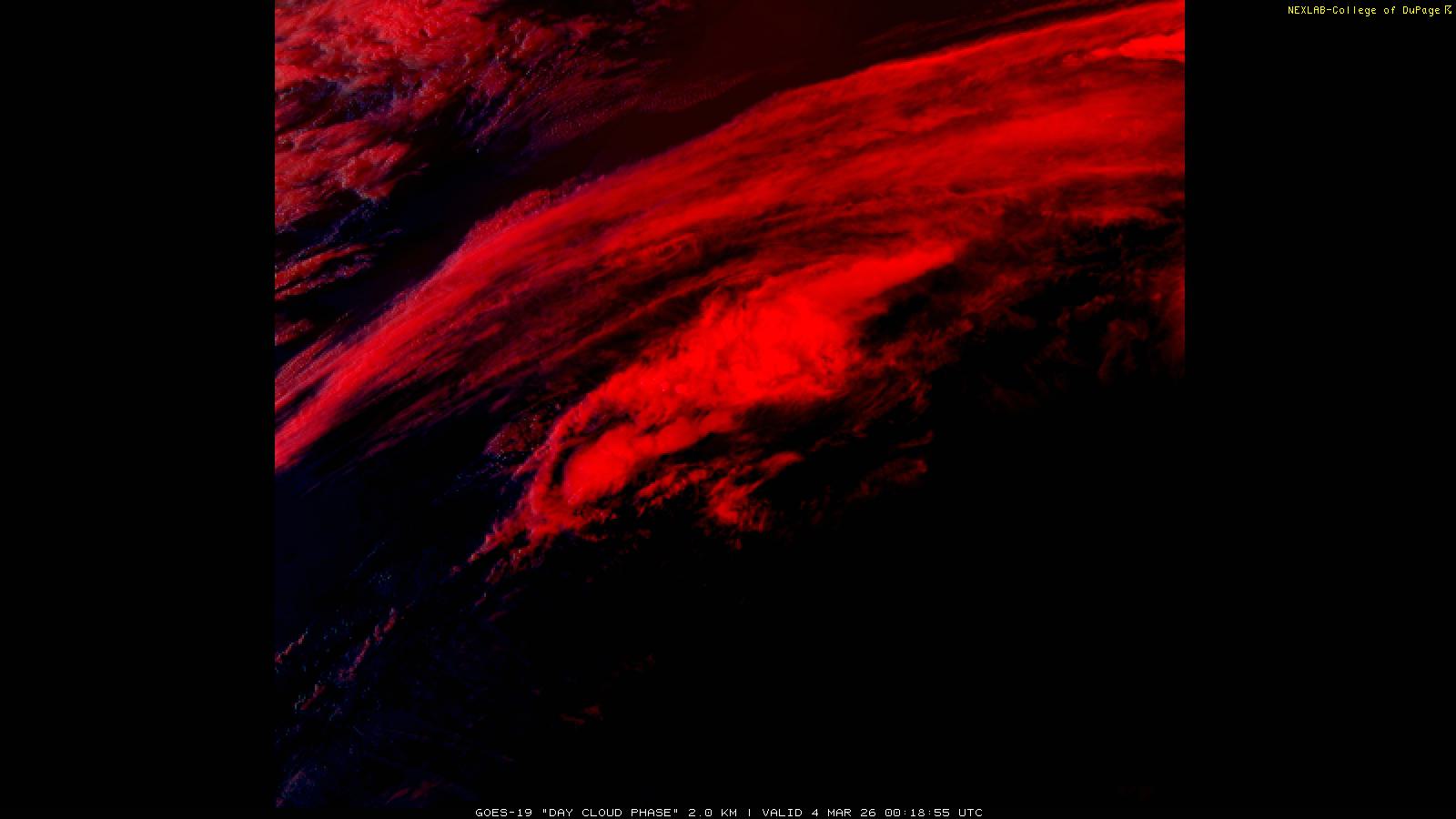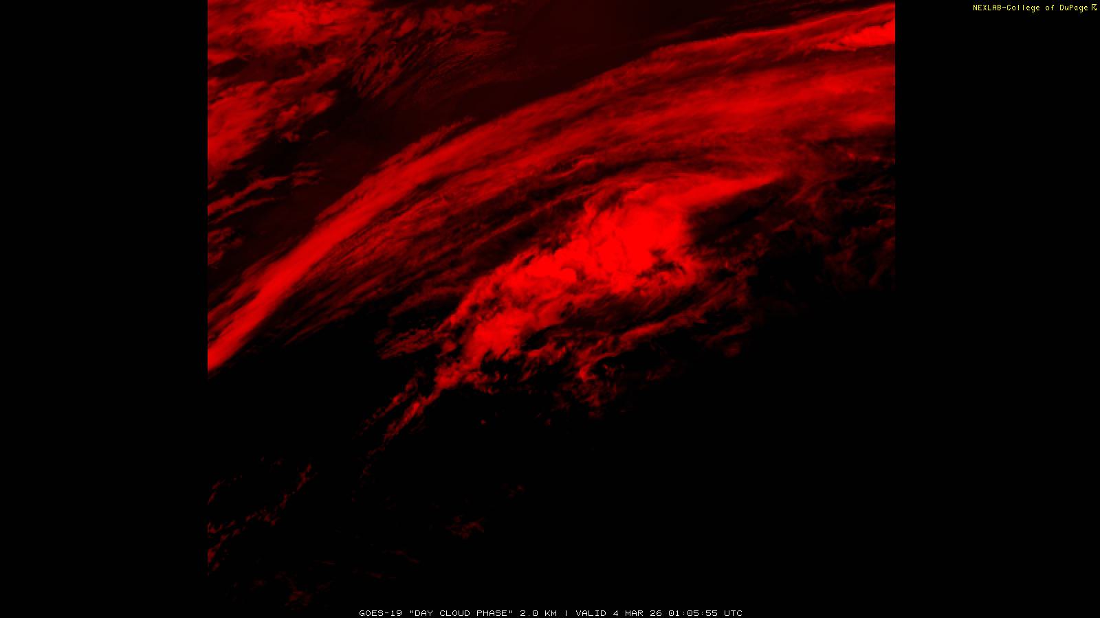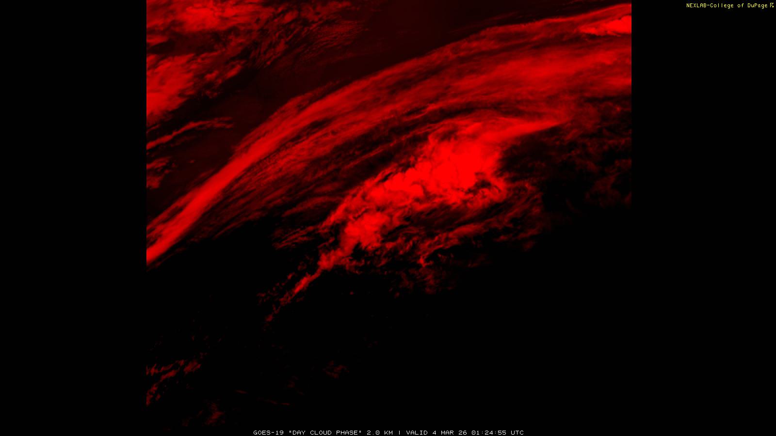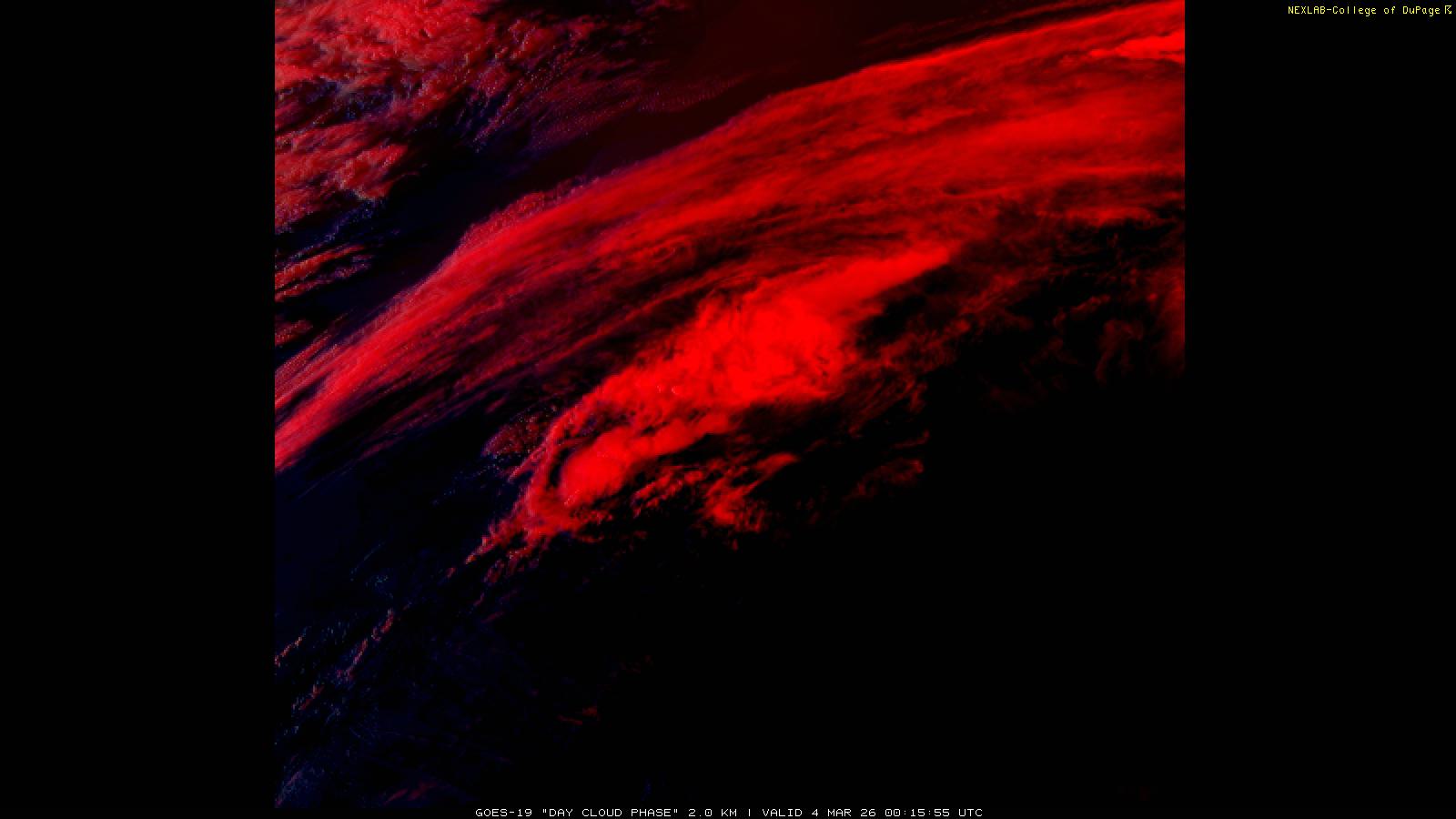 The Day Cloud Phase RGB product is designed to help distinguish between surface features and cloud types. Bare land surface will typically appear dark blue, although snow cover will show as green. Clouds comprised of liquid water will be light blue or aqua in color. And ice clouds will appear yellow/orange/reddish in color, depending on their content as well as time of day. This product is a combination of one infrared band (ABI band 13), one visible band (ABI band 02) and one near-infrared band (ABI band 05). These three ABI bands make up the Red, Green and Blue channels respectively. Because of the visible and near-infrared bands, this product is only useful during the daytime.