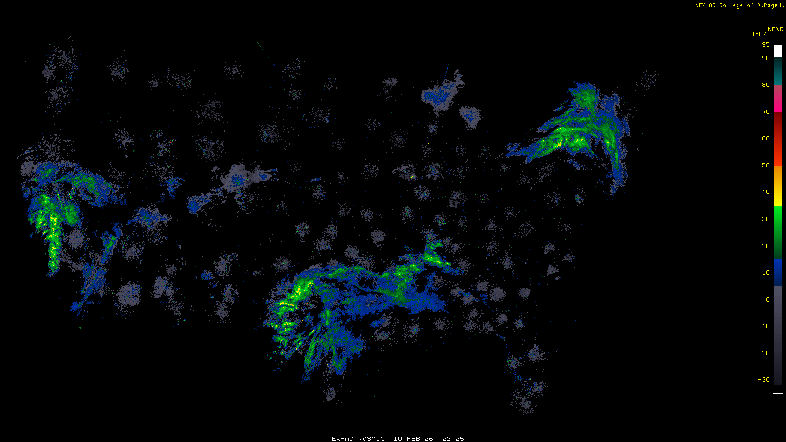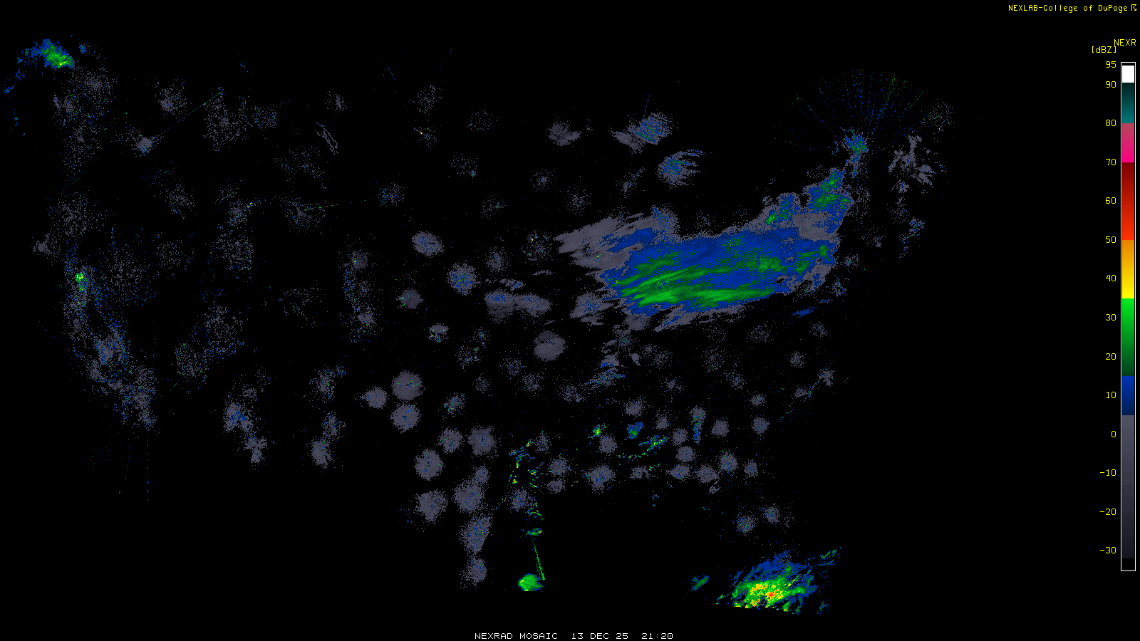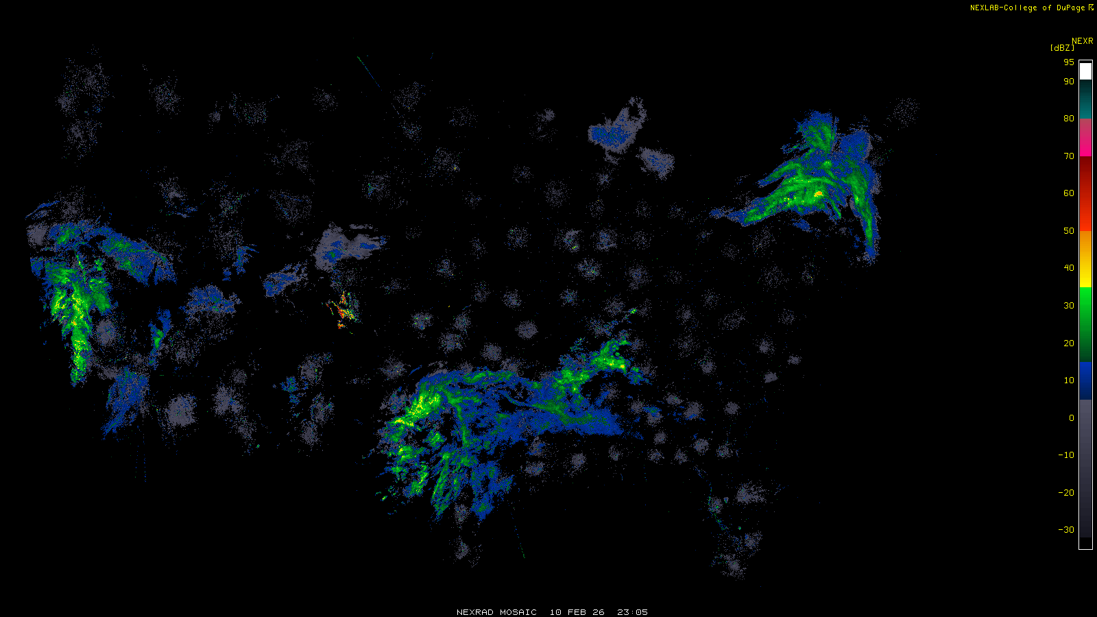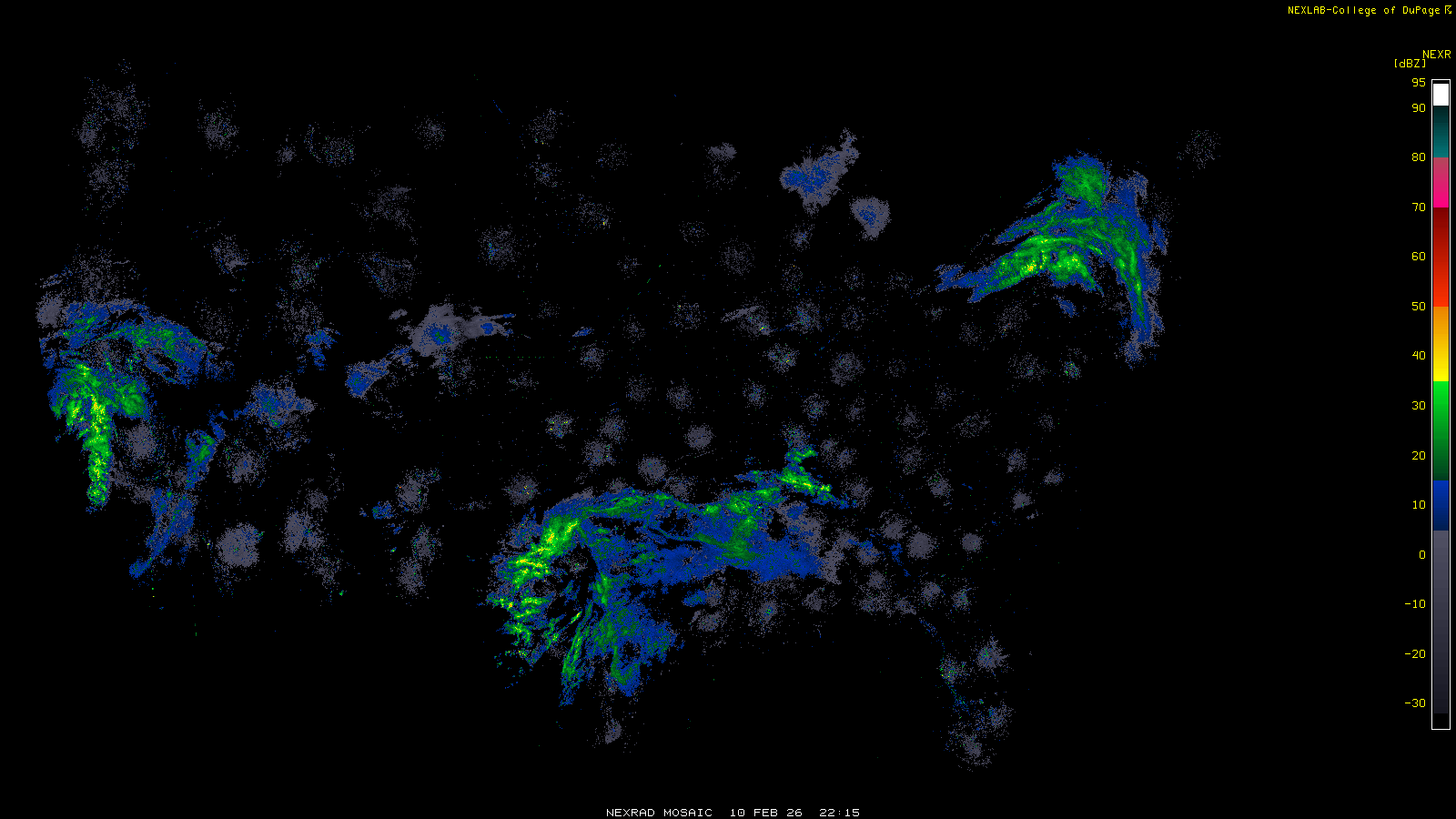 This imagery is a of composite stitch of NEXRAD base reflectivity data from individual sites across the domain of the satellite sector currently being viewed. For further details about the base reflectivity product, see the Product Description for any Base Reflectivity product on our NEXRAD page.