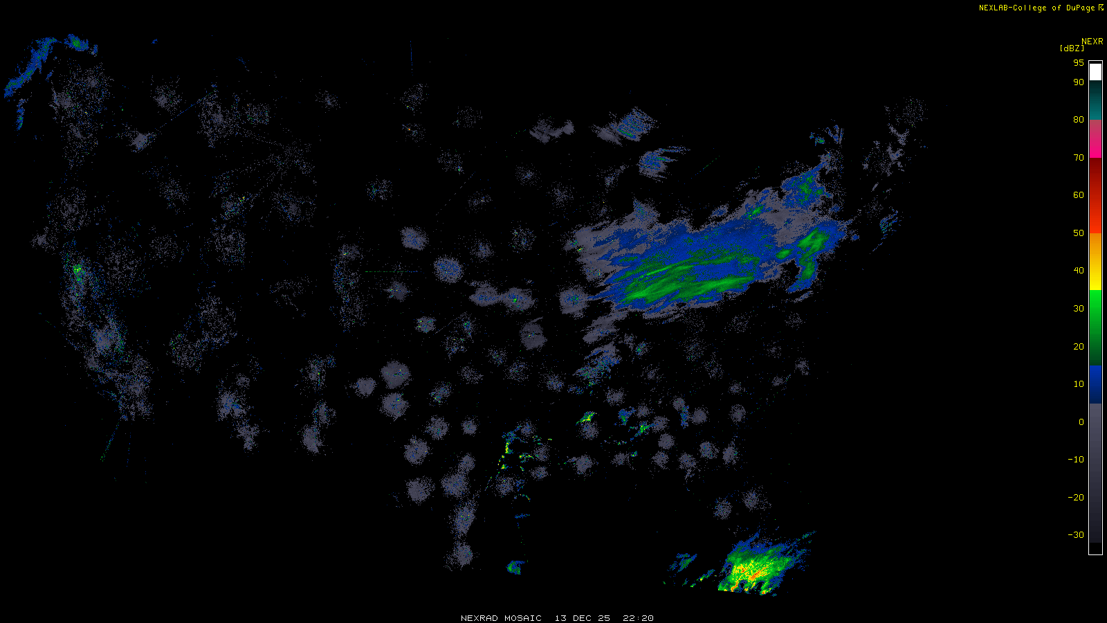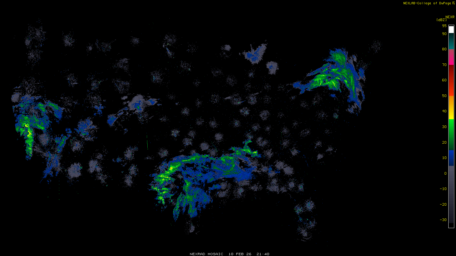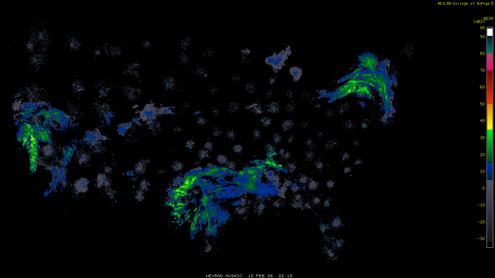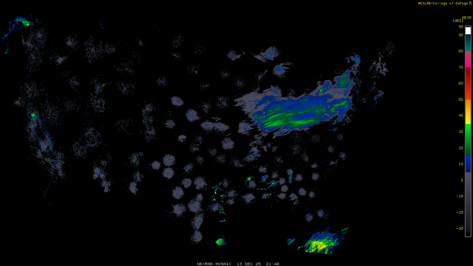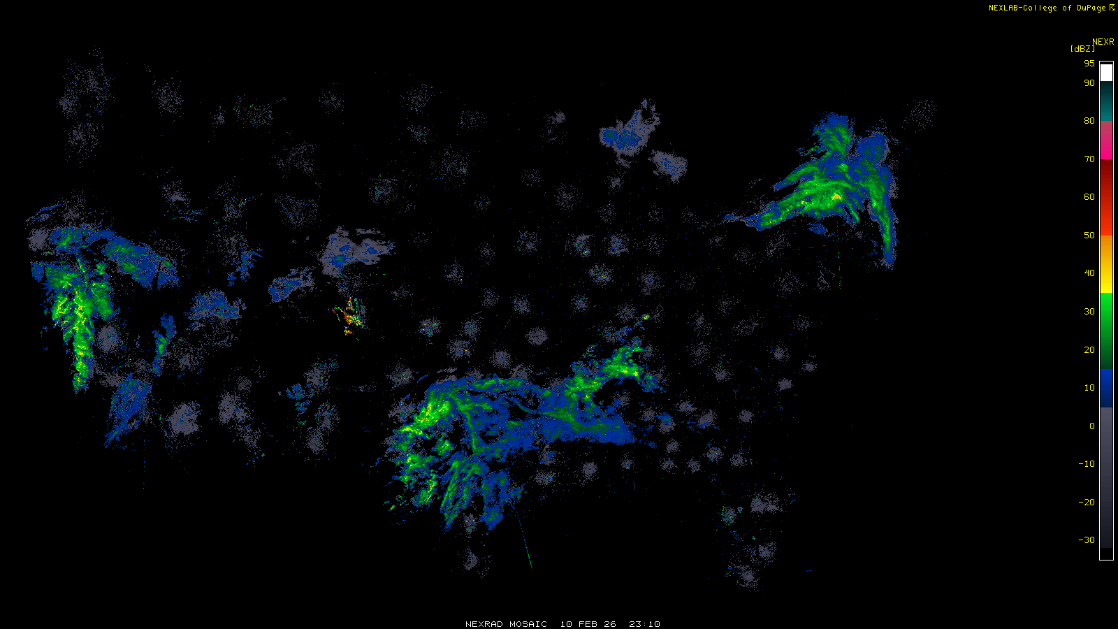 This imagery is a of composite stitch of NEXRAD base reflectivity data from individual sites across the domain of the satellite sector currently being viewed. For further details about the base reflectivity product, see the Product Description for any Base Reflectivity product on our NEXRAD page.