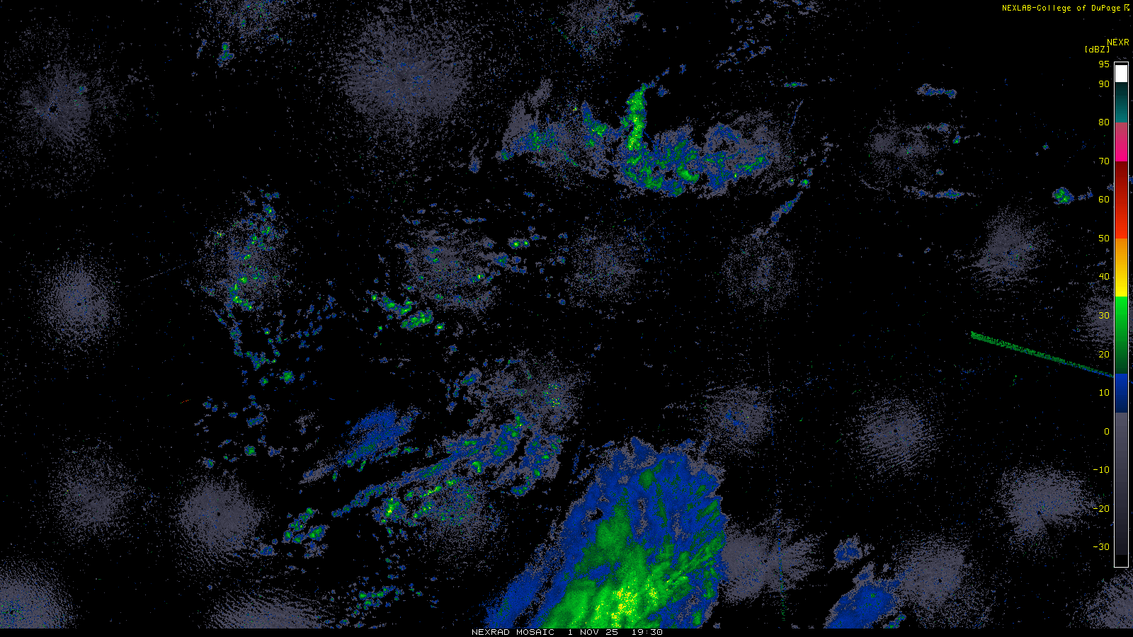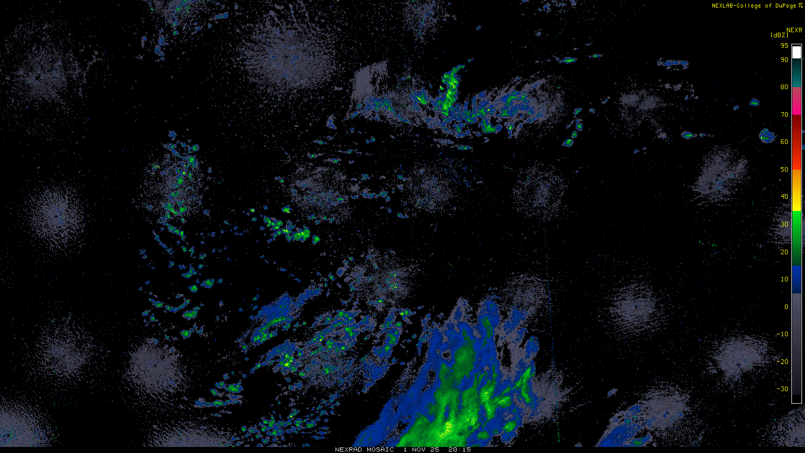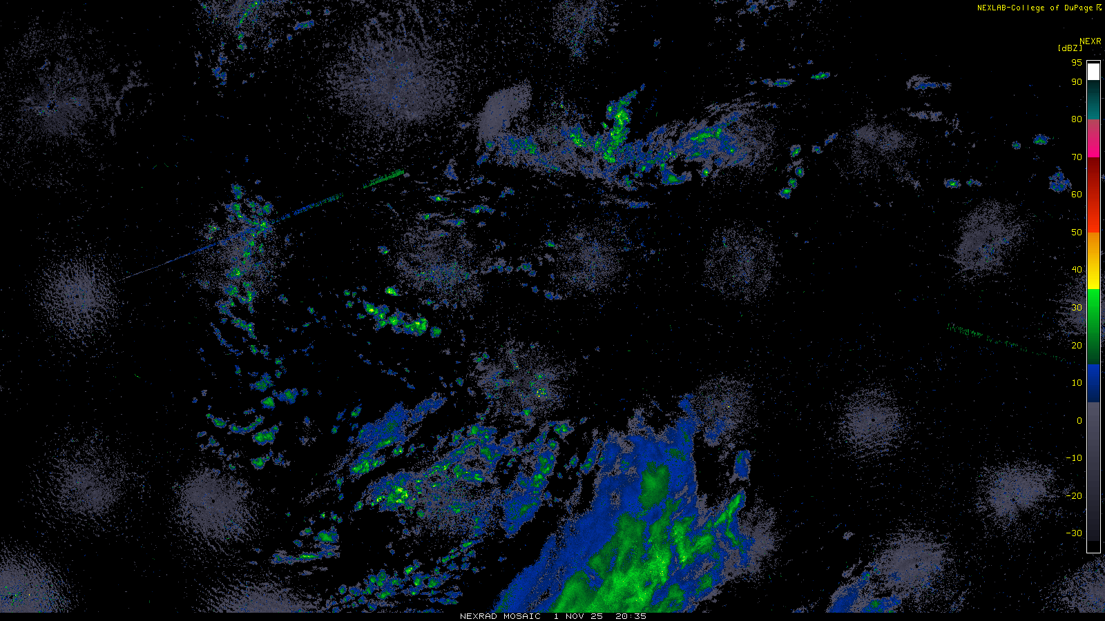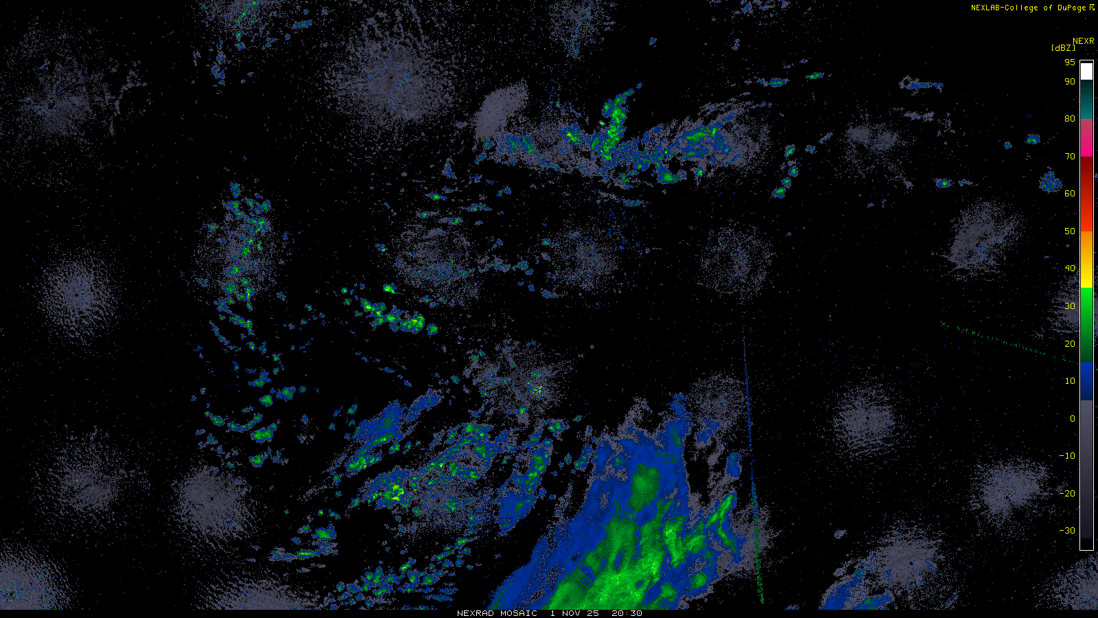 This imagery is a of composite stitch of NEXRAD base reflectivity data from individual sites across the domain of the satellite sector currently being viewed. For further details about the base reflectivity product, see the Product Description for any Base Reflectivity product on our NEXRAD page.