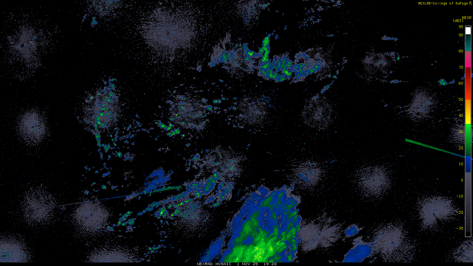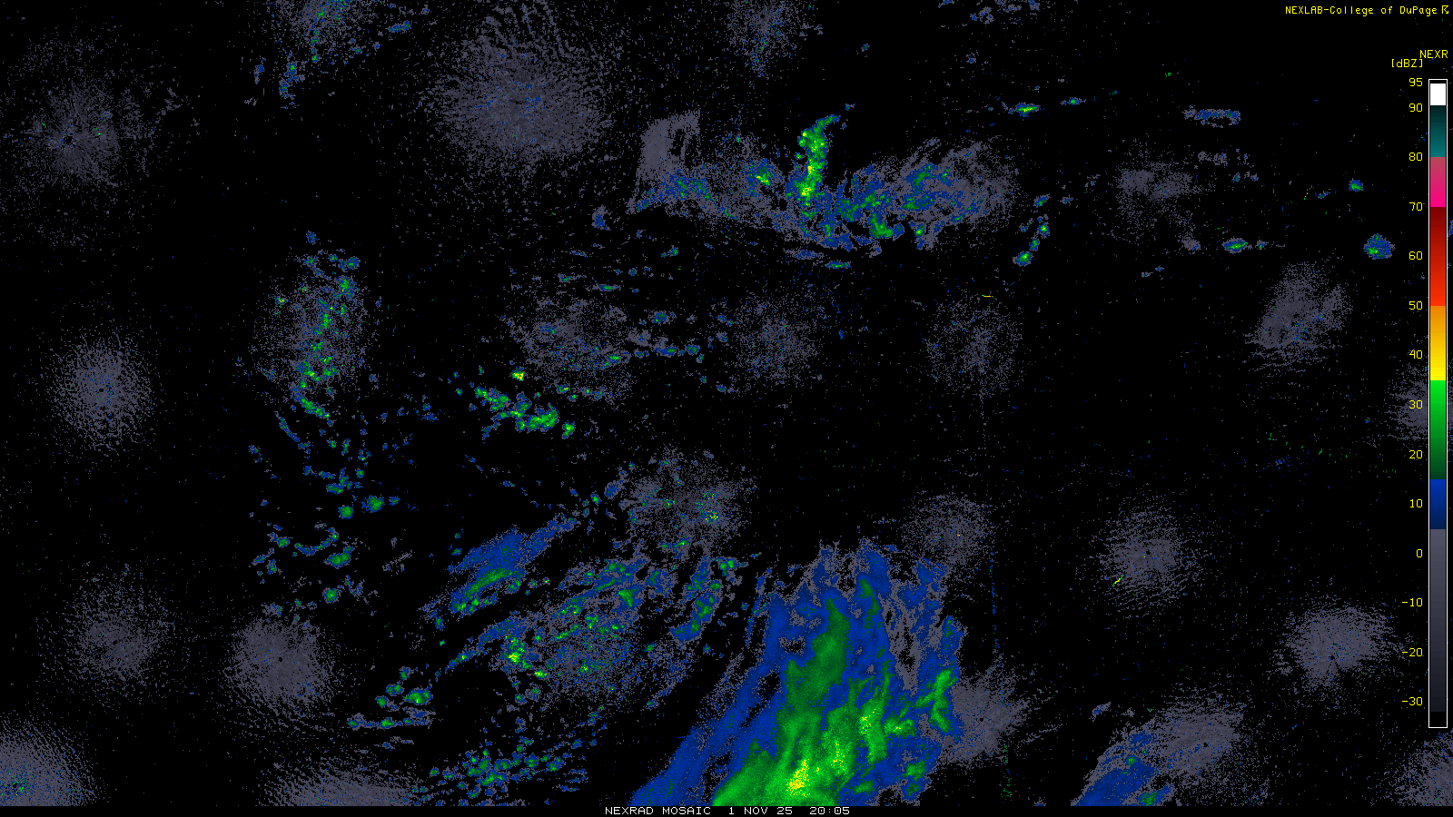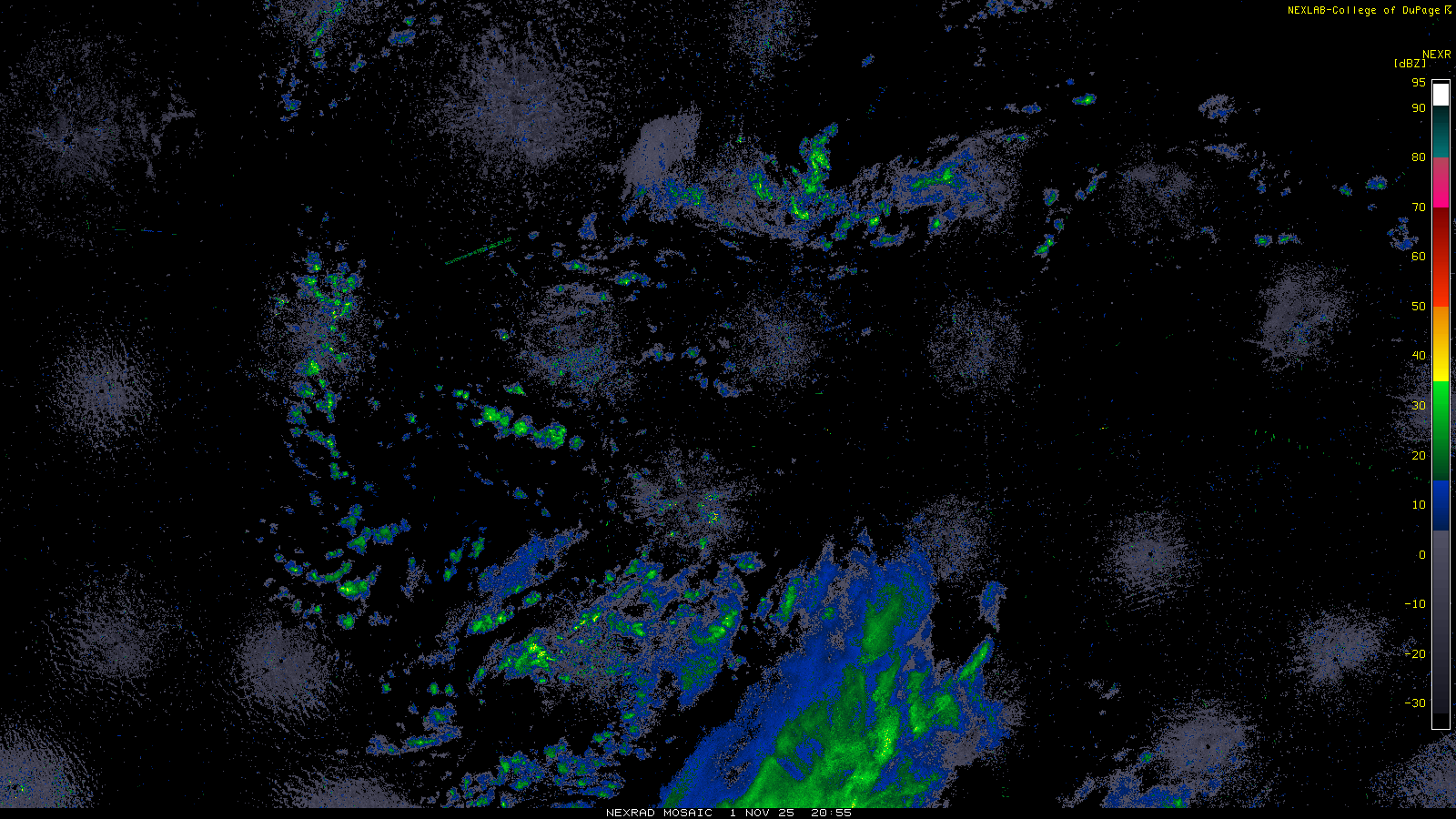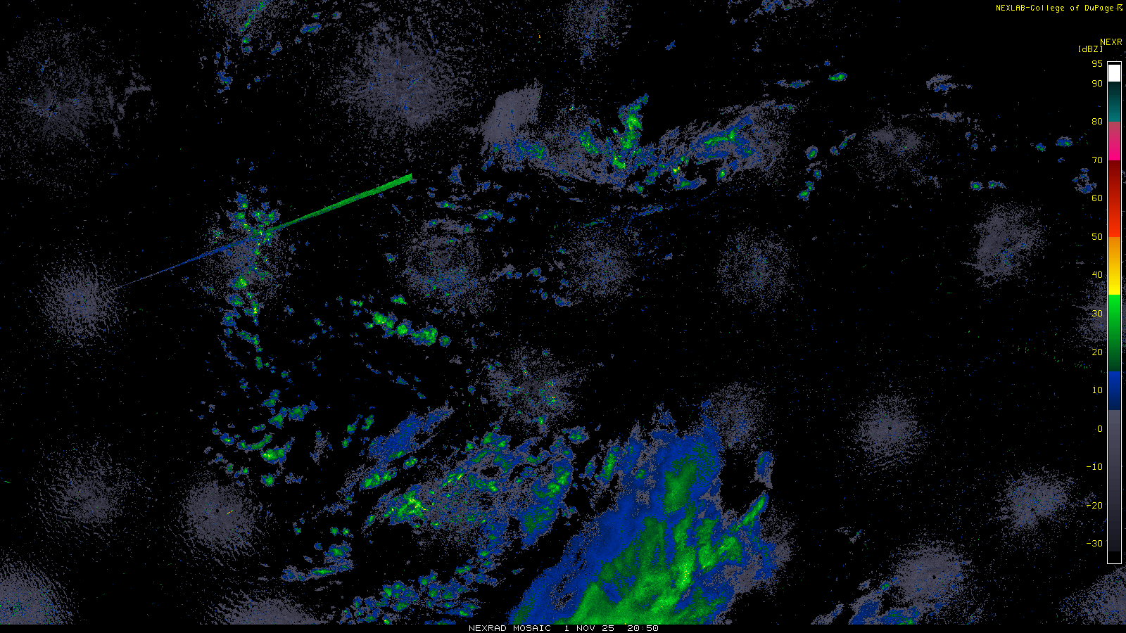 This imagery is a of composite stitch of NEXRAD base reflectivity data from individual sites across the domain of the satellite sector currently being viewed. For further details about the base reflectivity product, see the Product Description for any Base Reflectivity product on our NEXRAD page.