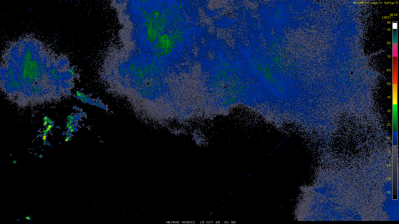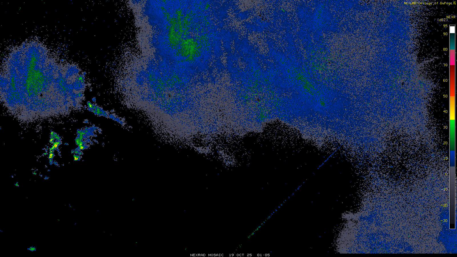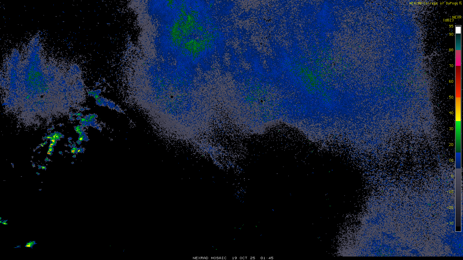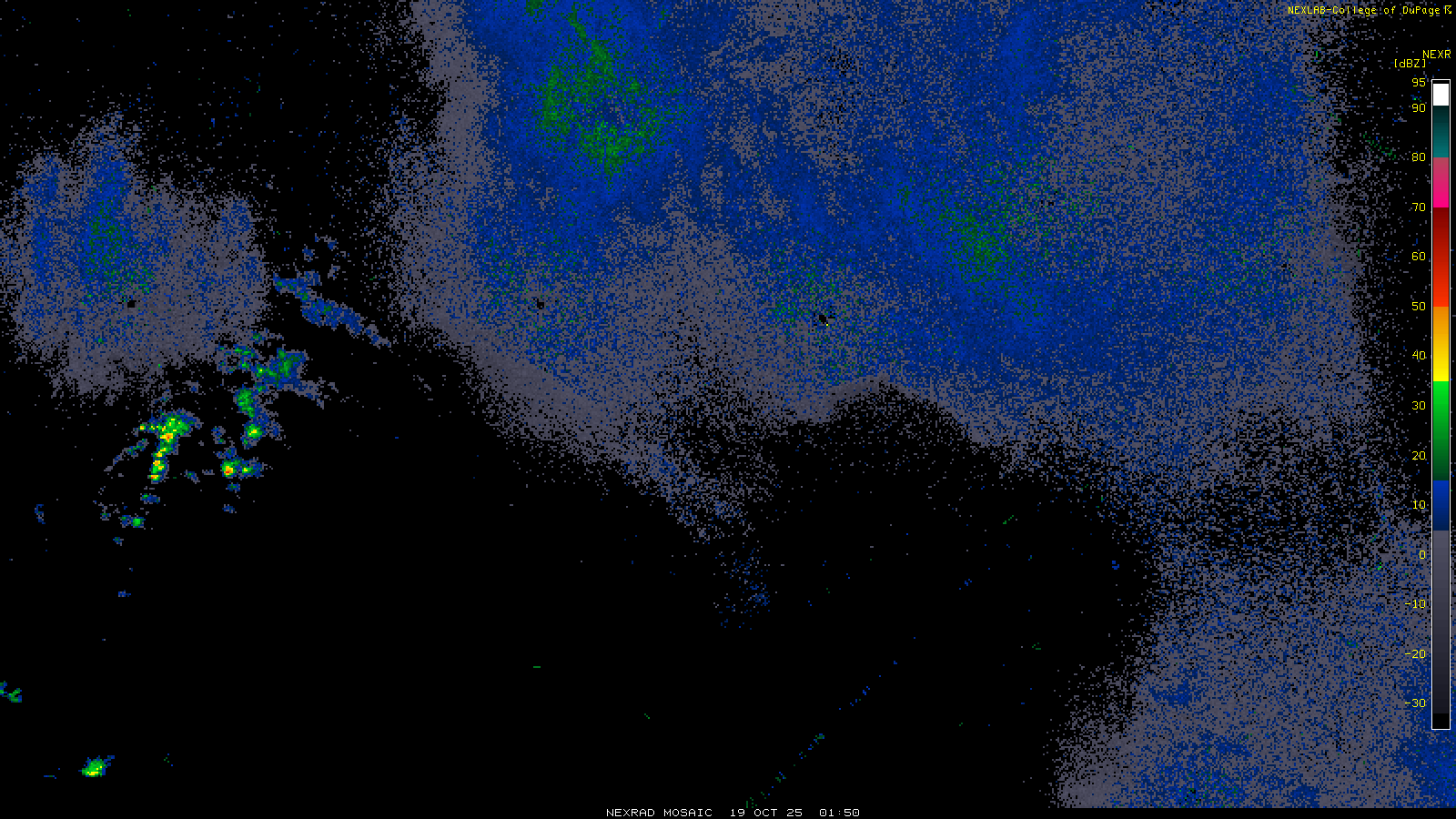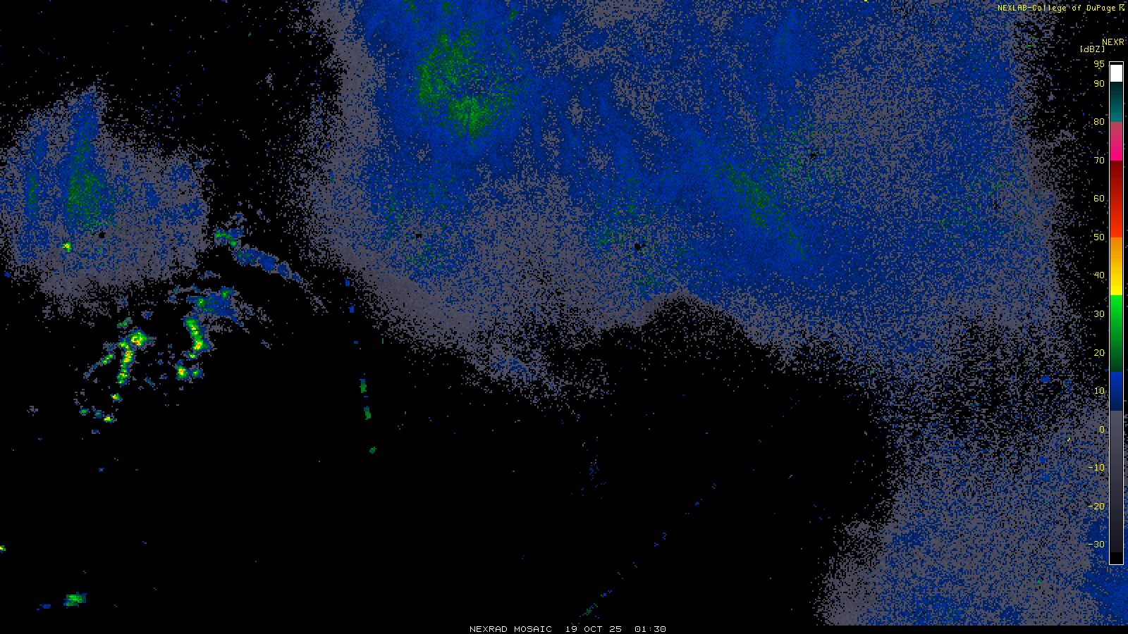 This imagery is a of composite stitch of NEXRAD base reflectivity data from individual sites across the domain of the satellite sector currently being viewed. For further details about the base reflectivity product, see the Product Description for any Base Reflectivity product on our NEXRAD page.