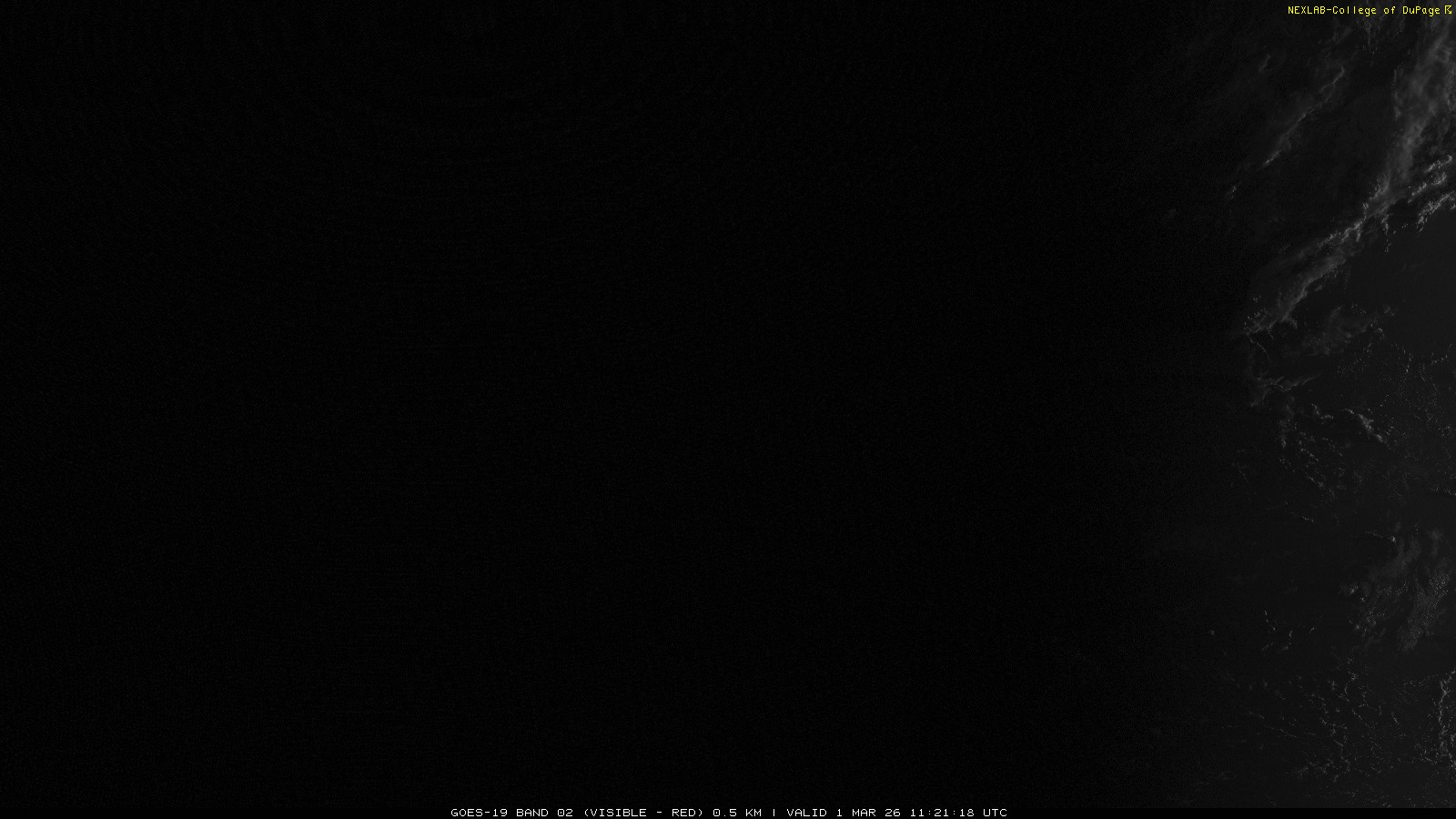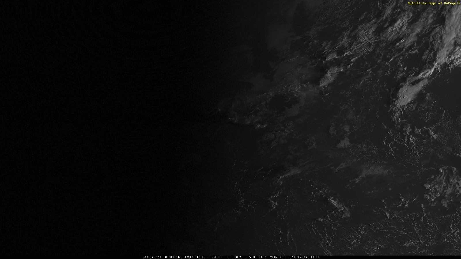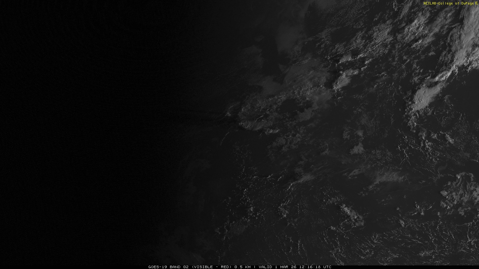 ABI Band 2 can effectively be thought of as the red channel of visible light seen by the satellite. Used on its own it is effective in identifying clouds in contrast to ground and large bodies of water. At 0.64 μm, it is effectively the same as the traditional 'Visible' channel we are familiar with from GOES-13 but with better optics onboard GOES-16 (GOES East), this product is now transmitted at a much higher spatial resolution. Additionally, because of improved transmission equipment and strategies, the temporal resolution is also improved. Briefly, this means the data now comes in more frequently with higher clarity.