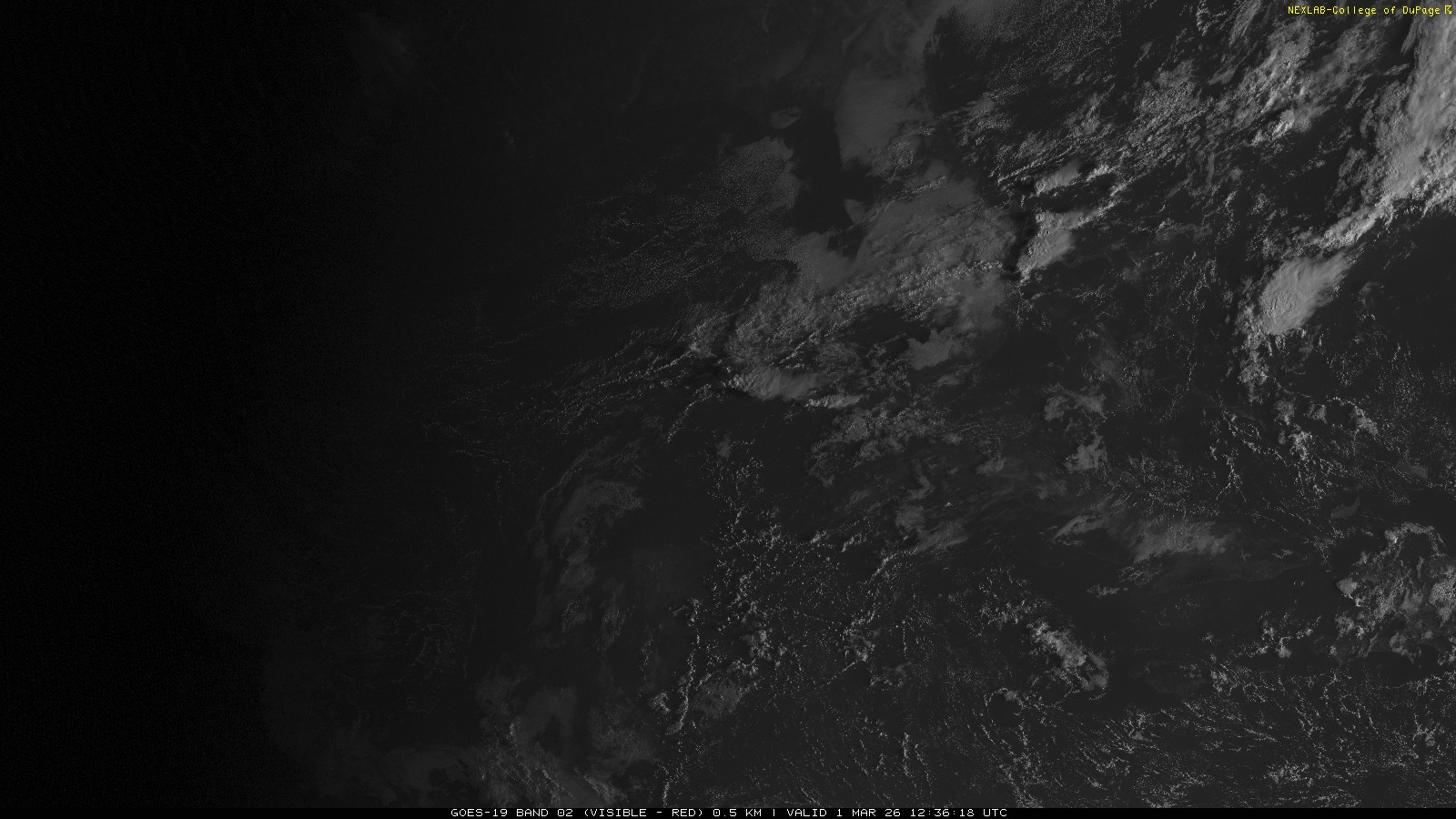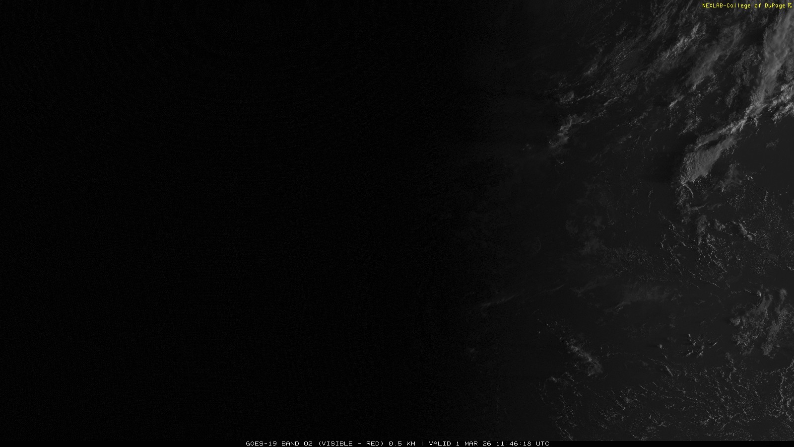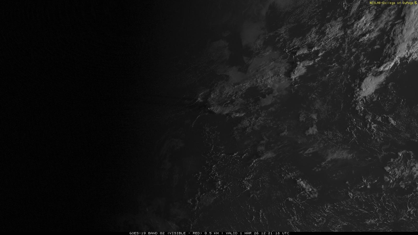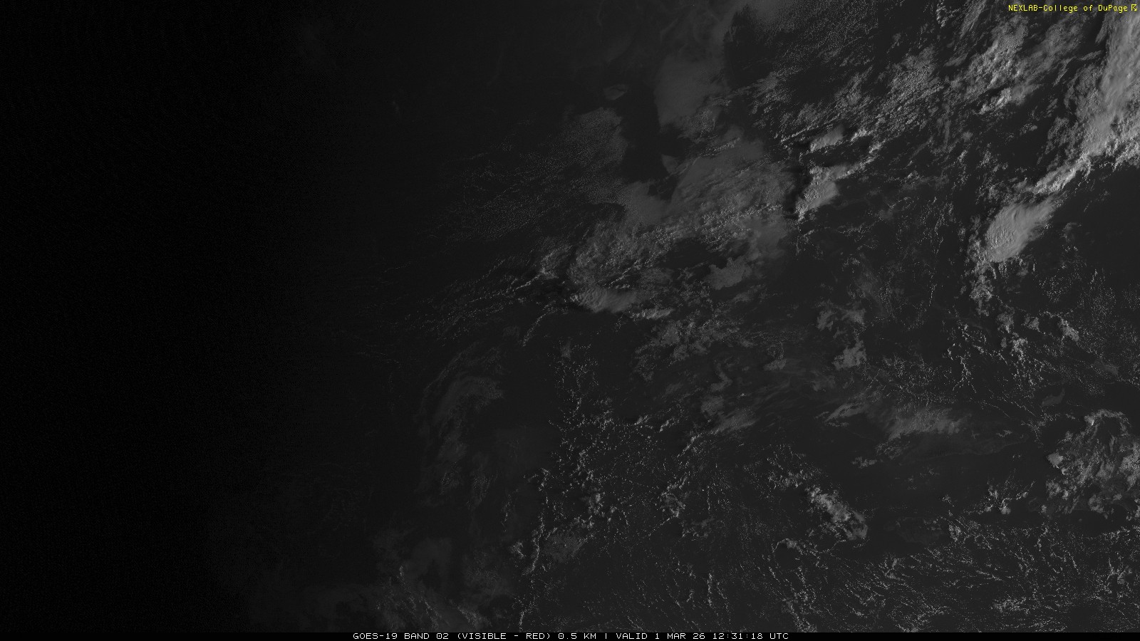ABI Band 2 can effectively be thought of as the red channel of visible light seen by the satellite. Used on its own it is effective in identifying clouds in contrast to ground and large bodies of water. At 0.64 μm, it is effectively the same as the traditional 'Visible' channel we are familiar with from GOES-13 but with better optics onboard GOES-16 (GOES East), this product is now transmitted at a much higher spatial resolution. Additionally, because of improved transmission equipment and strategies, the temporal resolution is also improved. Briefly, this means the data now comes in more frequently with higher clarity.