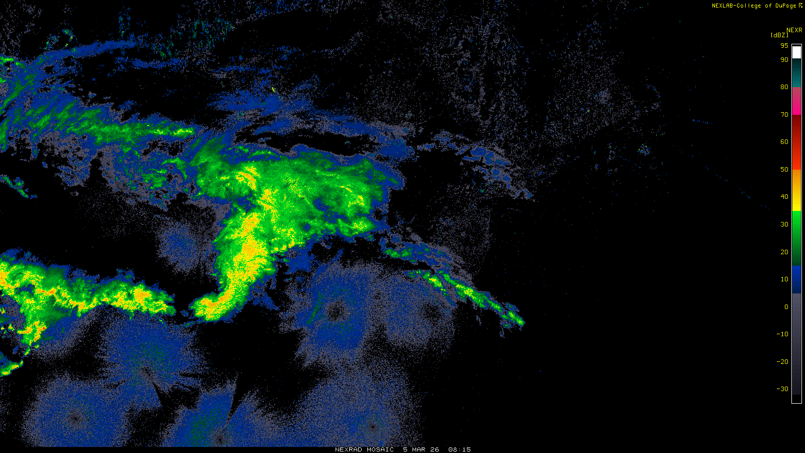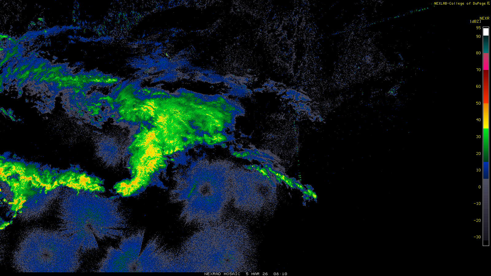 This imagery is a of composite stitch of NEXRAD base reflectivity data from individual sites across the domain of the satellite sector currently being viewed. For further details about the base reflectivity product, see the Product Description for any Base Reflectivity product on our NEXRAD page.