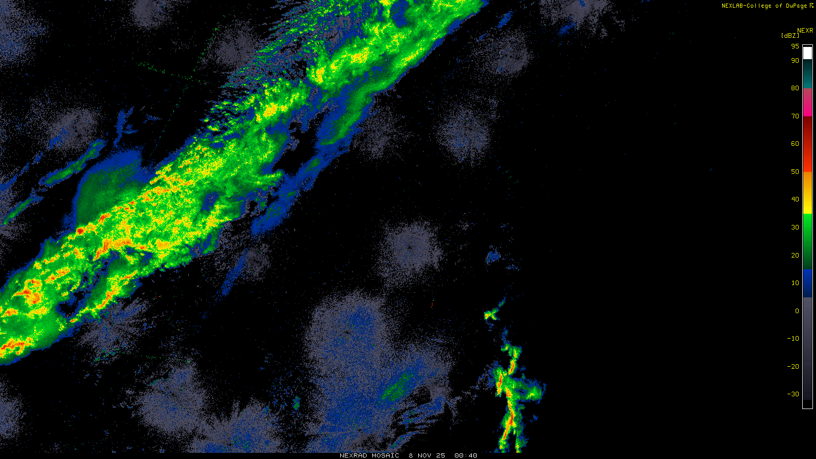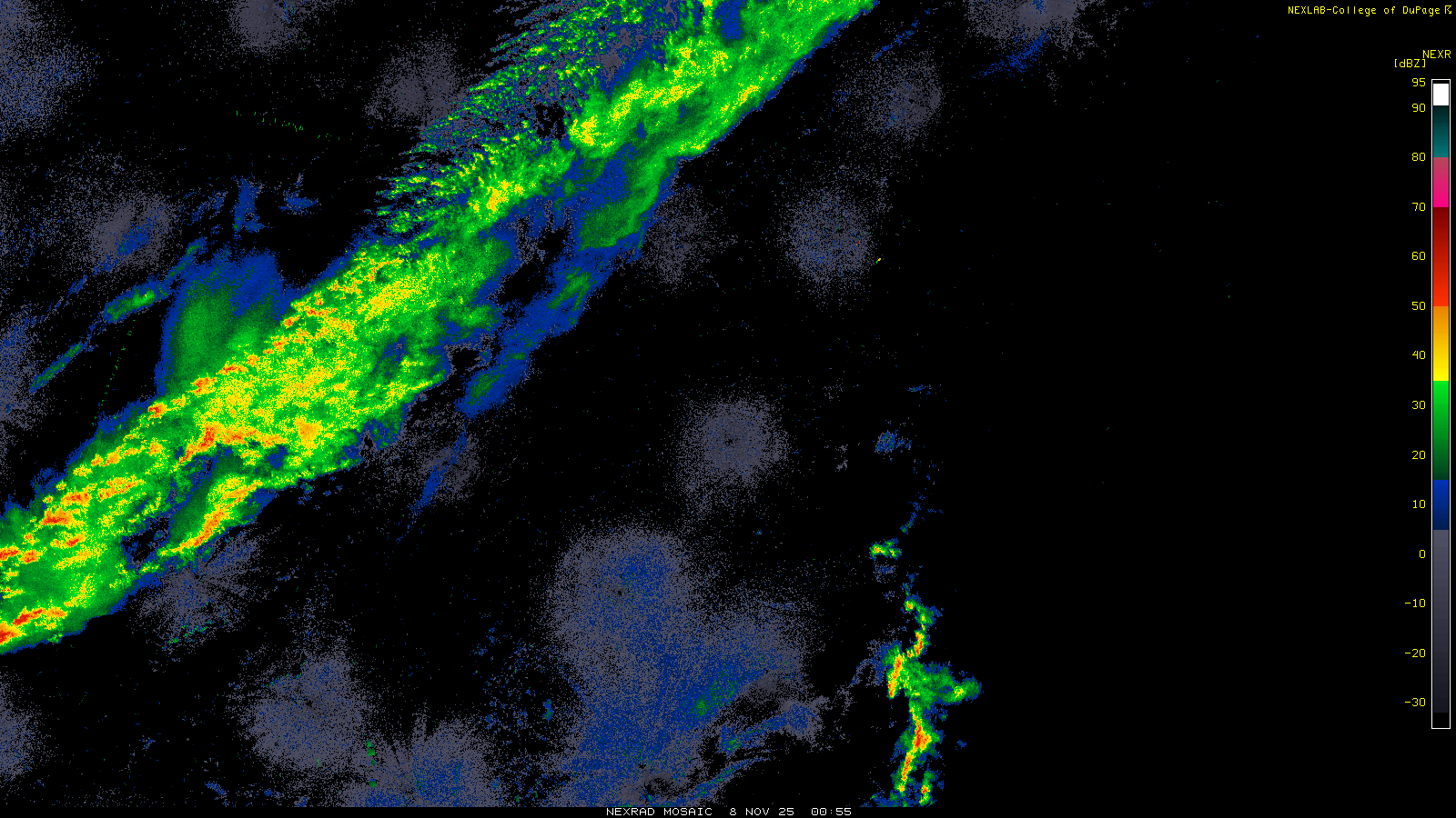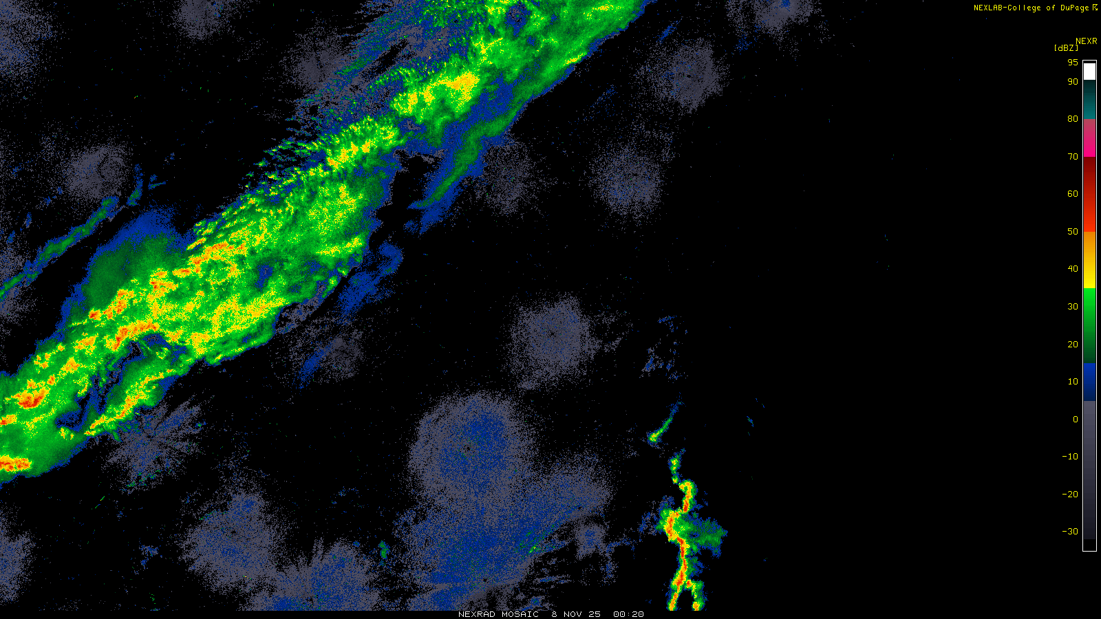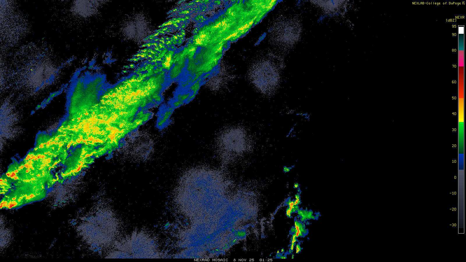 This imagery is a of composite stitch of NEXRAD base reflectivity data from individual sites across the domain of the satellite sector currently being viewed. For further details about the base reflectivity product, see the Product Description for any Base Reflectivity product on our NEXRAD page.