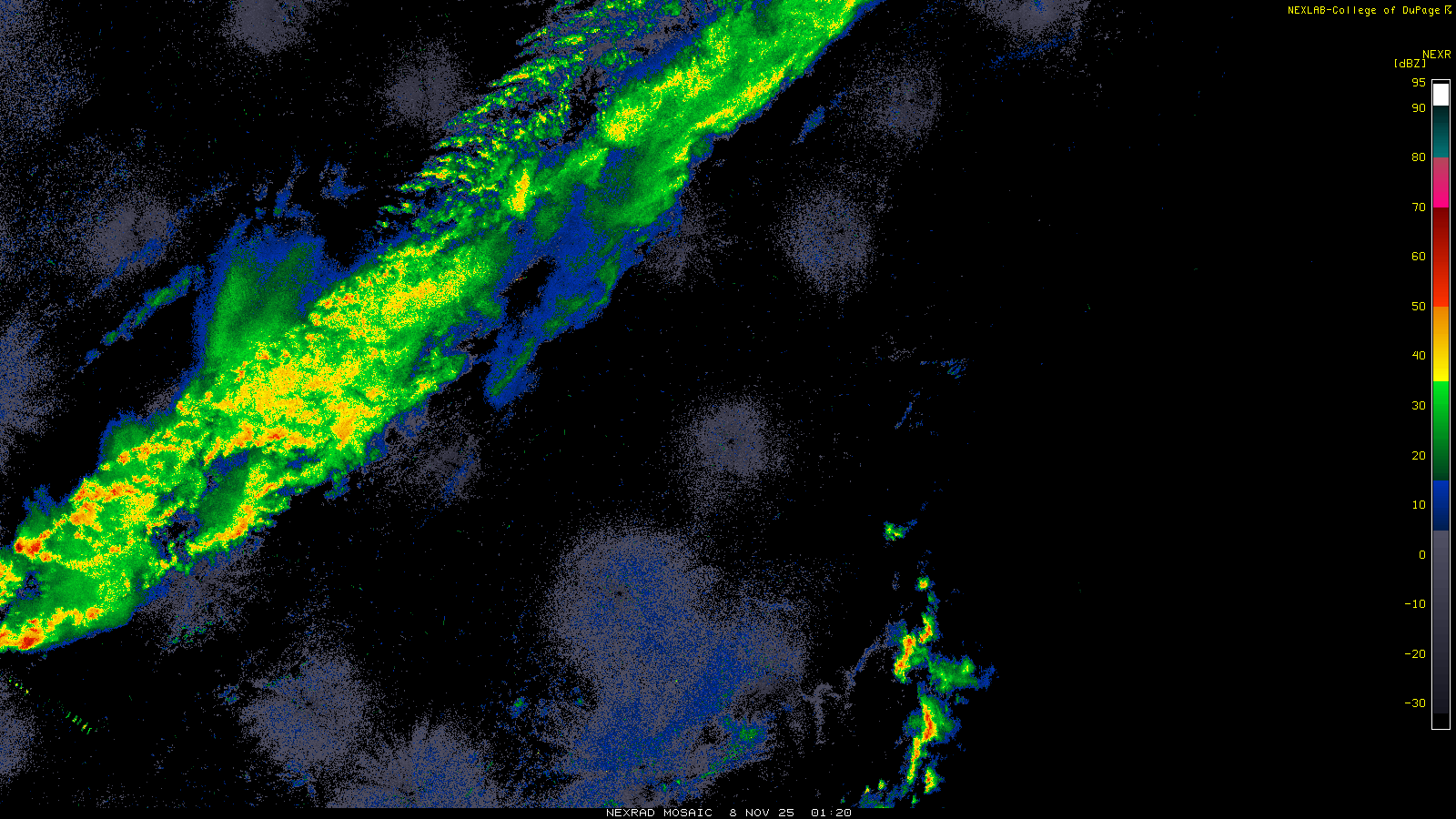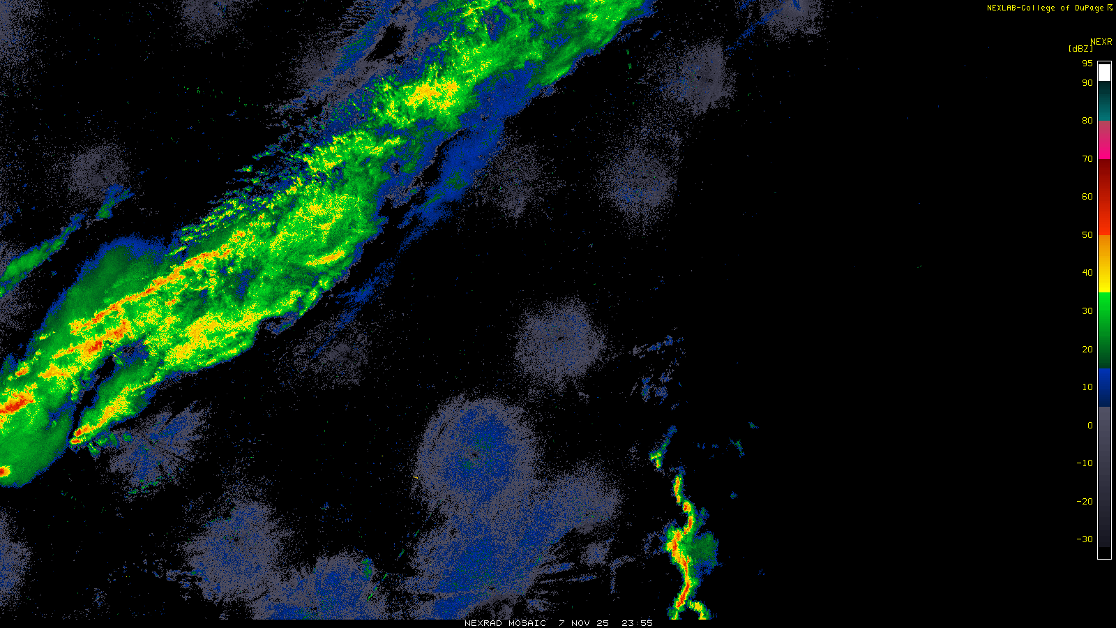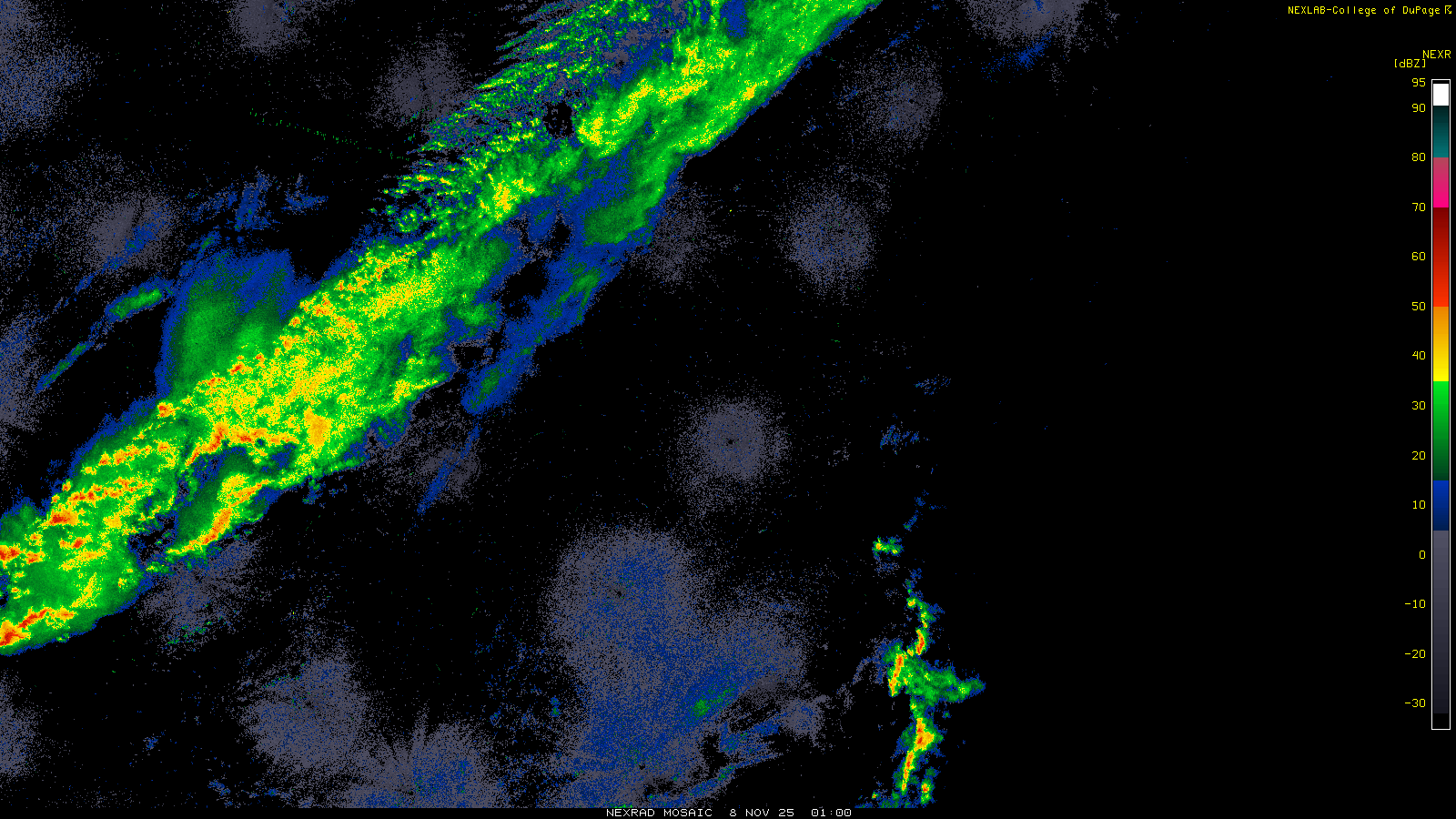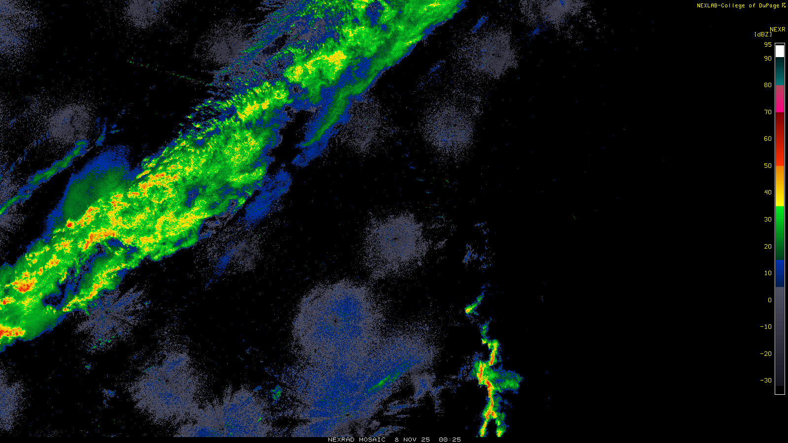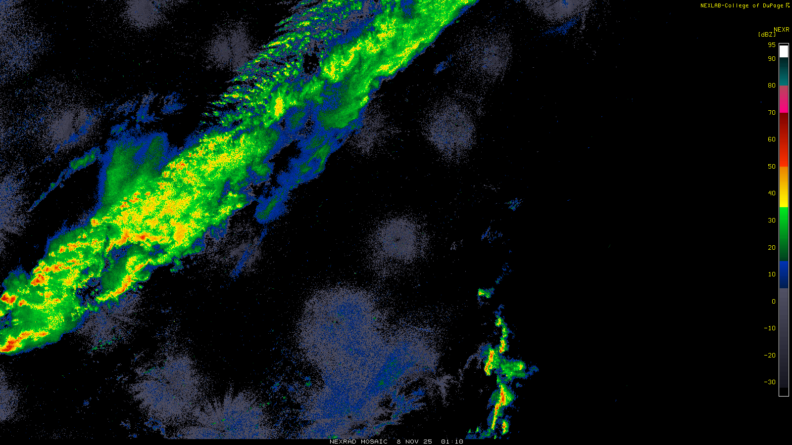 This imagery is a of composite stitch of NEXRAD base reflectivity data from individual sites across the domain of the satellite sector currently being viewed. For further details about the base reflectivity product, see the Product Description for any Base Reflectivity product on our NEXRAD page.